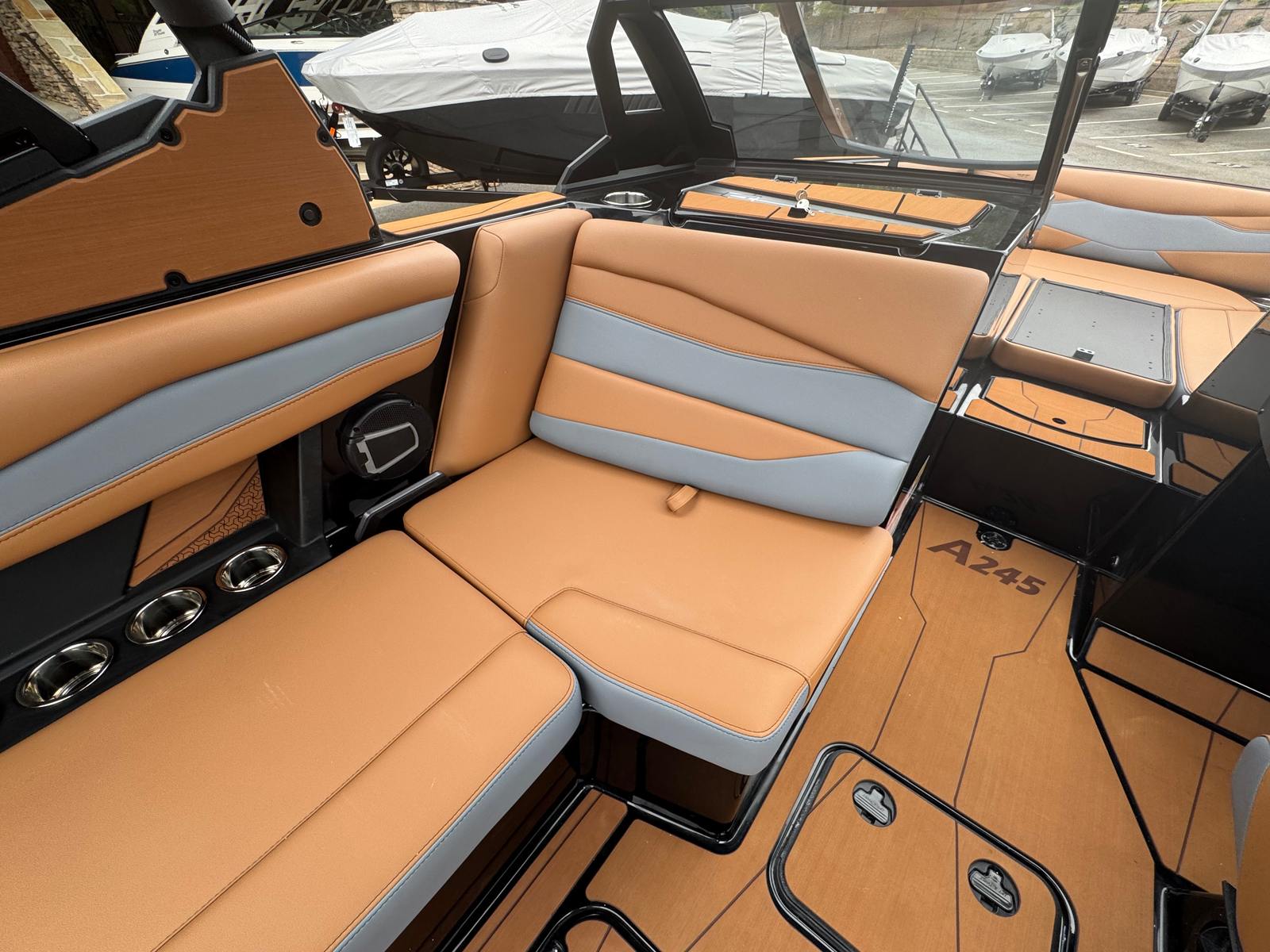 Owning the Axis A245 means unlocking a world of fun, adventure, and relaxation. This Ski & Wakeboard boat is built for socializing, with a spacious deck that accommodates friends and family comfortably. The upgraded interior offers plush seating and stylish finishes, creating a welcoming environment for lounging, sunbathing, or sharing stories after a thrilling ride. The advanced sound system, complete with a powerful subwoofer and remote control, sets the perfect soundtrack for your day, whether you’re celebrating with friends or unwinding with loved ones. The Axis Ice Box ensures your favorite drinks and snacks are always within reach, adding convenience to your aquatic adventures. With its striking ebony accents and modern design, the Axis A245 is as much a statement piece as it is a high-performance vessel.