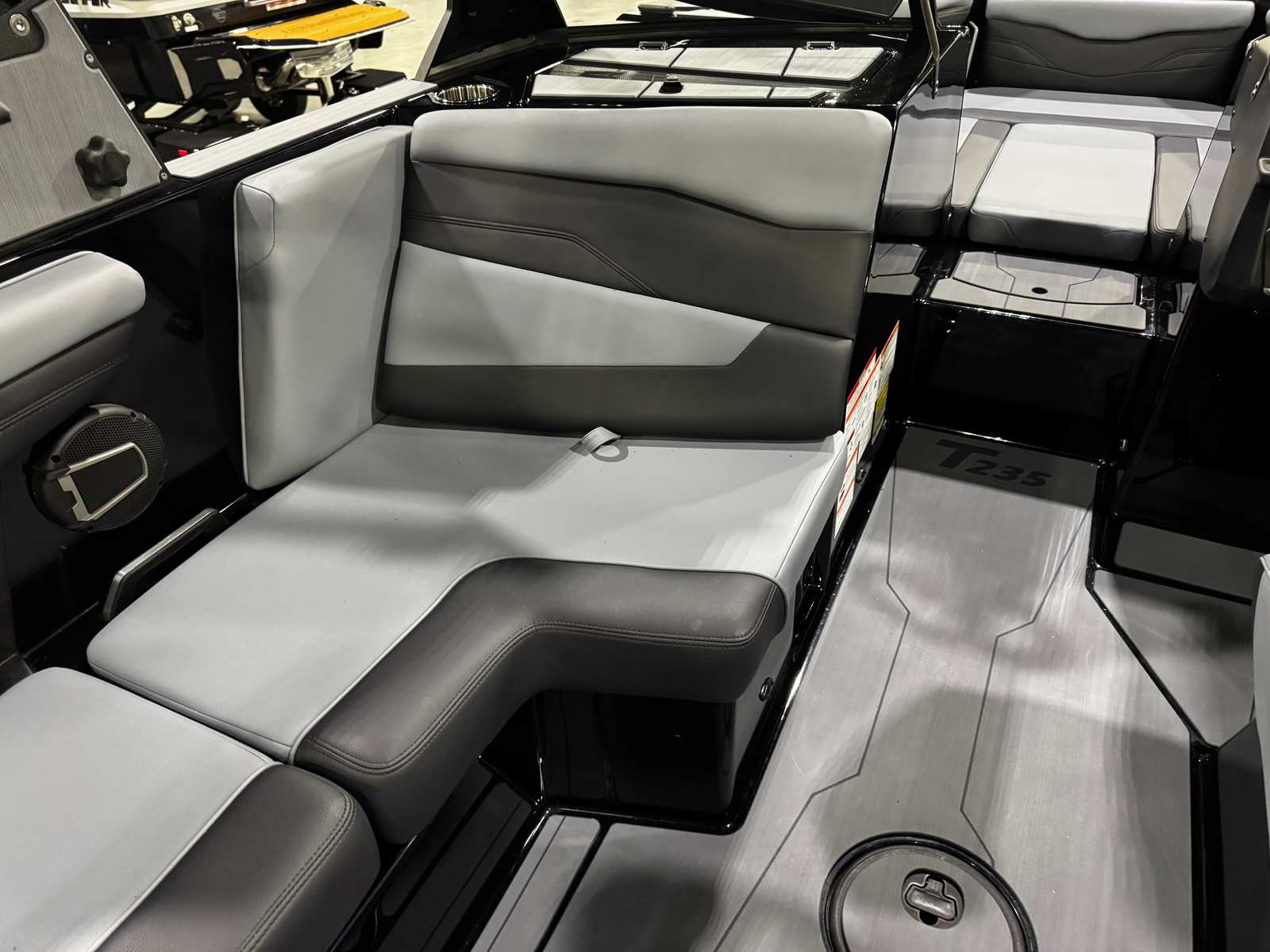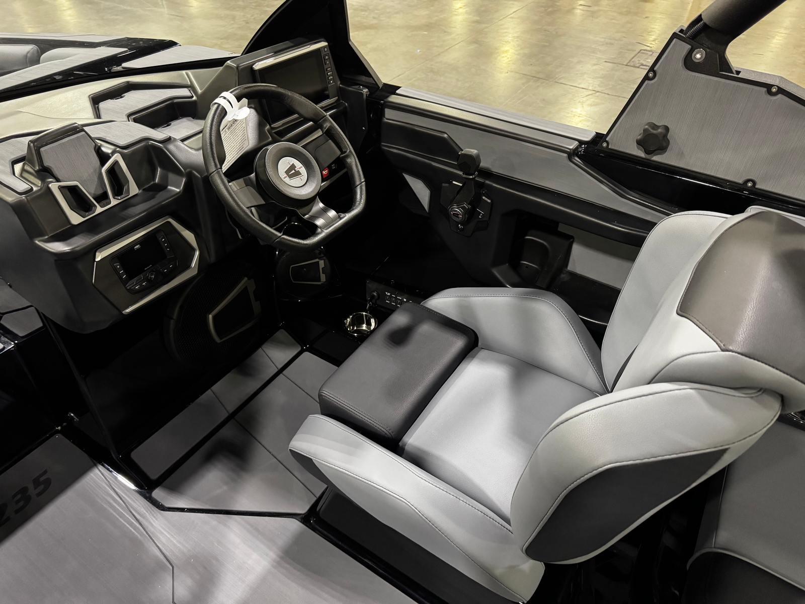 The Axis T235 is loaded with innovative features and thoughtful details that elevate your time on the water. The ski pylon is perfect for towing skiers and wakeboarders, while the Deck Trac nonskid complete deck kit ensures safe and confident movement around the boat. Protect your investment with the CS Boat Cover featuring APS 2 and a dedicated swimboard cover, keeping your boat looking pristine between adventures.Stay informed and in control with the integrated depth finder, and enjoy precision speed management with the Zero Off GPS Cruise and Compass system—ideal for maintaining perfect speeds for every rider. Stainless cup holders add a touch of luxury and durability, while the Ballast HI FLO PNP Plumbing with Auto Vent allows for quick and efficient ballast adjustments to customize your wake. Three pairs of pull-up cleats provide secure and convenient docking options.Surf enthusiasts will love the Surf Gate with Axis Surfband, offering on-the-fly wave customization for the ultimate surf experience. The ChillAX Cockpit Flip Up Seats provide versatile seating arrangements, maximizing comfort and social interaction for everyone onboard.