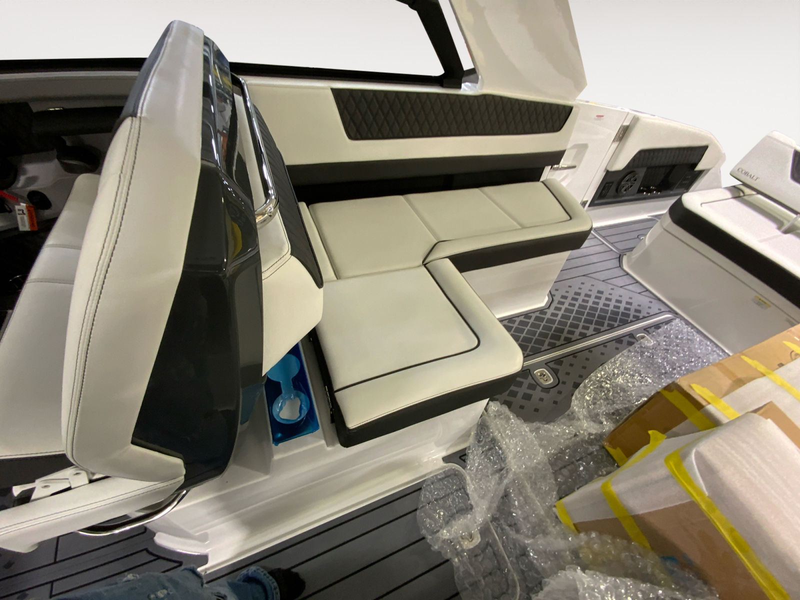 This Cobalt R35 Surf is loaded with special features designed to enhance your boating experience. The white arch with hardtop and electric awning provides shade and protection from the elements, allowing you to enjoy the outdoors in comfort. The air conditioning and heating system (110V) ensures a pleasant environment in any weather, while the air compressor with holder adds convenience for inflating water toys or equipment.The cockpit galley is equipped with a sink, grill, and microwave, making it easy to prepare snacks and meals on the go. Board rack covers and PTM (Performance Tower Mount) keep your gear organized and secure, while the cockpit boarding door and bow center cushion insert offer added comfort and accessibility. The bow tonneau cover in Capt/Navy protects your seating area when not in use, preserving the boat’s pristine condition.