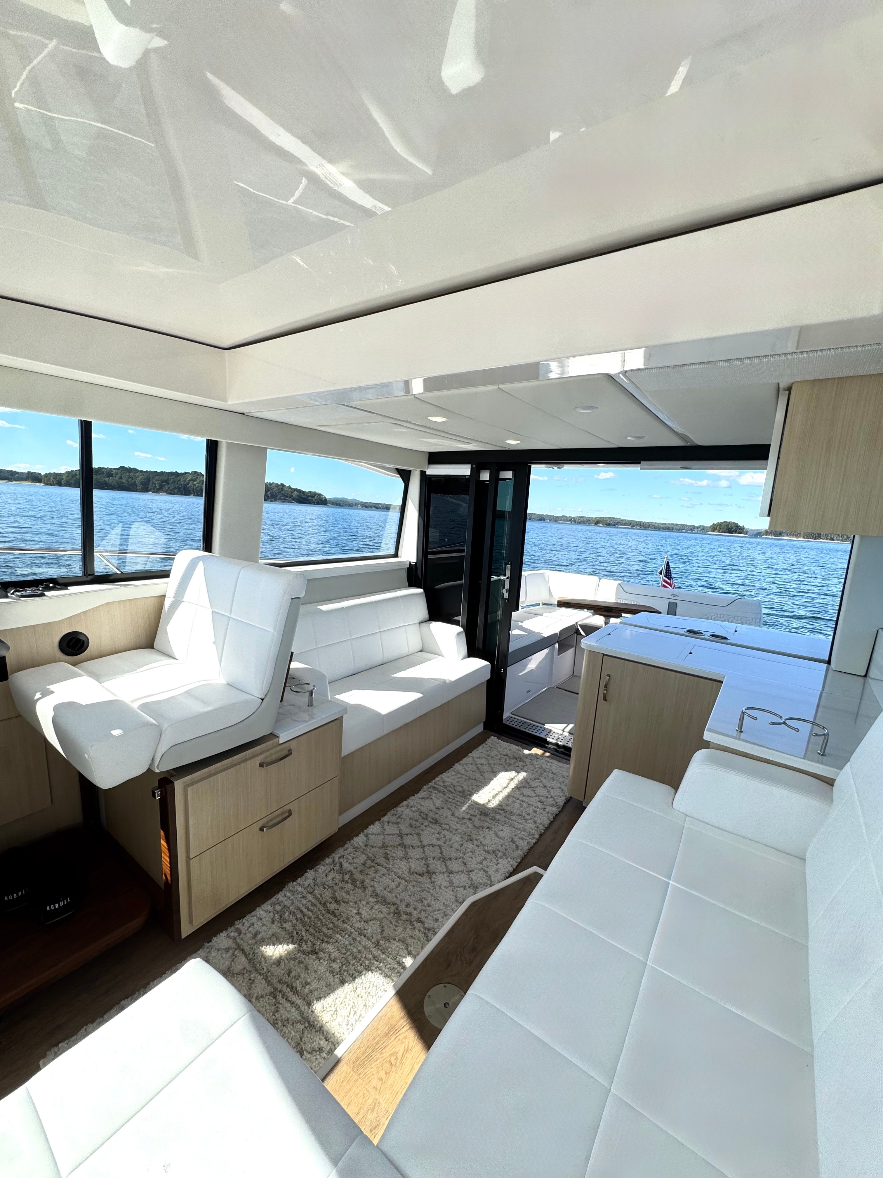 With the push of a button, lower the large window and slide open the enclosure doors to effortlessly connect the cockpit with the salon, creating a seamless transition between indoor and outdoor living spaces.