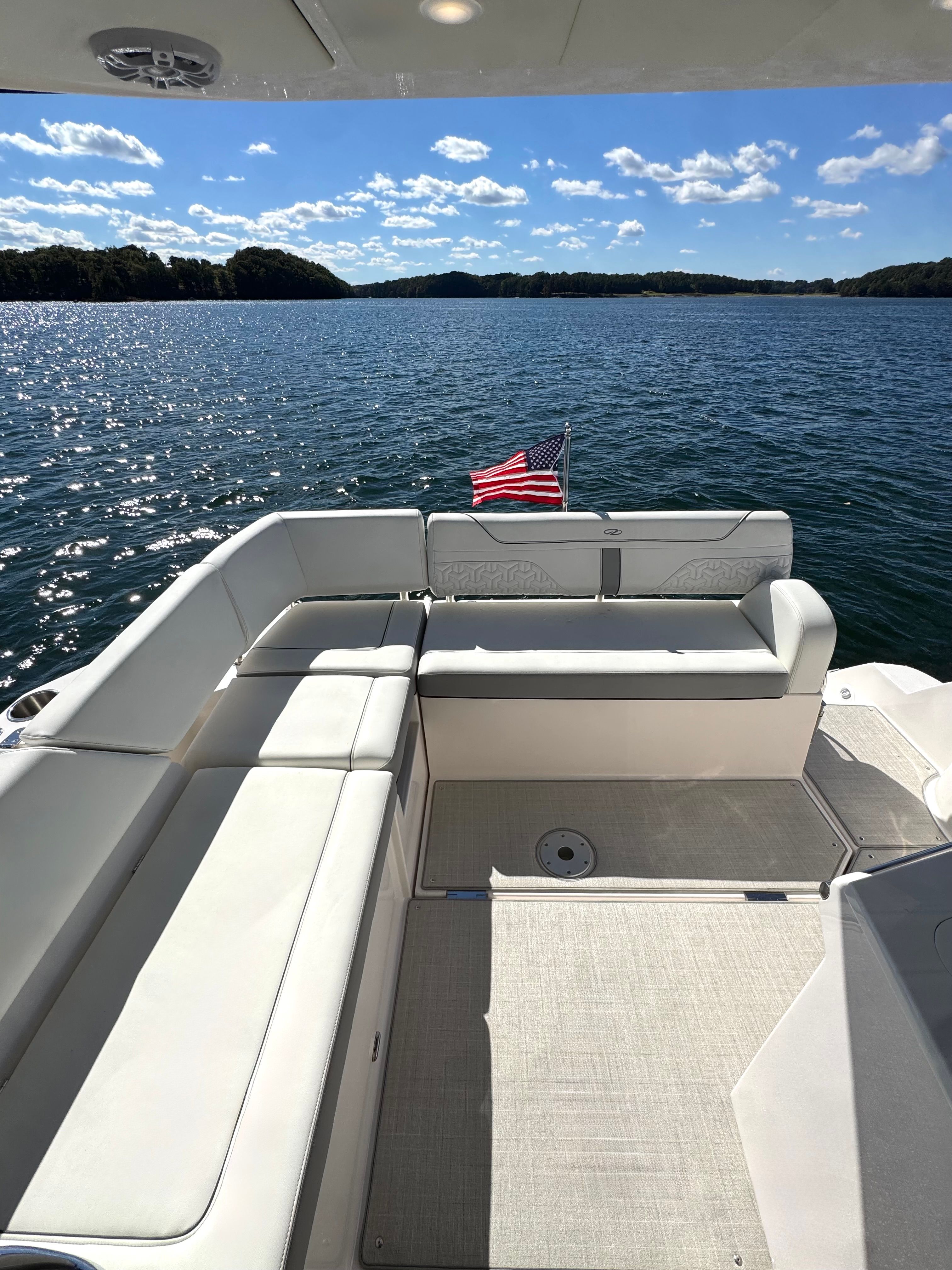 The vinyl-wrapped helm with hand-stitched accents exudes true luxury, while the dual 16” Garmin displays, joystick, and autopilot enhance the boating experience, ensuring ease of control and precision.