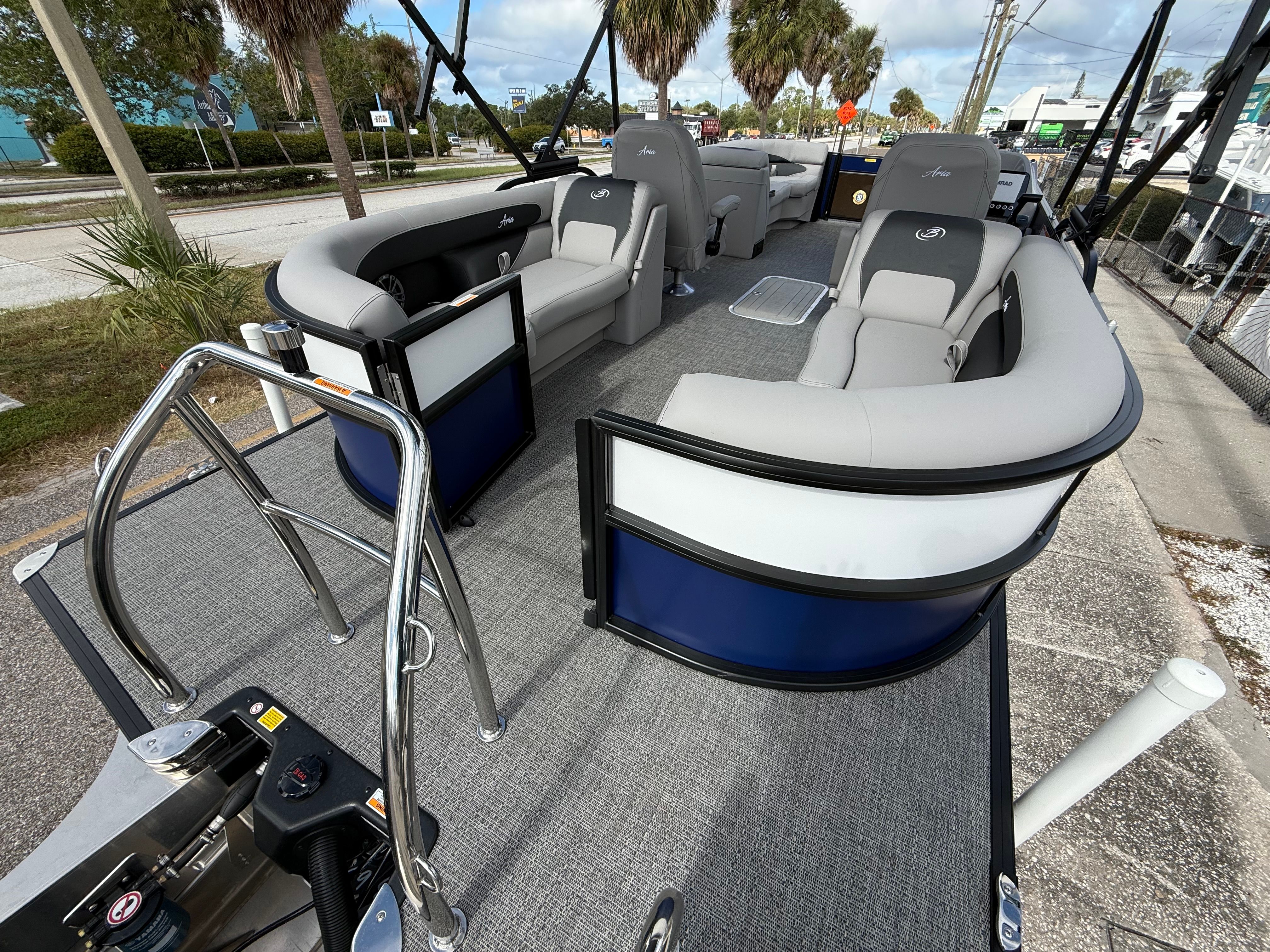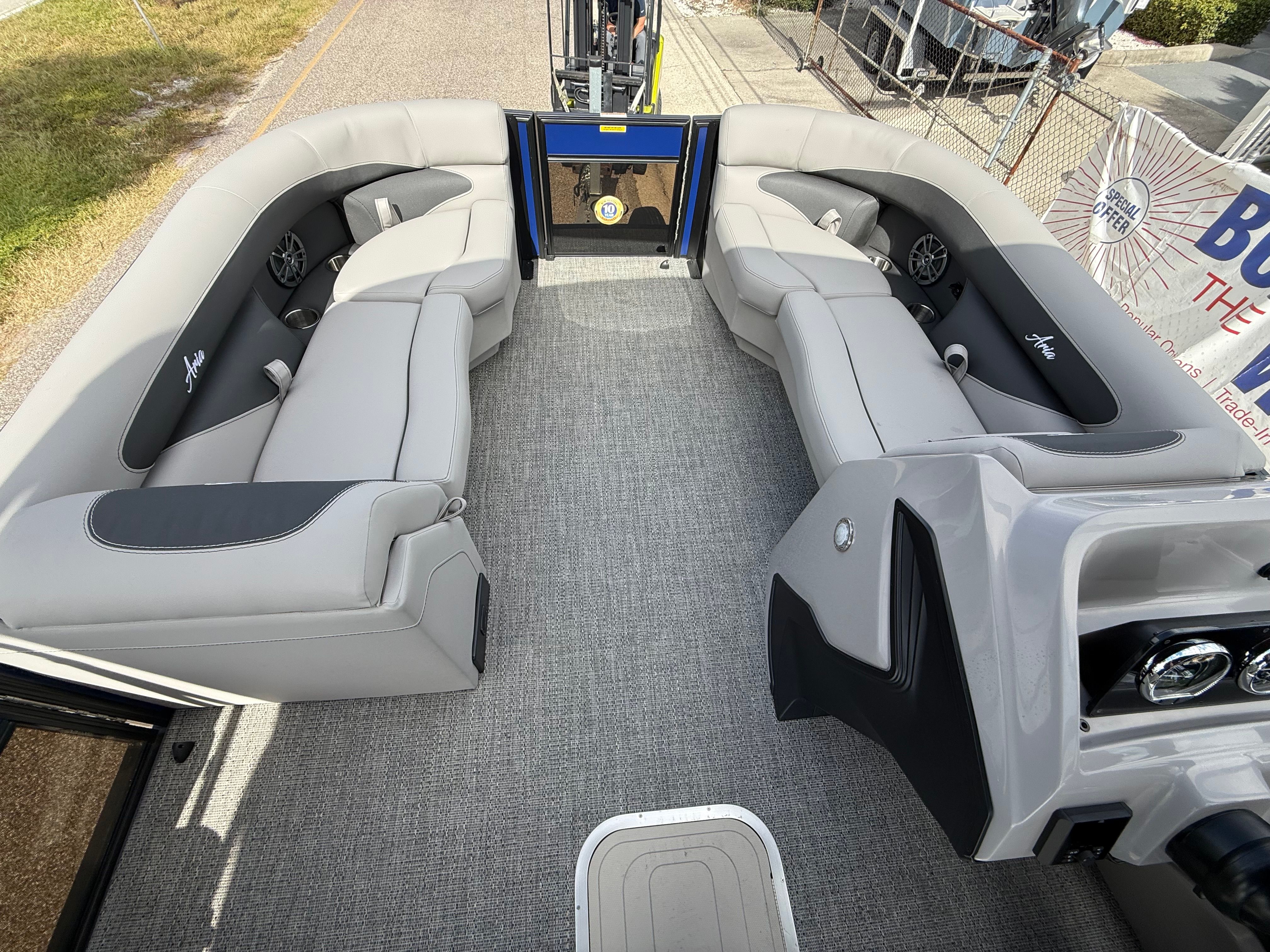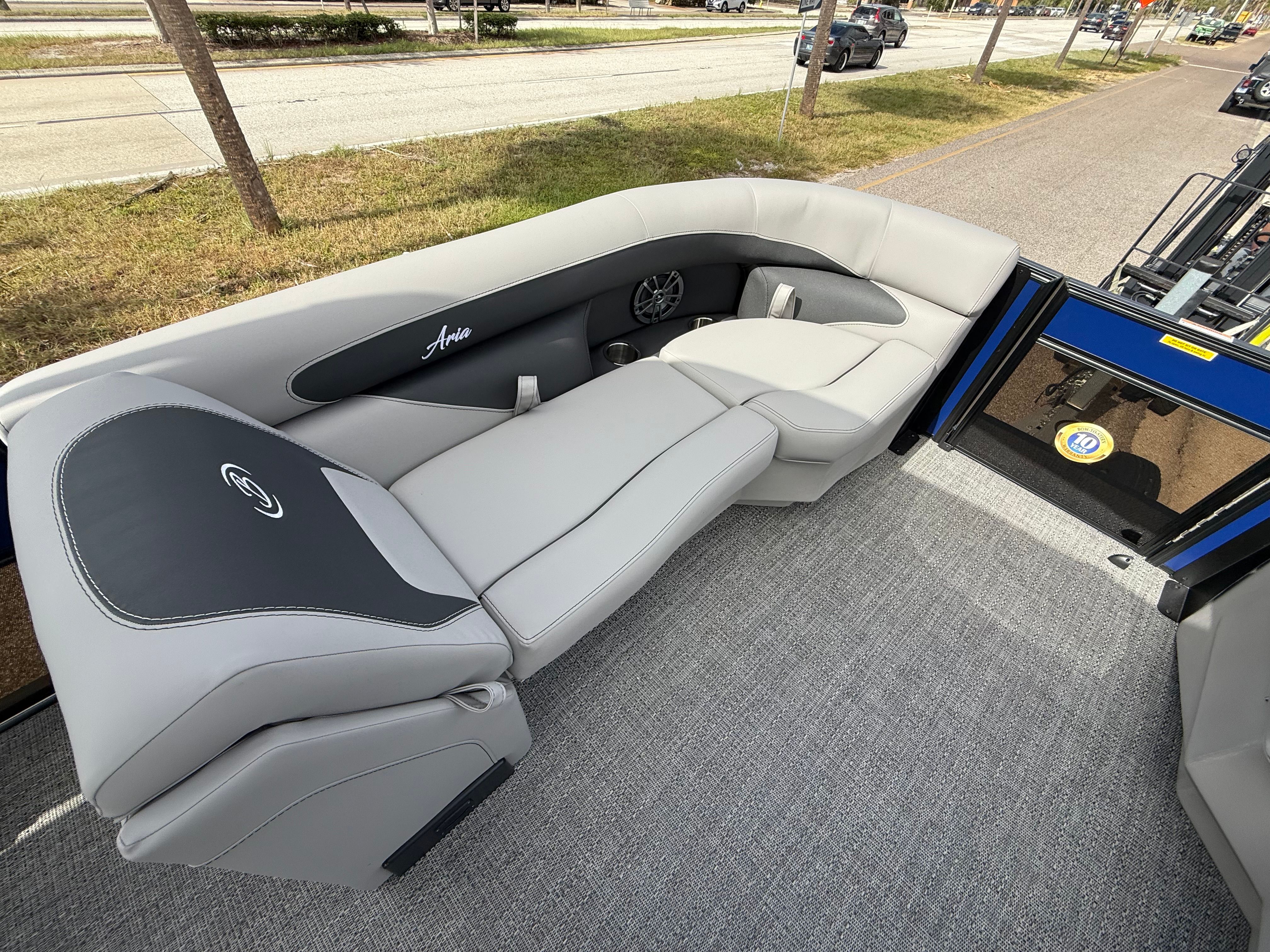 The Barletta Aria A22QC-Platinum is packed with features that elevate your boating experience. The Railskin Color Aria in Bohemian Blue, complemented by the Railskin Accent Aria in Winter White, creates a striking visual appeal that is sure to impress. The Blackout Package Aria adds a touch of sophistication, giving the boat a sleek and modern look. Inside, the Tempest Gray furniture offers both comfort and style, providing plush seating for all passengers. The Amore Gray flooring is not only visually appealing but also easy to clean and maintain, ensuring your pontoon always looks its best.As part of the Coastal Edition Aria, this pontoon is designed to withstand the elements, making it suitable for a variety of water environments. The Triple Toon Package Aria enhances the boat’s stability and performance, allowing for smoother rides and better handling. Every detail, from the railskin accents to the flooring and furniture, has been carefully selected to create a cohesive and inviting atmosphere on board.