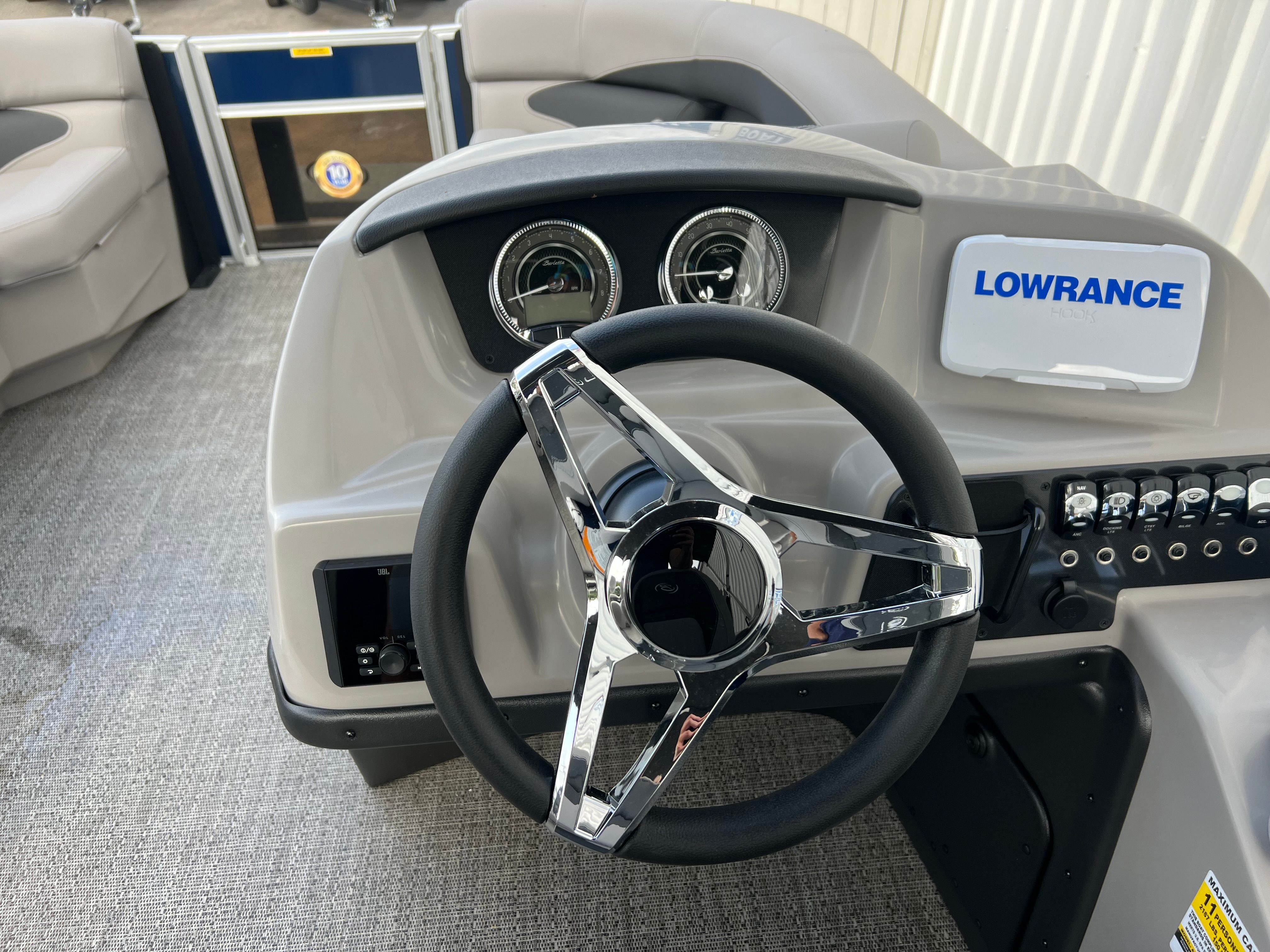 The Barletta Aria A20QC is packed with special features that set it apart from other pontoon boats for sale. At the helm, you’ll find the advanced Hook 5 GPS system, providing accurate navigation and peace of mind as you explore new destinations. The Triple Toon Package Aria enhances stability and performance, allowing for smoother rides and improved handling in various water conditions.Aesthetically, the Railskin Color Aria in Blue Sapphire gives the boat a striking, modern look, while the Amore Gray flooring adds a touch of elegance and comfort underfoot. The furniture, finished in Tempest Gray, is designed for both style and relaxation, offering plush seating and ample space for guests. Every detail, from the rigged engine with stainless steel prop to the Mercury mechanical pre-rigging, reflects Barletta’s dedication to quality and innovation.