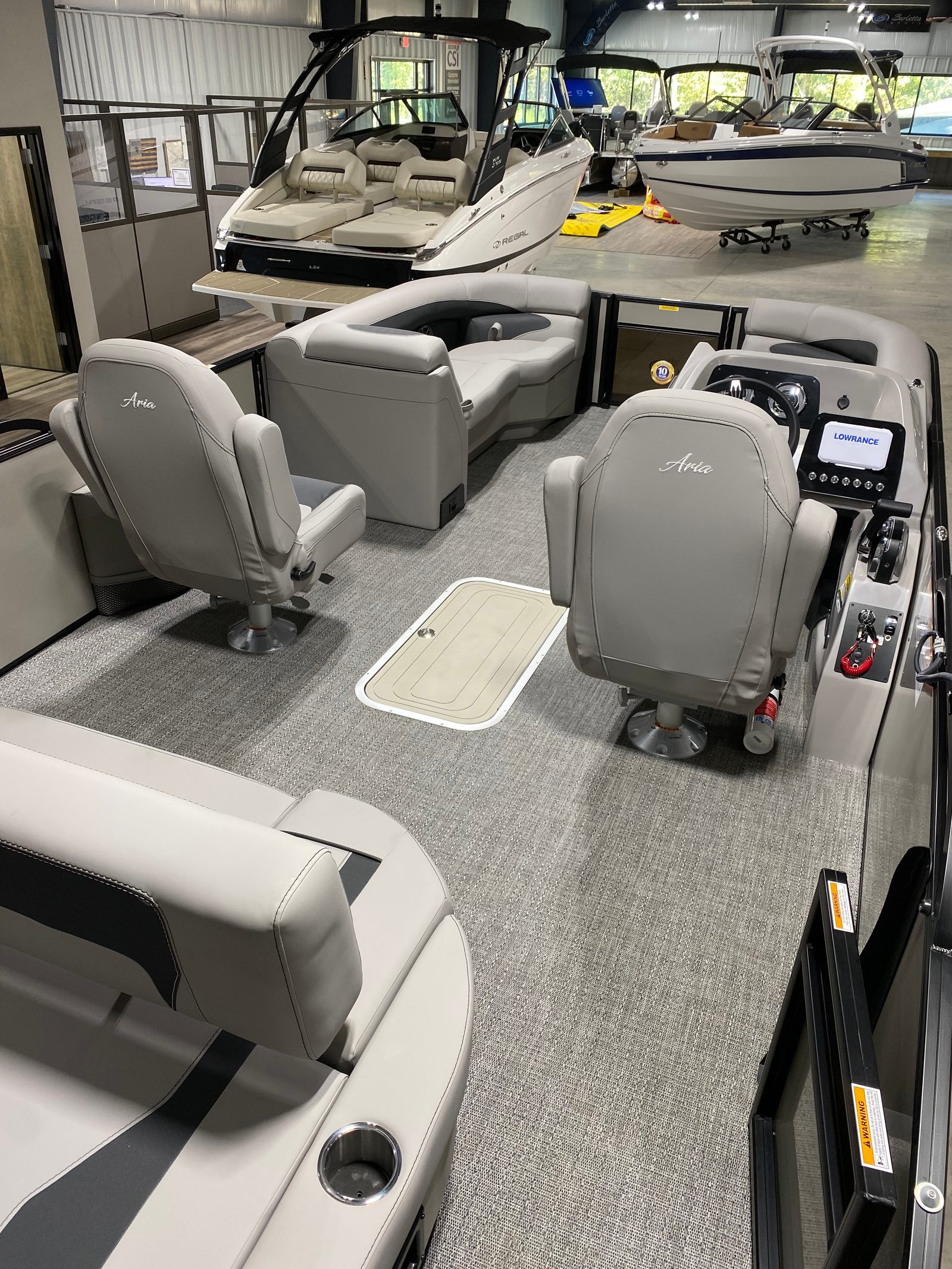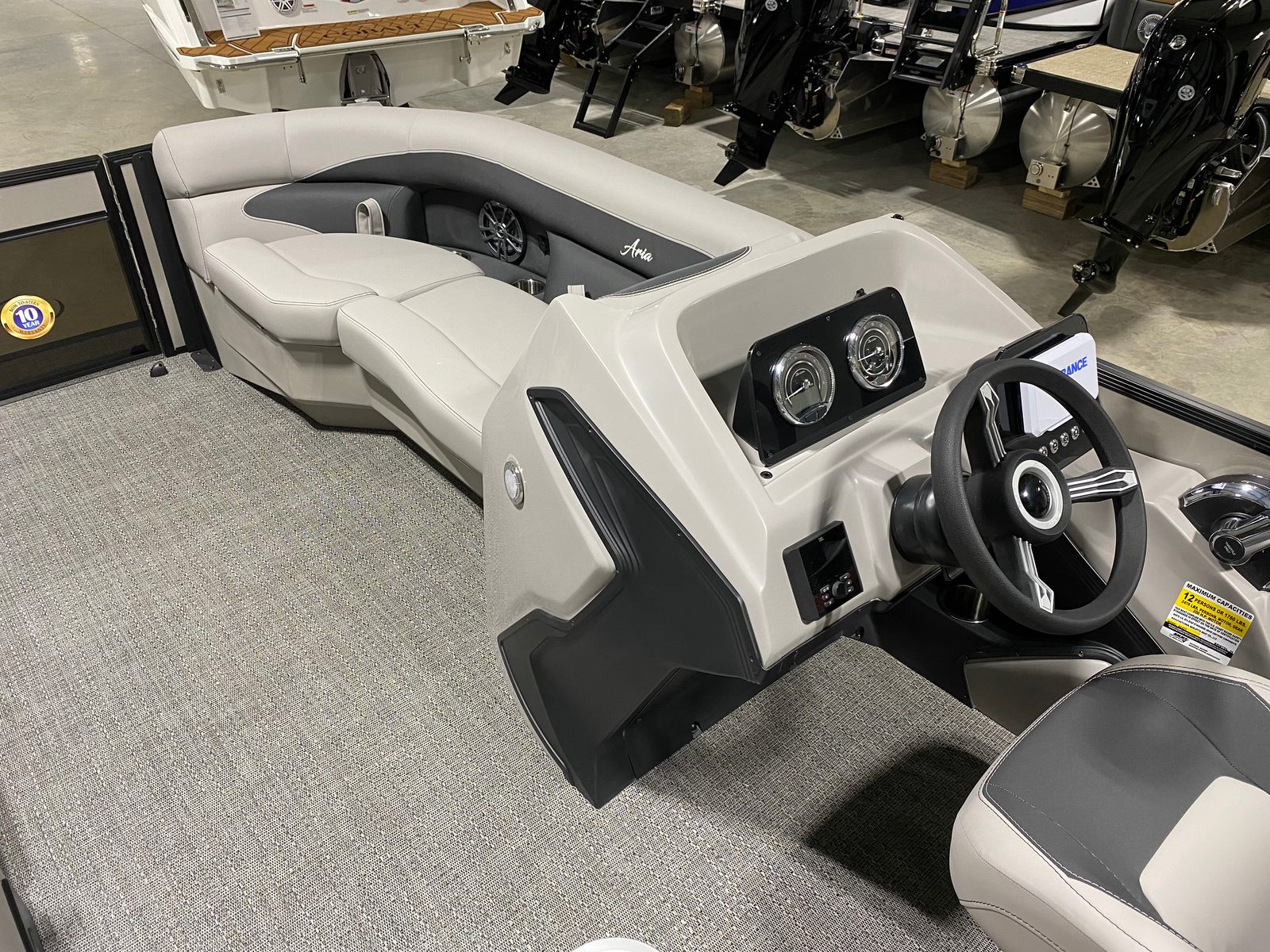 The Barletta Aria A22UC-Platinum is packed with features designed to elevate your time on the water. The Champagne Railskin color and Blackout Package Aria create a striking visual impression, while the Tempest Gray furniture provides plush, comfortable seating for you and your guests. The Amore Gray flooring is not only stylish but also durable and easy to maintain, ensuring your pontoon boat looks great season after season.One of the standout features of this model is the In Floor Midship Storage, offering ample space to stow away gear, water toys, and personal belongings. This thoughtful addition keeps the deck clutter-free and maximizes usable space for relaxation and entertainment. The Eagle 5 GPS system provides advanced navigation capabilities, helping you explore new waters with confidence and ease.The Triple Toon Package Aria enhances the boat’s stability and ride quality, making it perfect for both leisurely cruises and more spirited outings. The Drop Ship Engine - NO PROP configuration allows for customization and ensures you get the exact performance you desire.