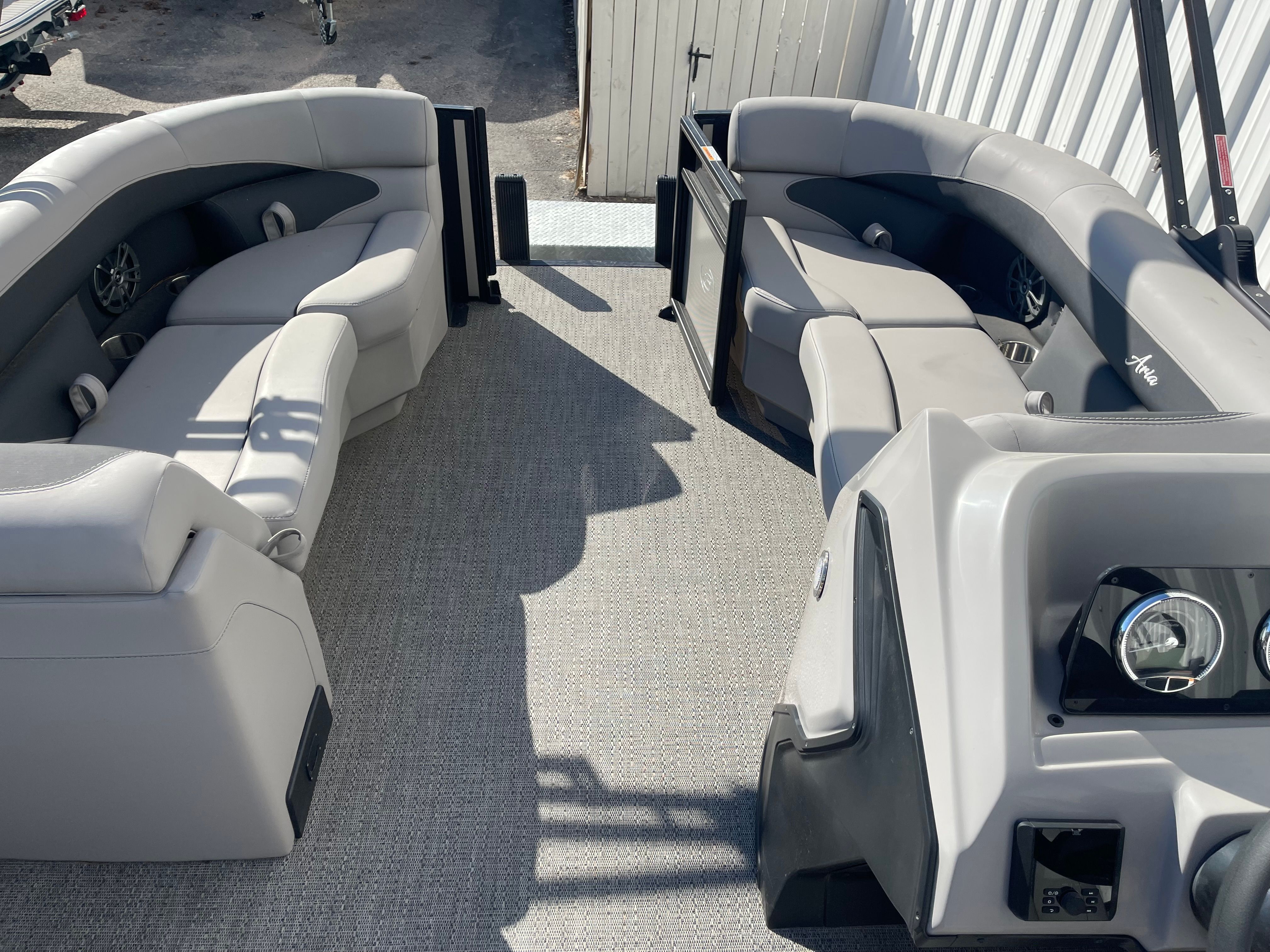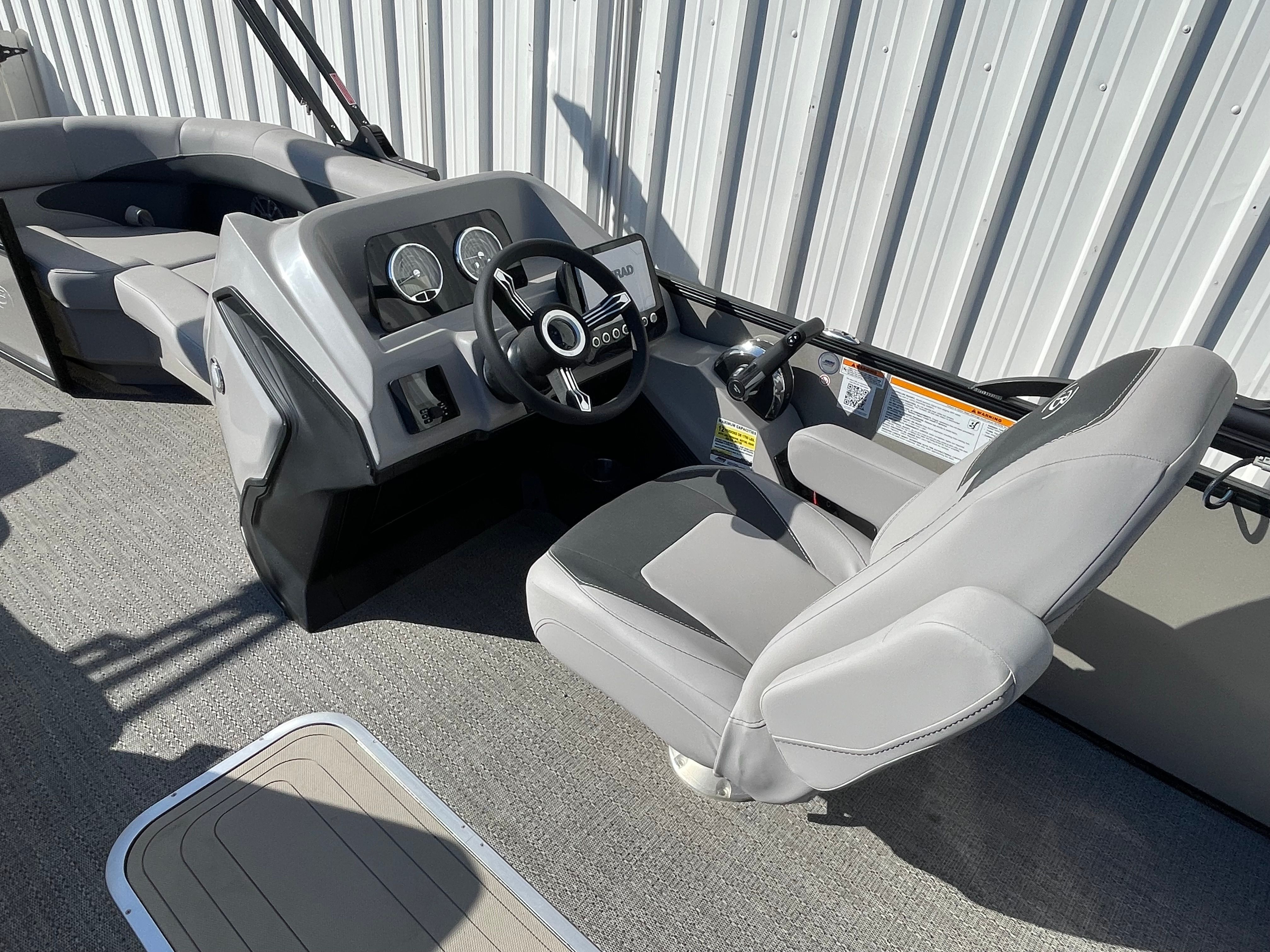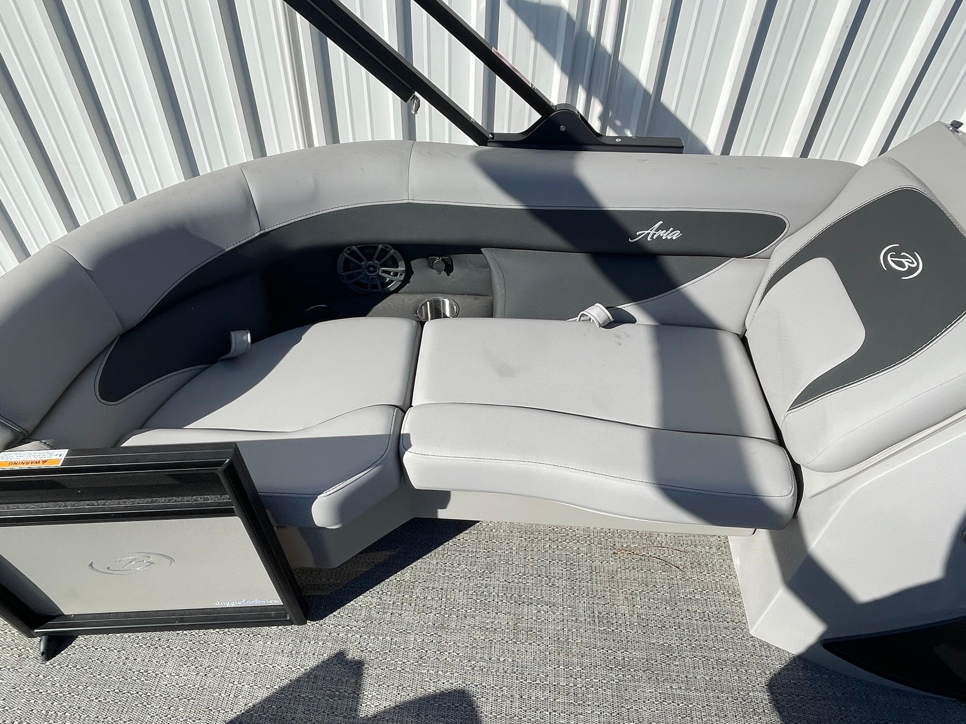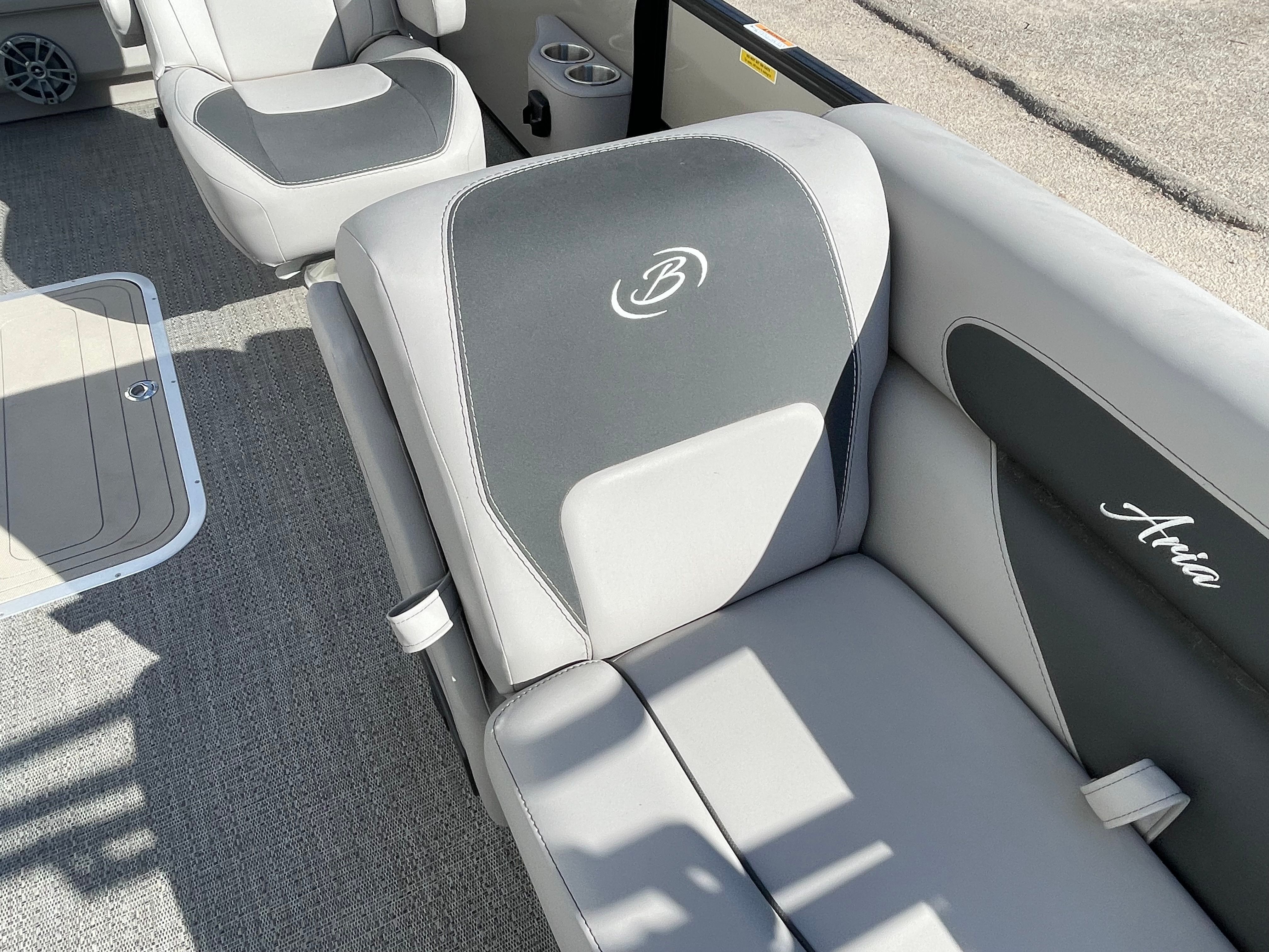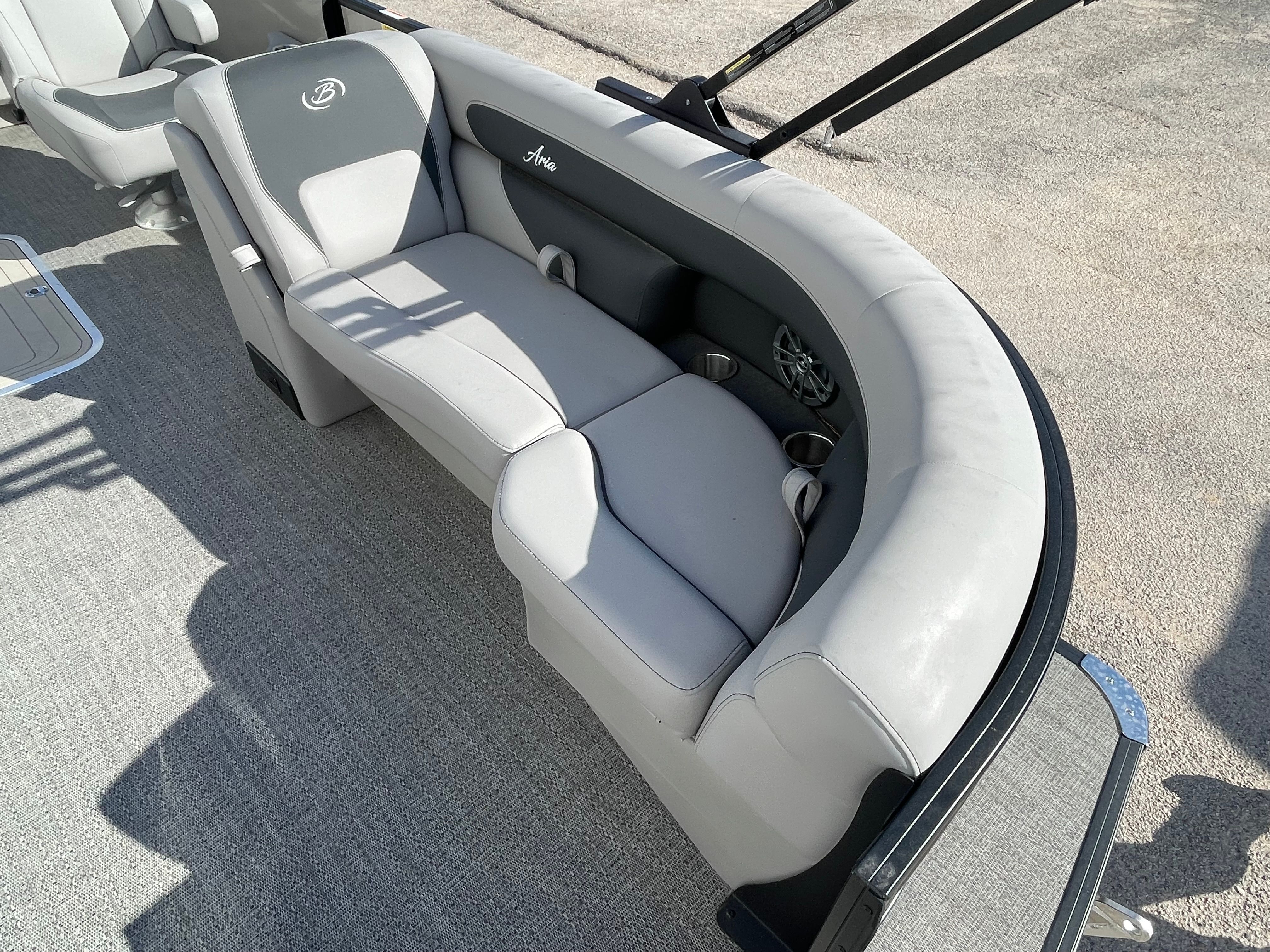 Step aboard the Barletta Aria A22UC-Platinum and experience a world of luxury and convenience. The Railskin Color Aria in Champagne, complemented by the Black Diamond accent, creates a sophisticated and eye-catching exterior. The Blackout Package Aria adds a touch of modern elegance, ensuring your pontoon stands out from the crowd. Inside, the Tempest Gray furniture provides plush seating and a contemporary look, while the Amore Gray flooring offers both style and durability.The Double Bimini canvas delivers ample shade, allowing you and your guests to relax comfortably even on the sunniest days. The Triple Toon Package Aria enhances stability and buoyancy, making this pontoon ideal for larger groups and more active water activities. Every detail, from the rigged engine with stainless steel prop to the thoughtful layout, is designed to maximize your enjoyment and convenience on the water.