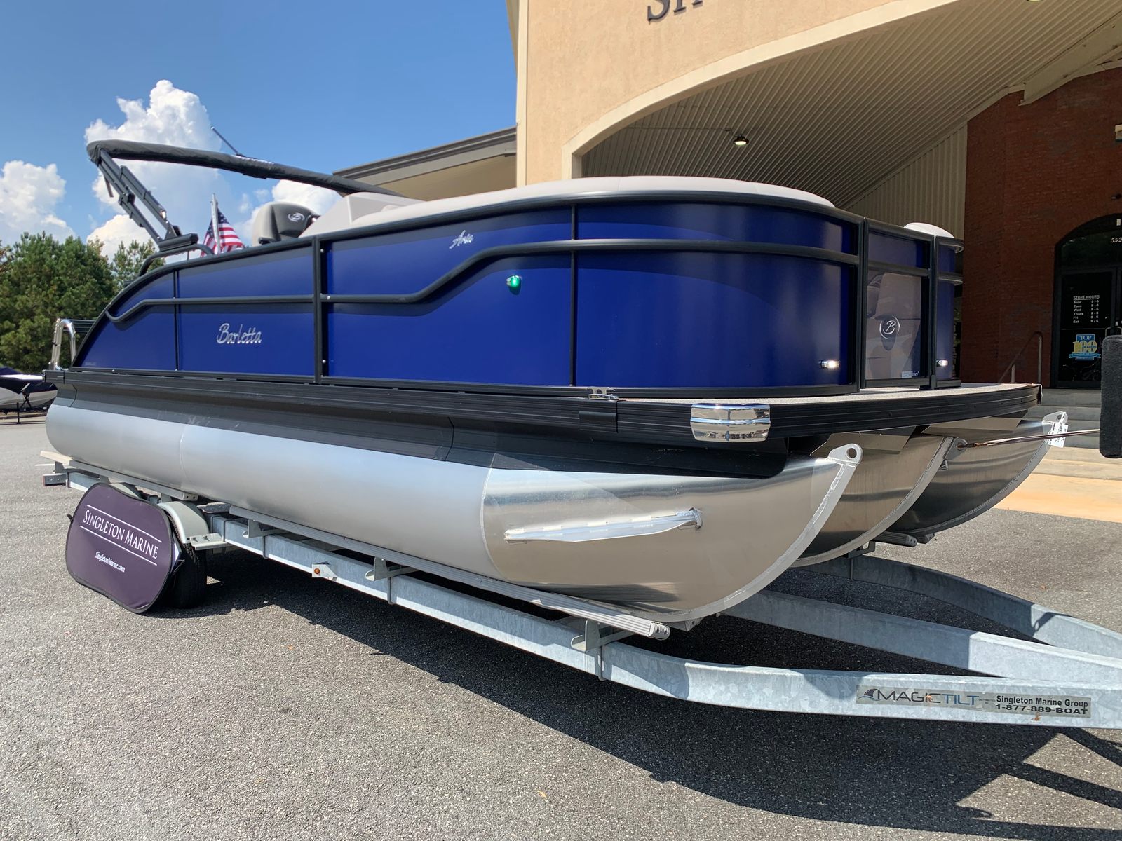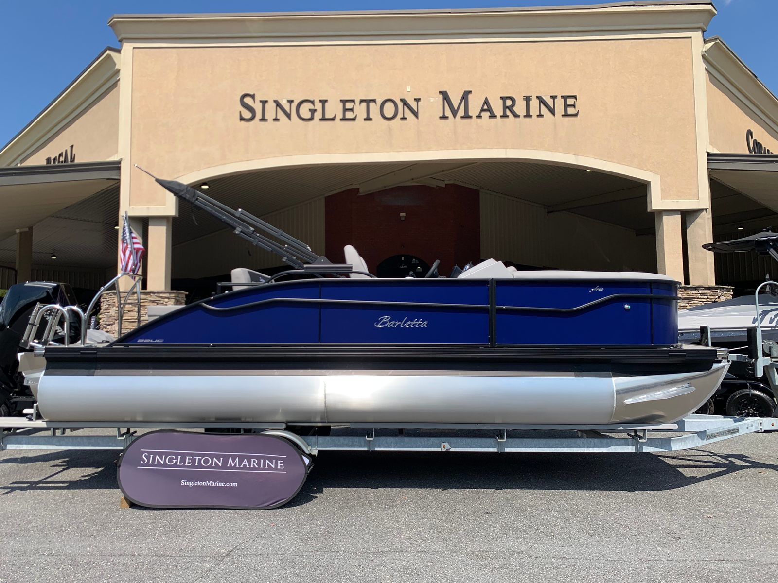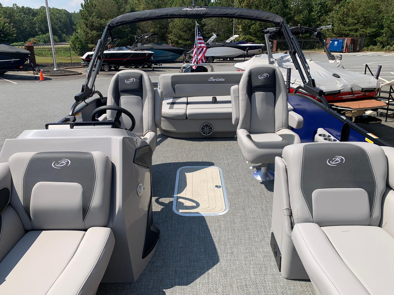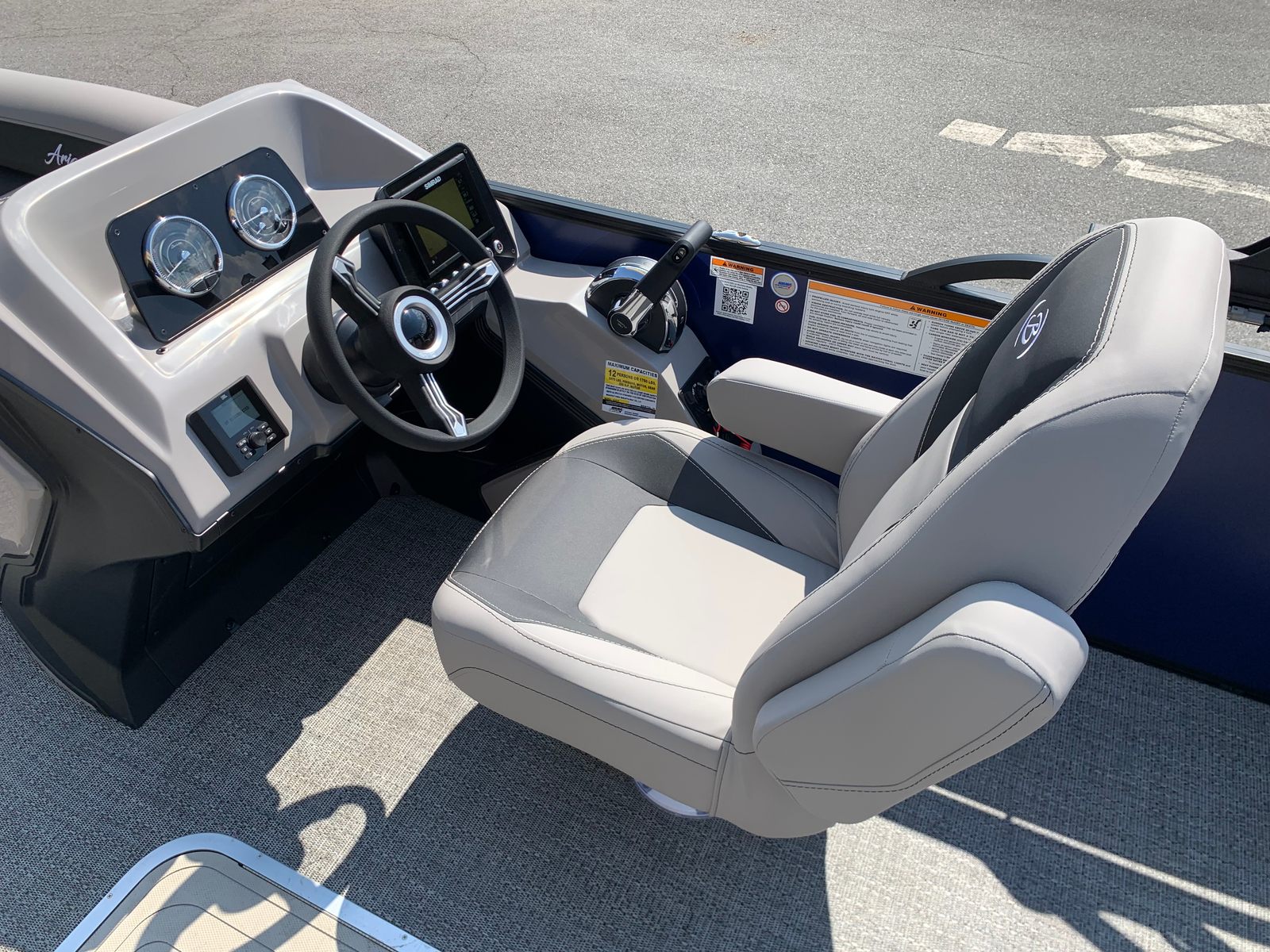 Step aboard the Aria A22UC-Platinum and you’ll immediately notice the attention to detail and quality craftsmanship that define Barletta boats. The Tempest Gray furniture offers plush, supportive seating, creating a welcoming environment for passengers to unwind and socialize. The Amore Gray flooring not only adds a touch of elegance but also provides a durable, easy-to-clean surface that stands up to the rigors of active boating.A standout feature of this pontoon is the in-floor midship storage, made possible by the Triple Toon configuration. This convenient storage solution keeps your gear organized and out of the way, maximizing deck space for fun and relaxation. At the helm, the Simrad 7" G07 XSE display puts navigation and system controls at your fingertips, enhancing safety and convenience on every outing.The exterior of the Aria A22UC-Platinum is equally impressive, featuring a stainless steel flag pole with an American flag—a stylish nod to your love of boating and country. The Blackout Package Aria adds a bold, contemporary flair to the railskin, while the Bohemian Blue color ensures your pontoon stands out wherever you go.