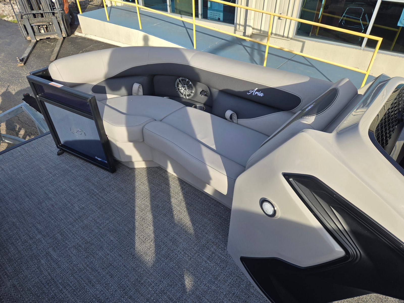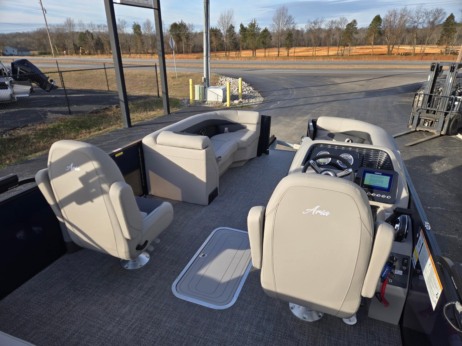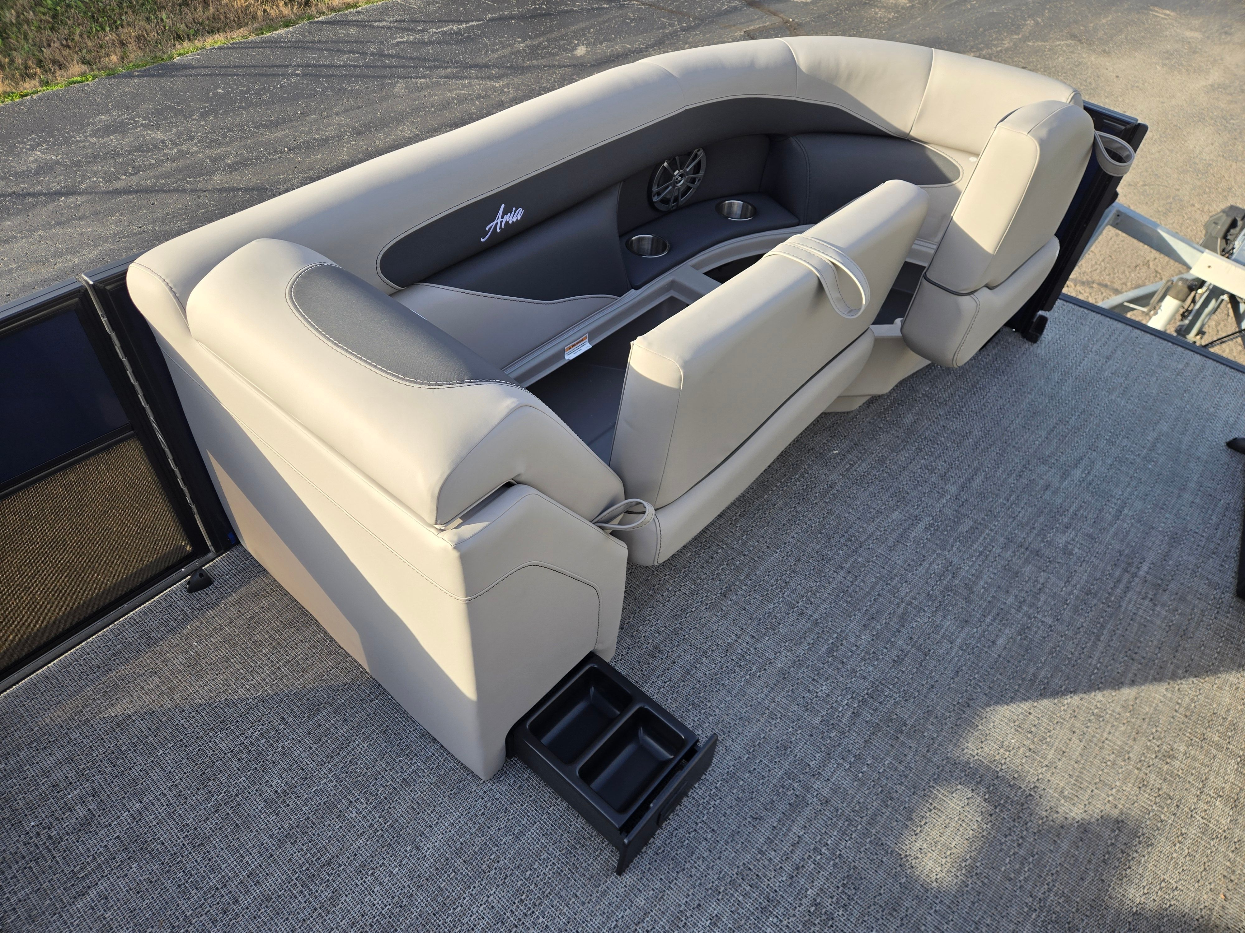 The Aria A22UC-Platinum is packed with special features that set it apart from other pontoon boats for sale. The Triple Toon Package Aria provides added stability and buoyancy, making it perfect for navigating choppy waters or carrying a full crew. The in-floor midship storage offers convenient space for stowing gear, water toys, and personal items, keeping the deck clutter-free and organized. An on-board battery charger for the single battery ensures you’re always ready to go, minimizing downtime and maximizing your time on the water.The furniture in Tempest Gray is not only visually appealing but also designed for comfort, allowing you and your guests to relax in style. The Amore Gray flooring is both durable and easy to clean, making maintenance a breeze after a fun-filled day. The combination of the Blue Sapphire railskin and Blackout Package Aria gives the boat a striking appearance that’s sure to impress fellow boaters and guests alike.