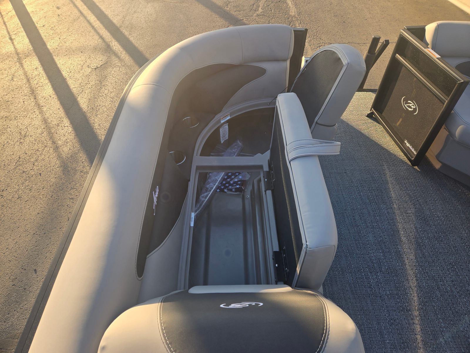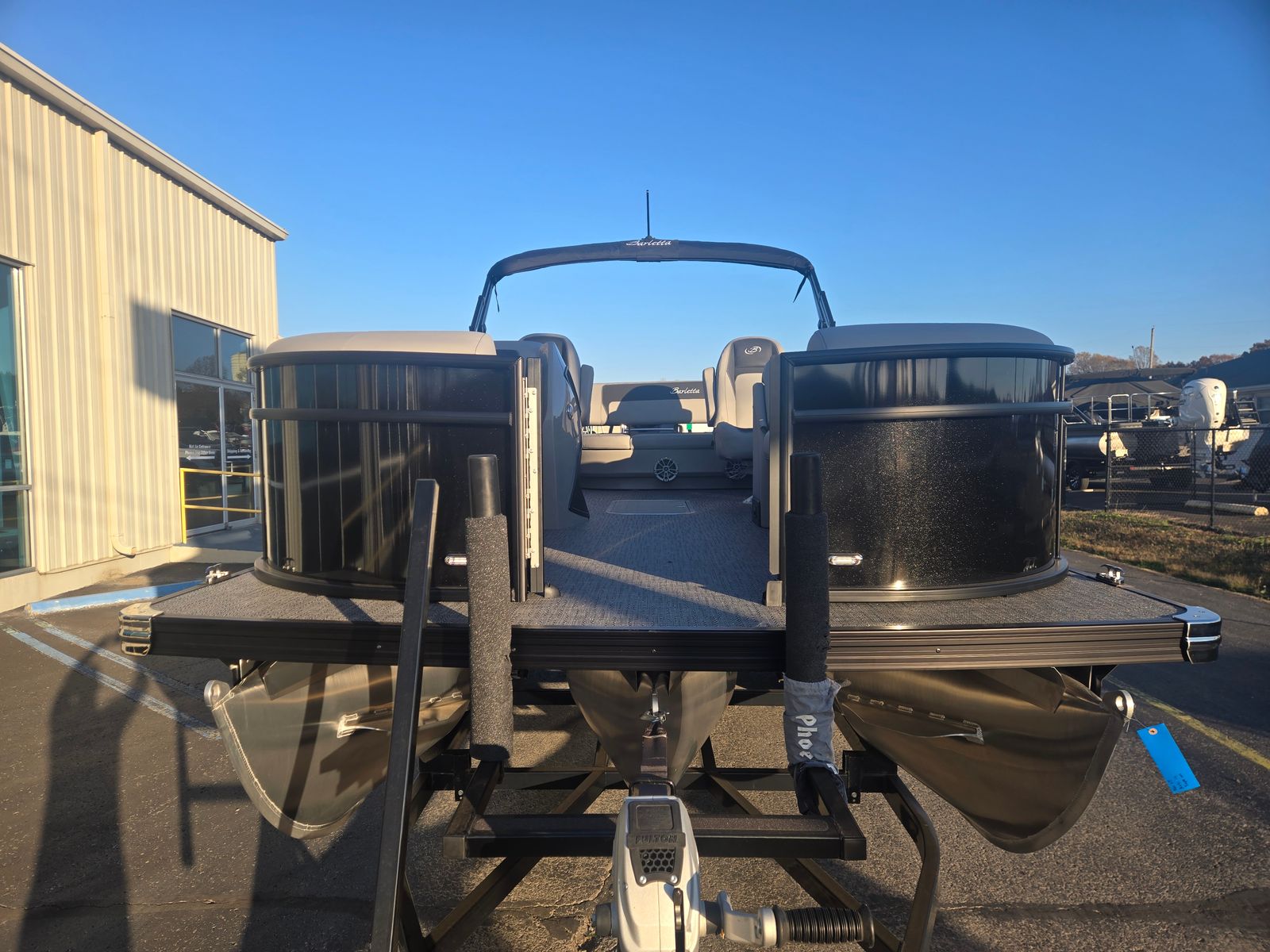 The 2026 Barletta Aria A22UC-Platinum is loaded with special features that set it apart from other pontoon boats for sale. The Railskin Color Aria in Black Diamond, paired with the Blackout Package Aria, creates a sleek, modern aesthetic that turns heads at every dock. Inside, the Tempest Gray furniture offers plush seating and a sophisticated look, while the Amore Gray flooring provides both comfort and durability underfoot. The Triple Toon Package Aria enhances stability and performance, ensuring a smooth ride even in choppy conditions.For added convenience, the onboard battery charger keeps your single battery powered up and ready for every adventure. The stainless steel flag pole with an American flag adds a patriotic touch, making this Barletta boat for sale a true standout on the water.