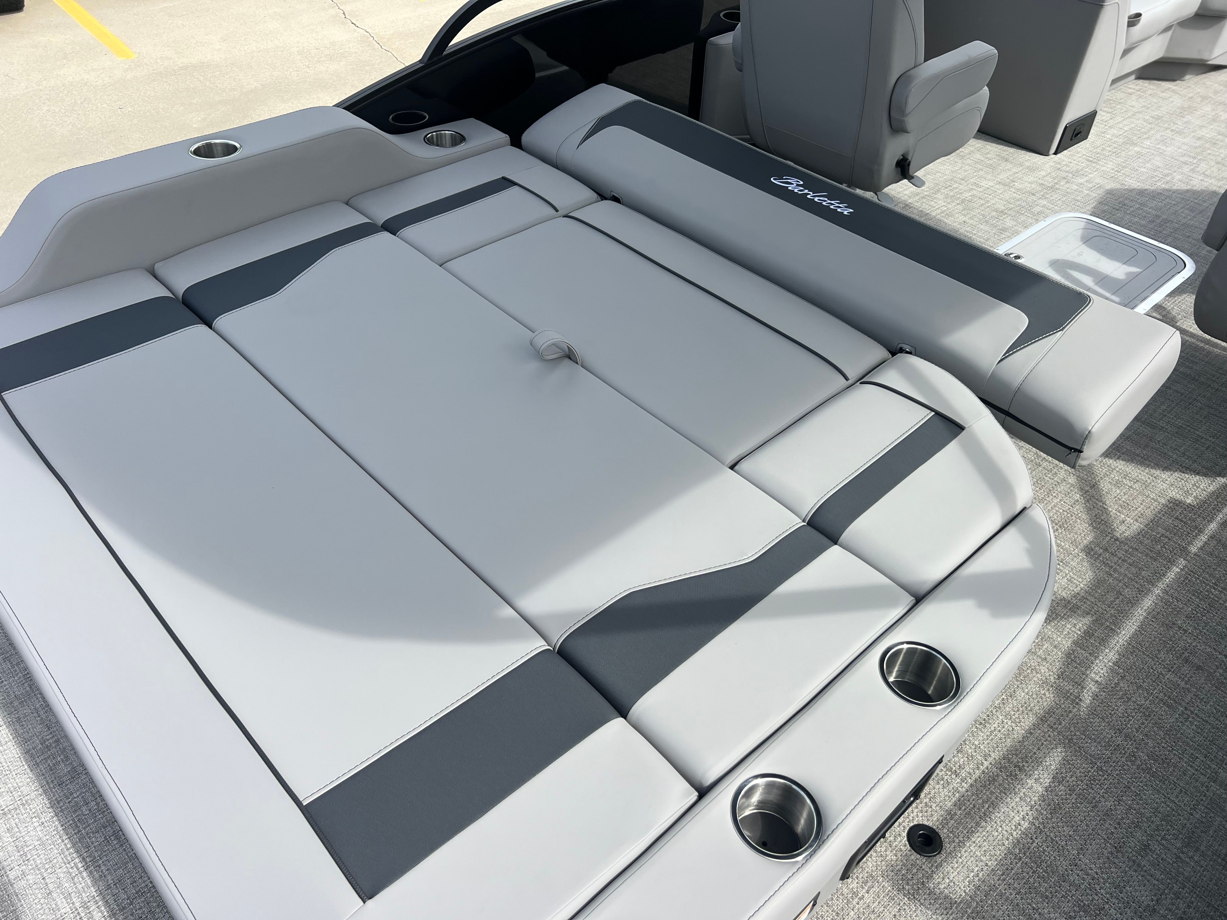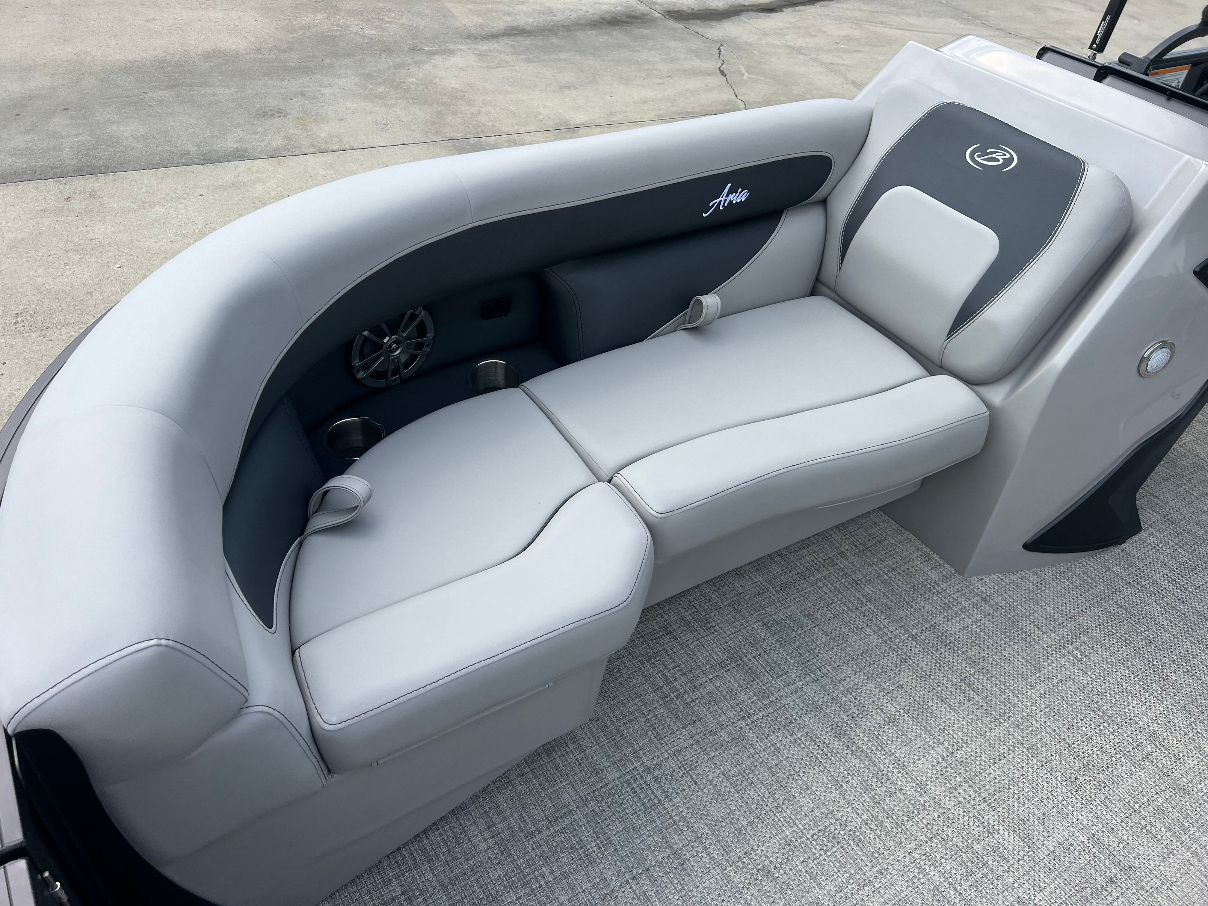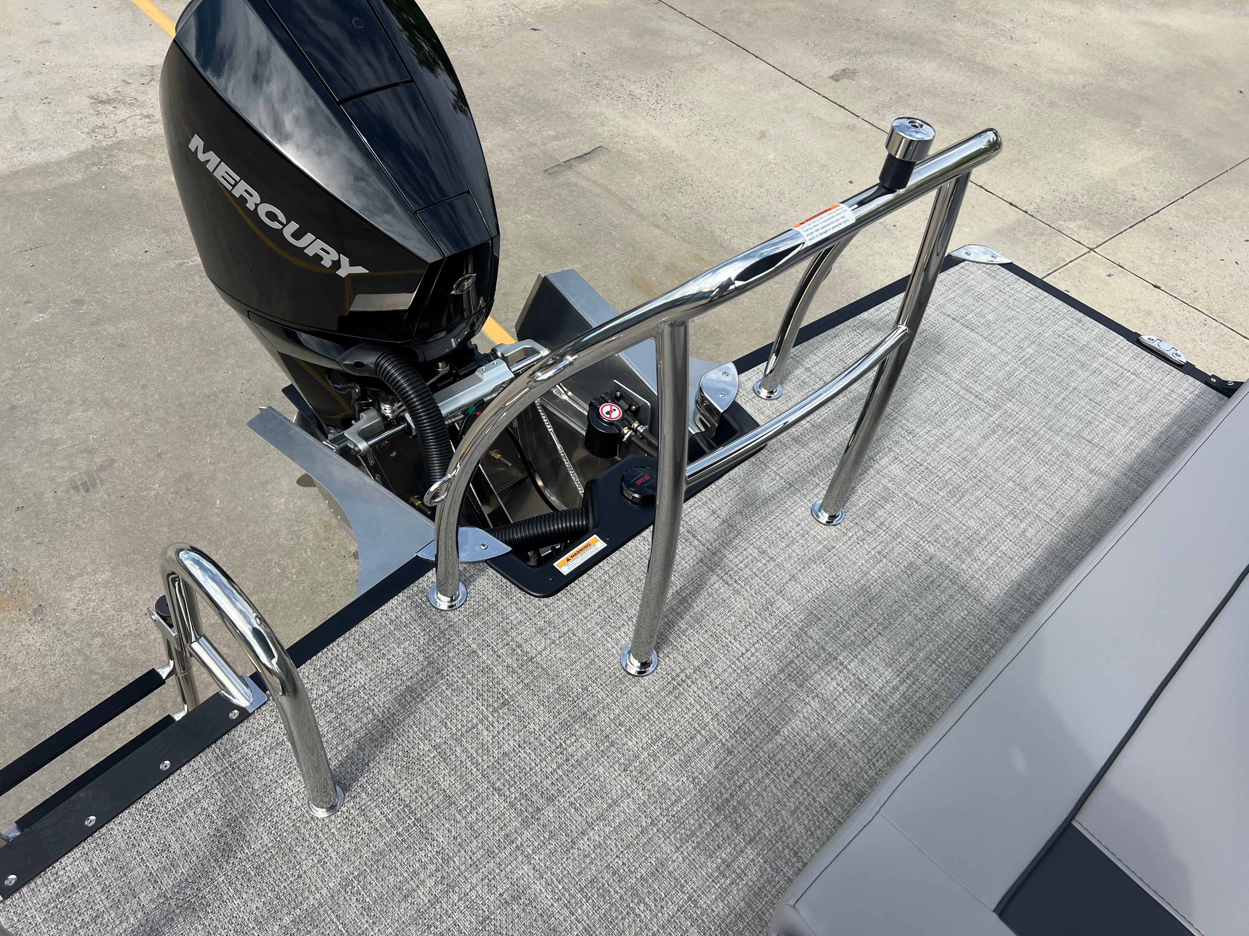 The 2026 Barletta Aria A22UC-Platinum is loaded with features designed to elevate your time on the water. The Aria Blackout Package adds a touch of elegance and exclusivity, while the Black Diamond Railskin color provides a bold, contemporary aesthetic. Inside, the Tempest Gray furniture offers plush seating for you and your guests, complemented by Alpine Gray flooring that is both stylish and easy to maintain. The in-floor midship storage compartment provides a convenient place to stow gear, water toys, or picnic supplies, keeping the deck clutter-free and organized. The clipped playpen cover with poles offers protection from the elements, ensuring your pontoon stays in pristine condition when not in use. Every detail, from the rigged engine with stainless steel prop to the Mercury mechanical pre-rig with power assist, is designed to enhance your boating experience.