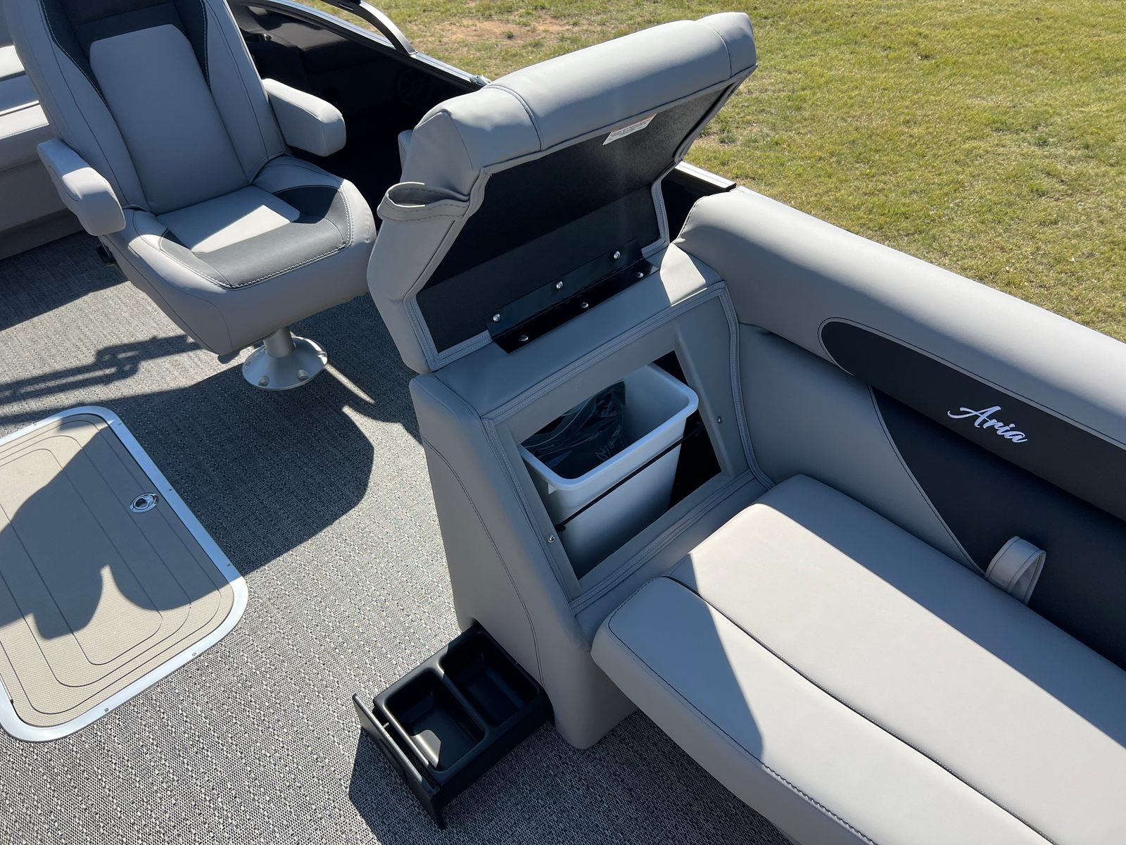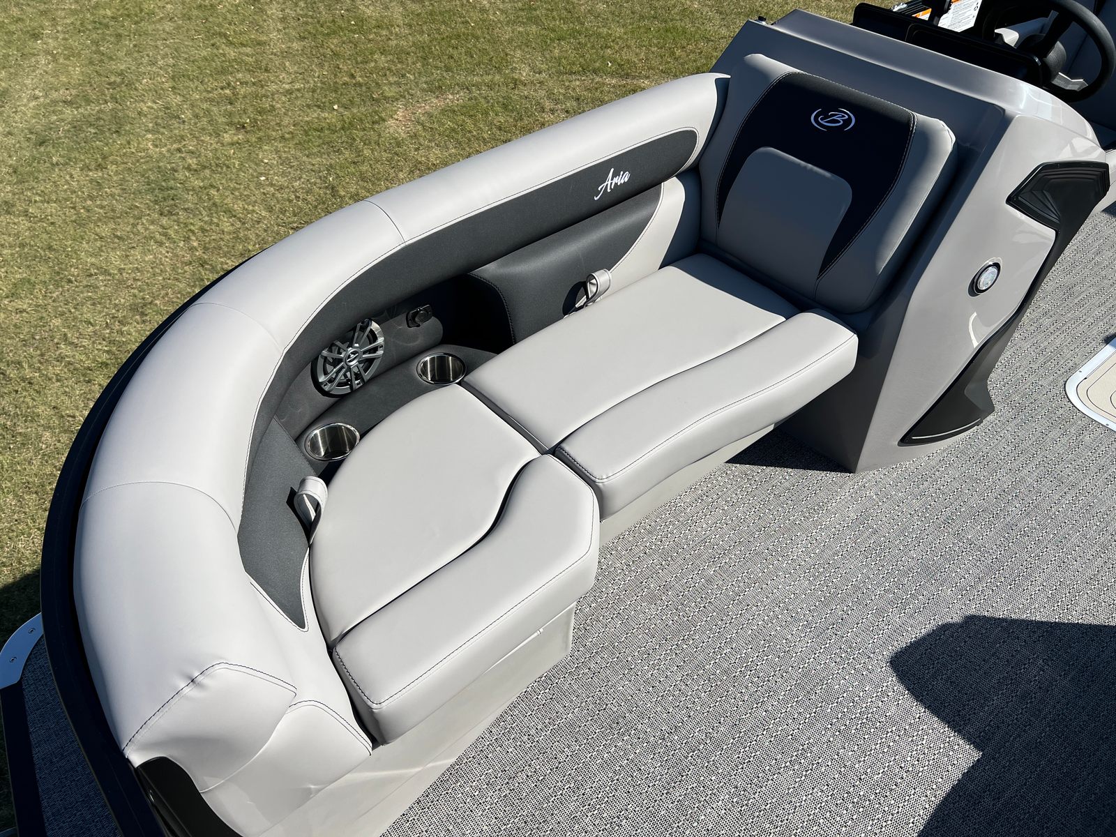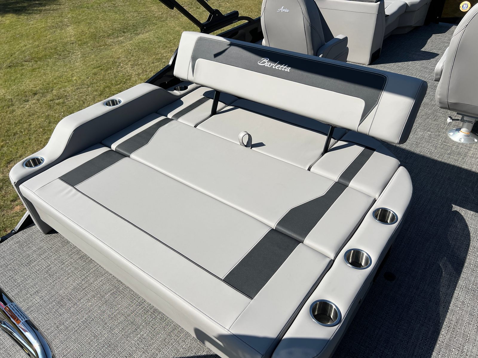 The Barletta Aria A22UC is packed with special features that elevate your boating experience. The Railskin Color Aria in Black Diamond and the Blackout Package Aria give the boat a bold, sophisticated look, while the Tempest Gray furniture and Amore Gray flooring create a modern, comfortable interior. The Triple Toon Package Aria adds an extra layer of stability and performance, making this pontoon ideal for larger groups and more active outings. The in-floor midship storage provides convenient space for stowing gear, water toys, and personal items, keeping the deck clutter-free and organized. A stainless steel flag pole with an American flag adds a patriotic touch, perfect for holiday weekends and special occasions.