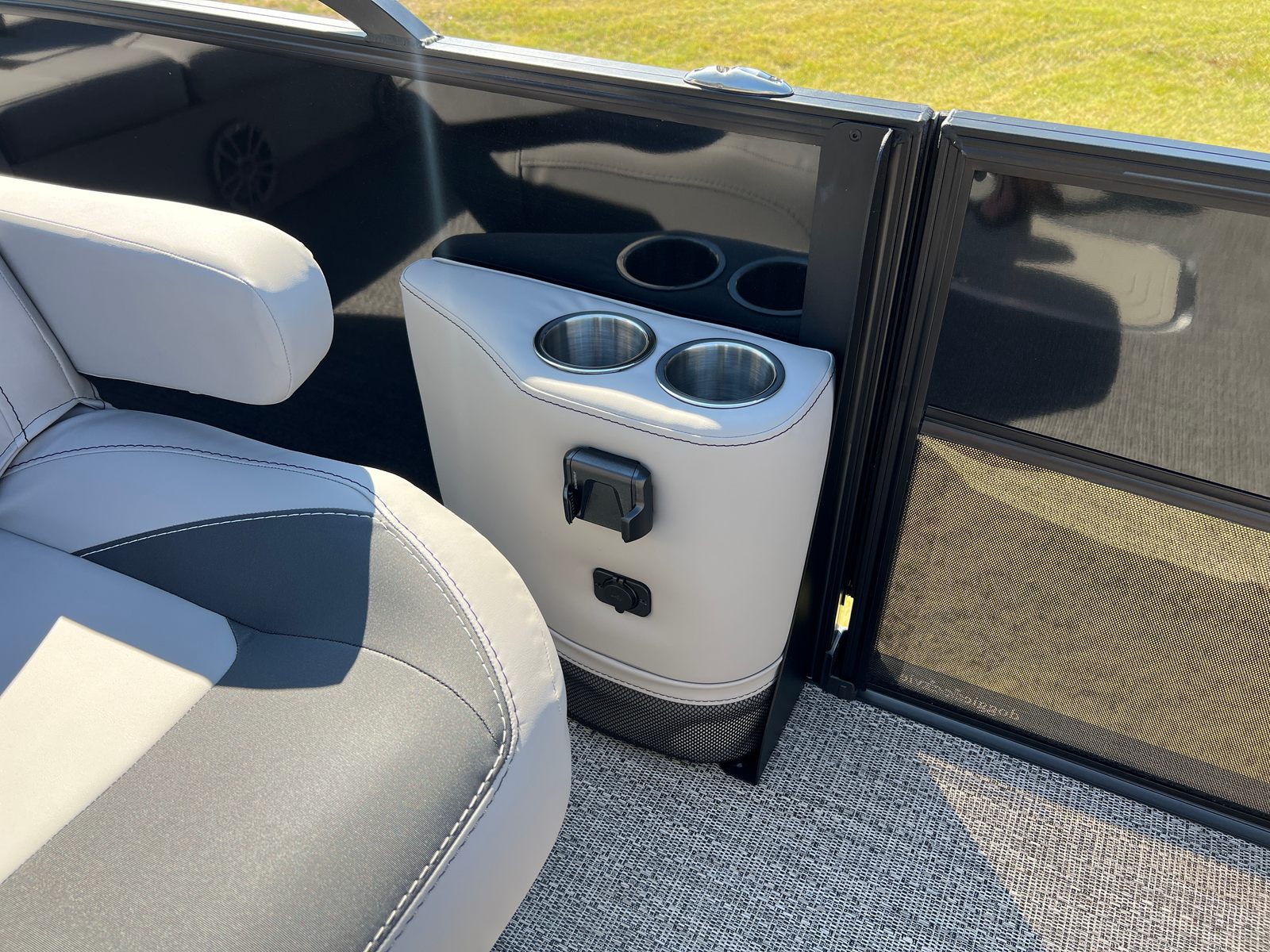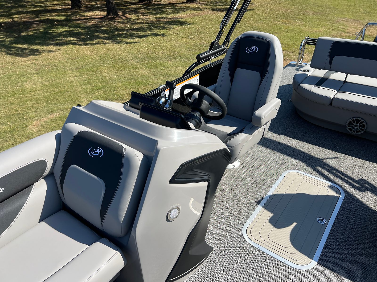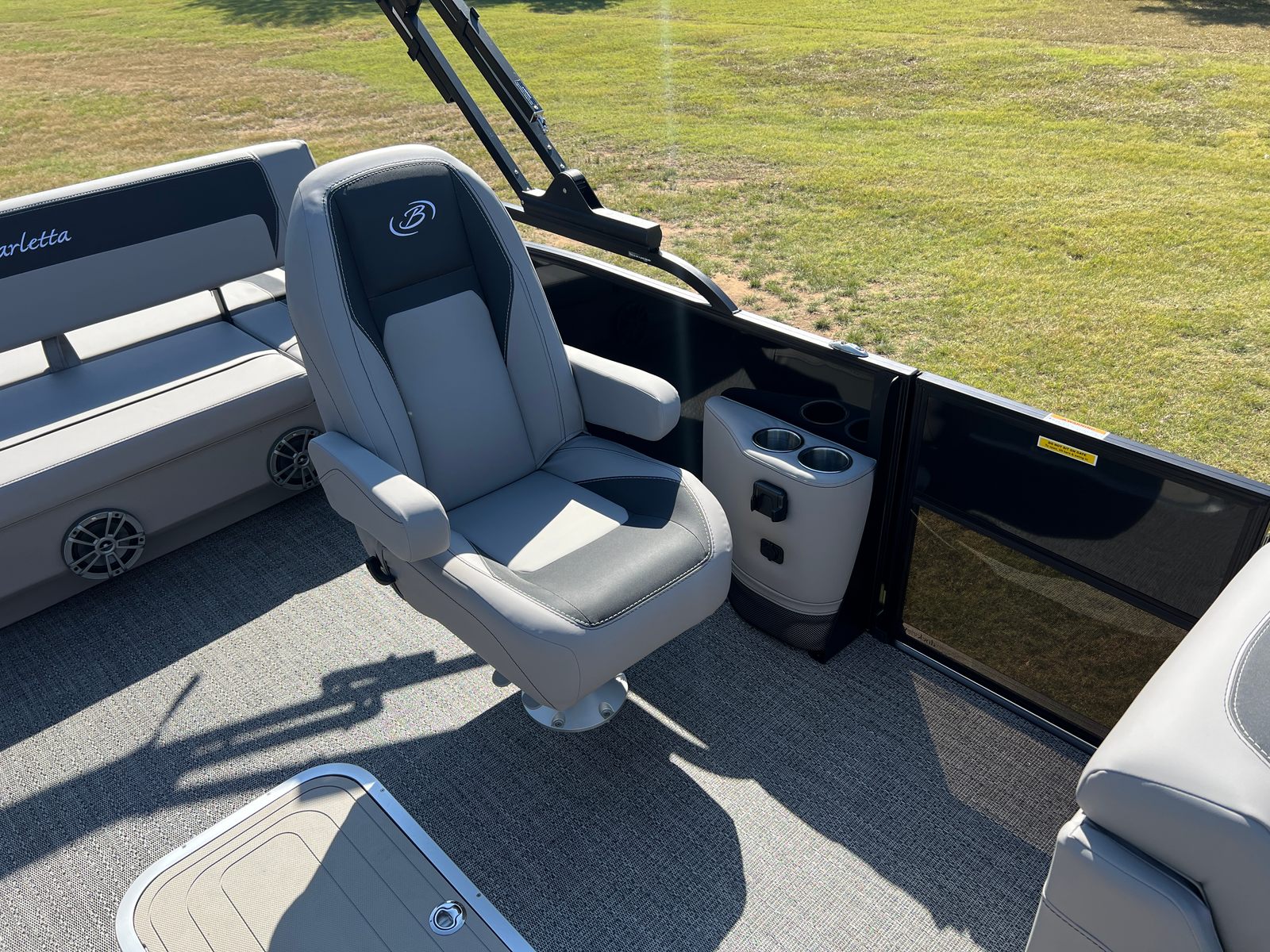 The Barletta Aria A22UC is packed with special features that elevate your boating experience. The Railskin Color Aria in Black Diamond and the Blackout Package Aria give the boat a bold, sophisticated look, while the Tempest Gray furniture and Amore Gray flooring create a modern, comfortable interior. The Triple Toon Package Aria adds an extra layer of stability and performance, making this pontoon ideal for larger groups and more active outings. The in-floor midship storage provides convenient space for stowing gear, water toys, and personal items, keeping the deck clutter-free and organized. A stainless steel flag pole with an American flag adds a patriotic touch, perfect for holiday weekends and special occasions.
