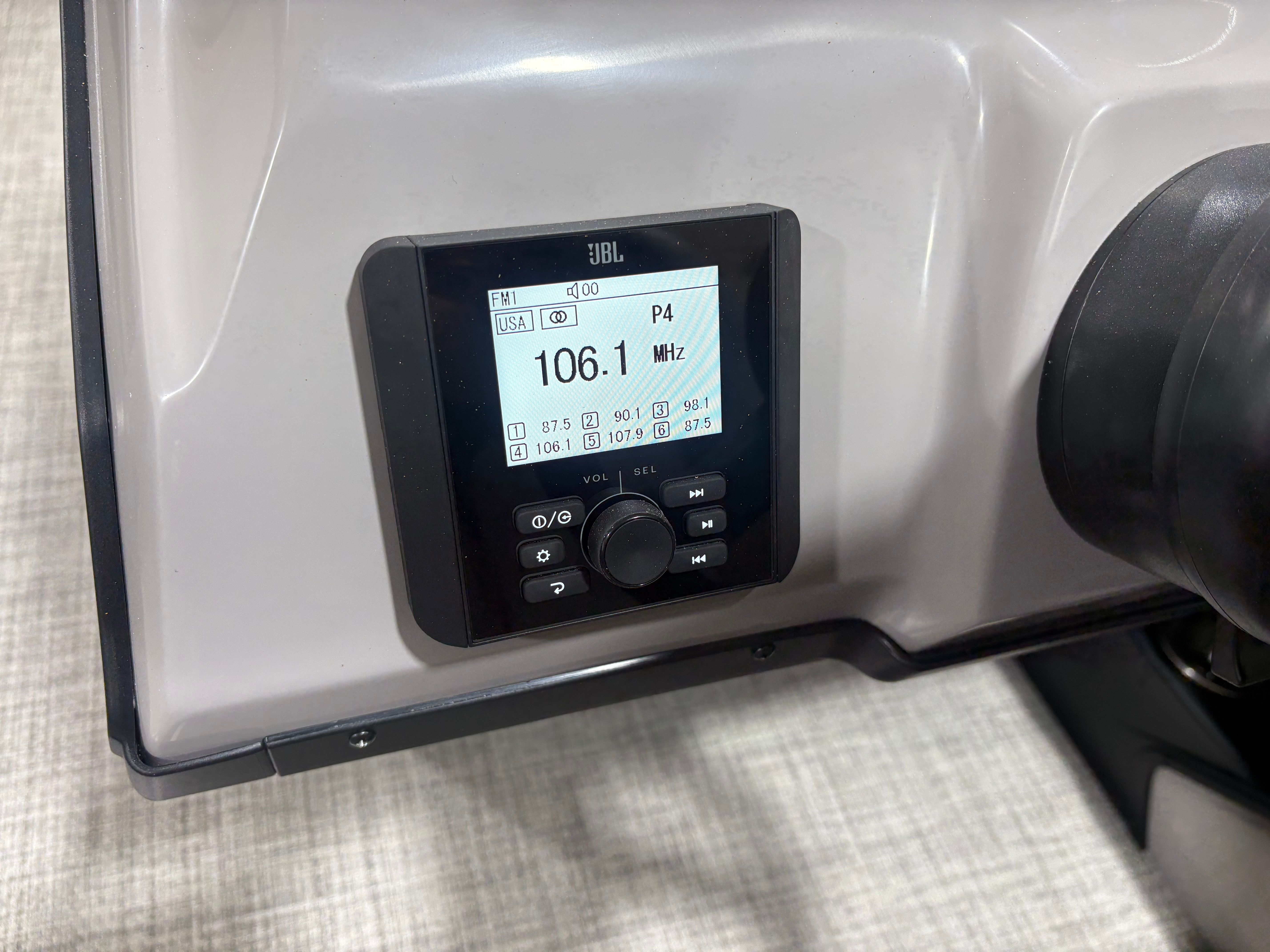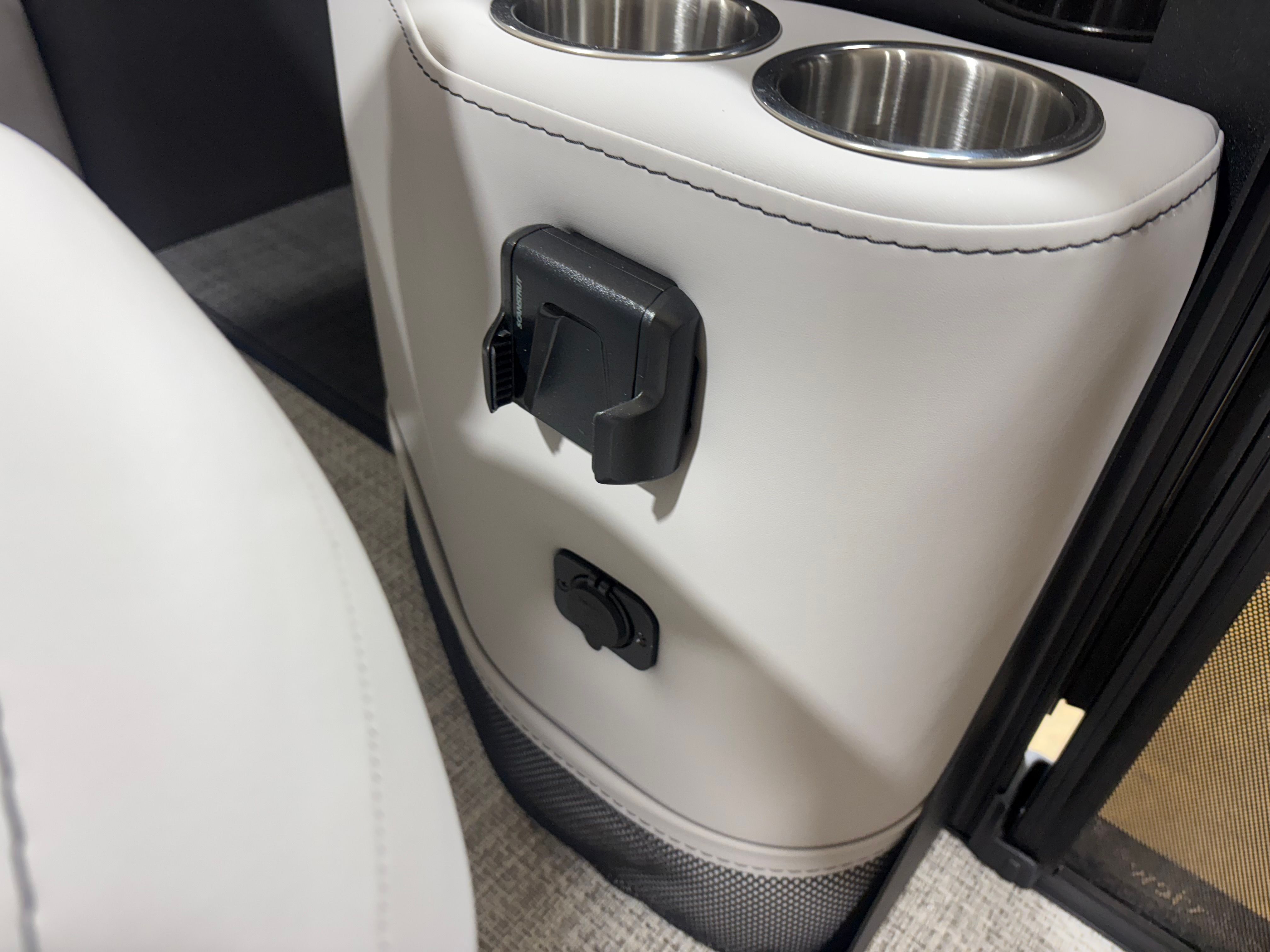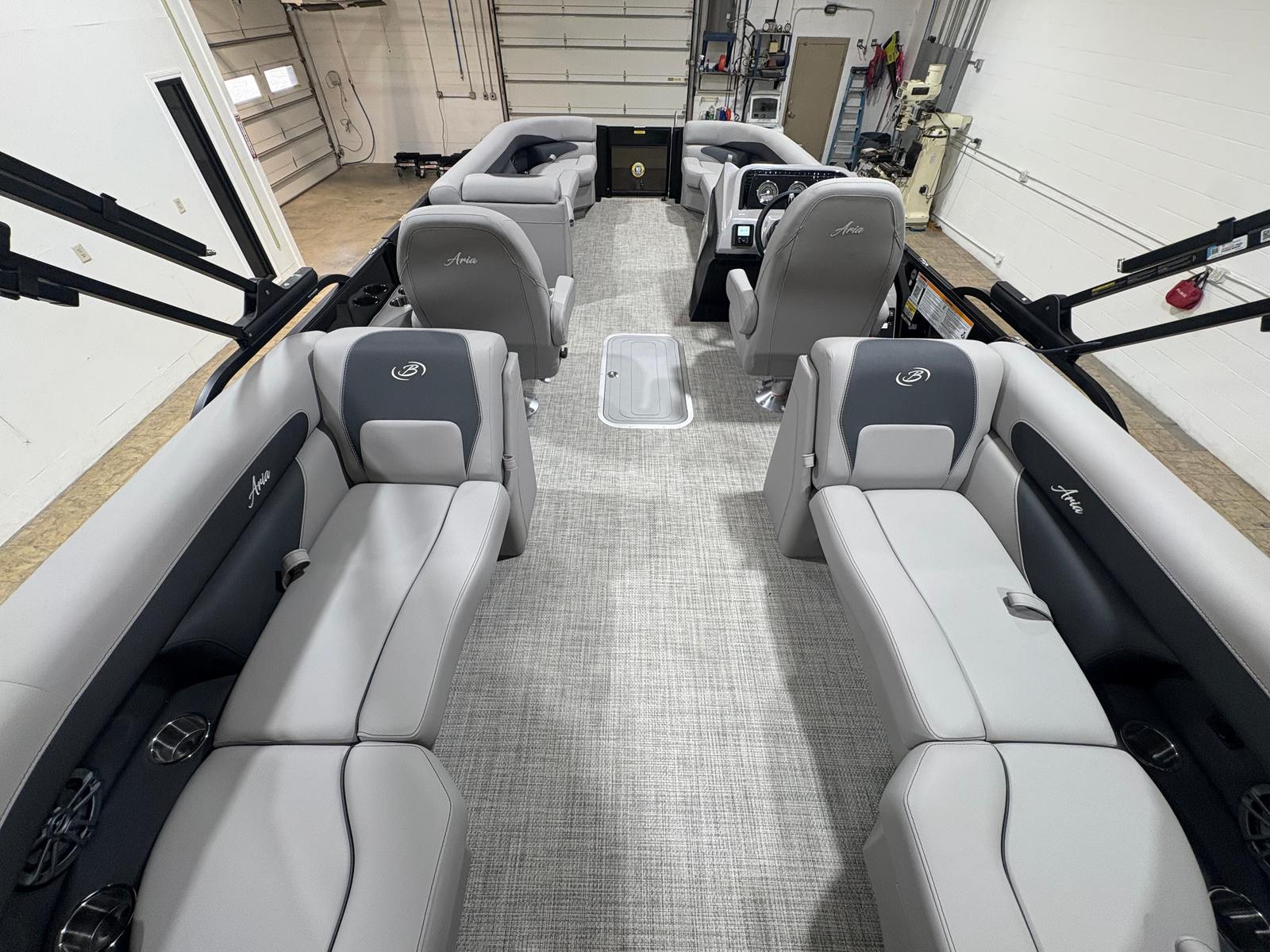 The Barletta Aria A24QC is loaded with features designed to enhance your time on the water. The Aria Blackout Package adds a bold, contemporary flair to the exterior, while the Black Diamond Railskin provides a striking visual impact. Inside, the Tempest Gray furniture offers plush seating for relaxation and socializing, complemented by the Amore Gray flooring that is both stylish and easy to maintain.For added convenience, the in-floor midship storage provides ample space for stowing gear, water toys, and personal items, keeping the deck clutter-free and organized. The clipped playpen cover with poles offers protection from the elements, ensuring your pontoon stays in pristine condition when not in use. The rigging includes a stainless steel prop for enhanced performance and longevity, while the Mercury pre-rig with power assist makes operating the boat smooth and responsive.