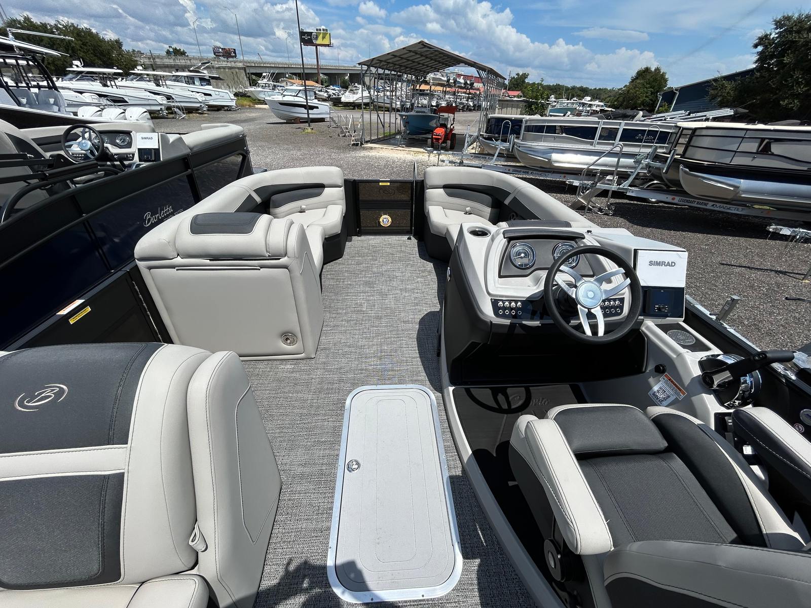The Barletta Cabrio C22CC is packed with features that set it apart from other pontoon boats for sale. The Blackout Package Cabrio not only enhances the boat’s visual appeal but also adds a layer of sophistication to its overall design. The Matte Black railskin color complements the Marquesan Gray furniture, creating a modern and inviting atmosphere onboard. The Amore Gray flooring is both stylish and practical, offering durability and easy maintenance for years of enjoyment.A standout feature of this model is the Simrad 7 G07 XSR Chartplotter/Multifunction Display, which provides advanced navigation and system monitoring at your fingertips. Whether you are plotting a course, tracking your speed, or monitoring engine performance, this intuitive display ensures you stay informed and in control. The Stainless Steel Flag Pole with an American Flag adds a patriotic touch, making every outing a celebration of freedom and adventure.The Triple Toon Package with midship storage not only improves performance but also offers additional space for storing gear, water toys, and other essentials. This thoughtful design ensures that your deck remains uncluttered, maximizing comfort and safety for everyone onboard. The pre-rigging for Mercury with mechanical controls streamlines the setup process, allowing you to get on the water faster and with greater peace of mind.