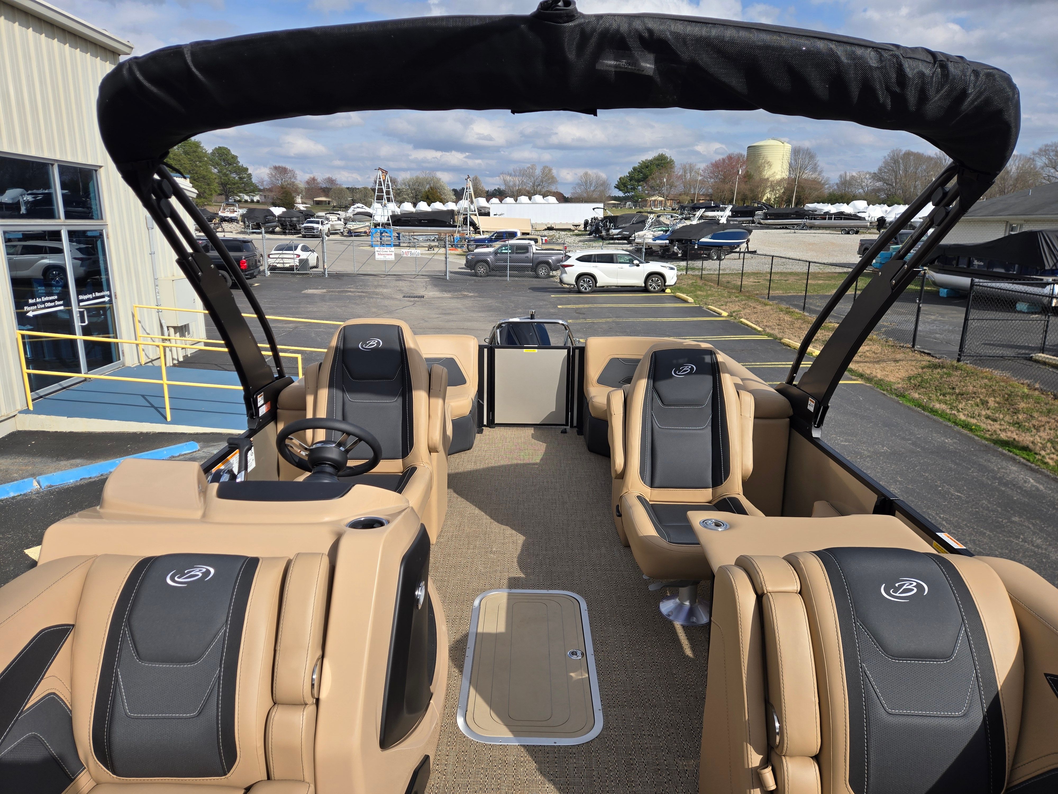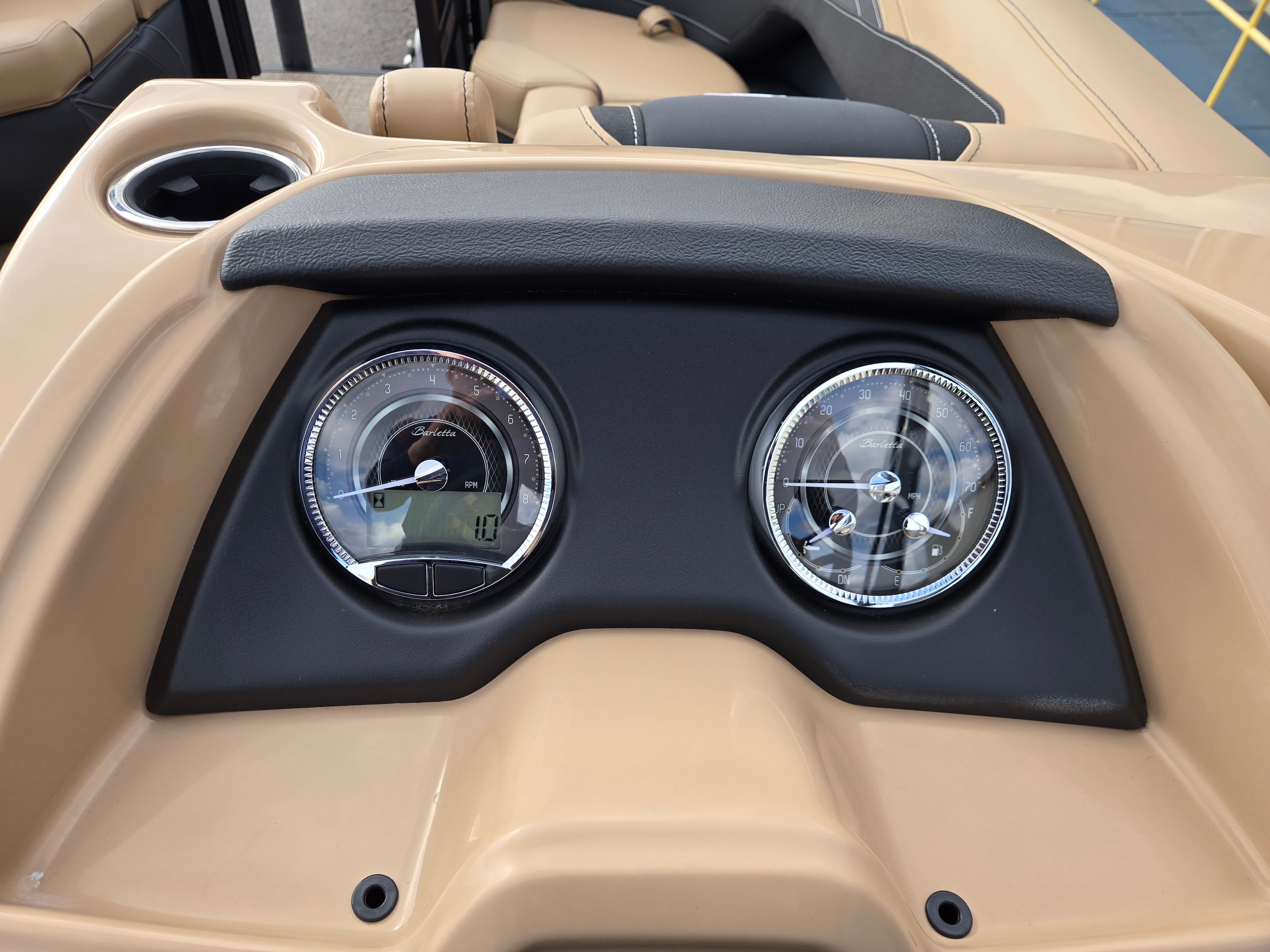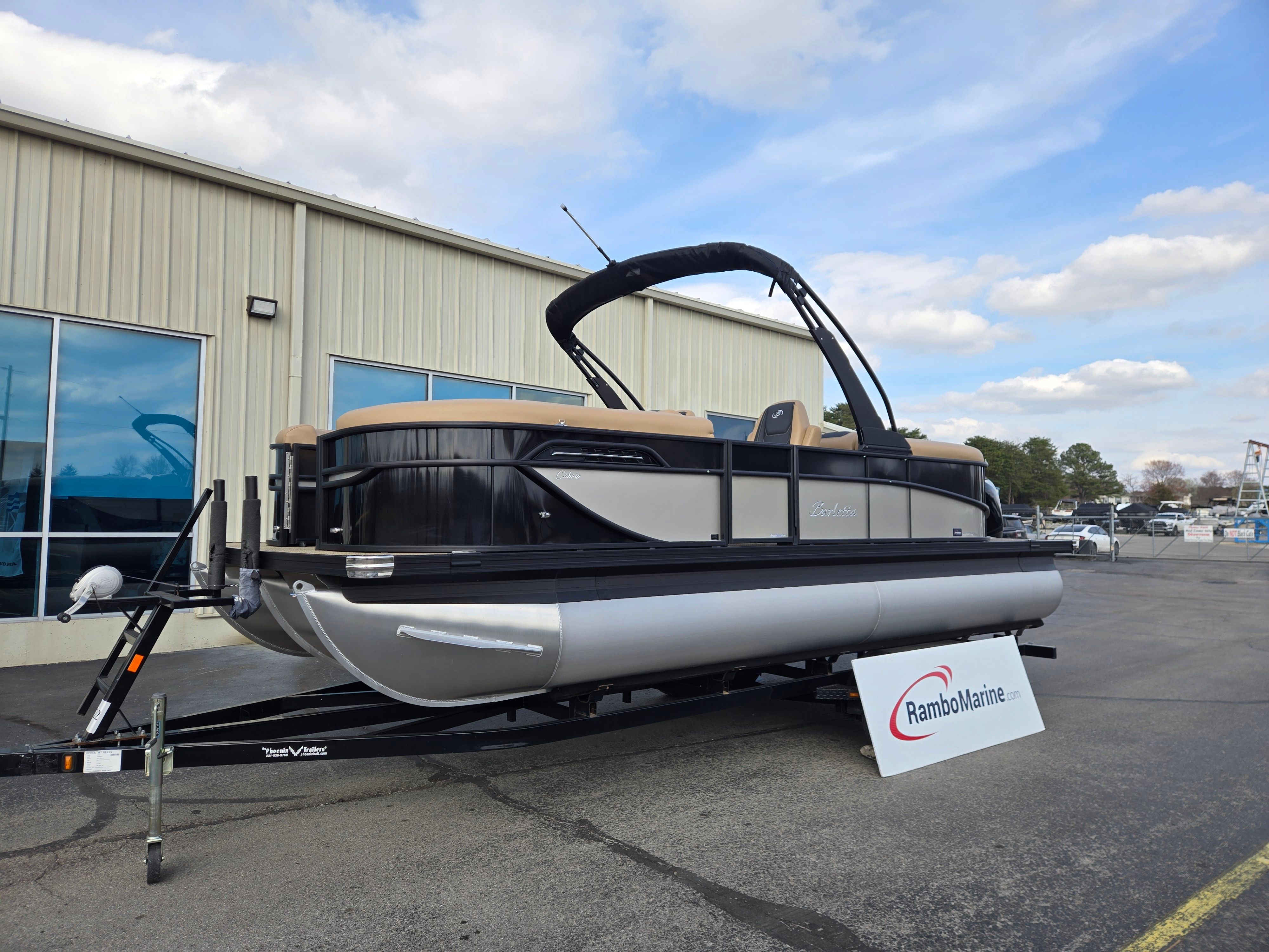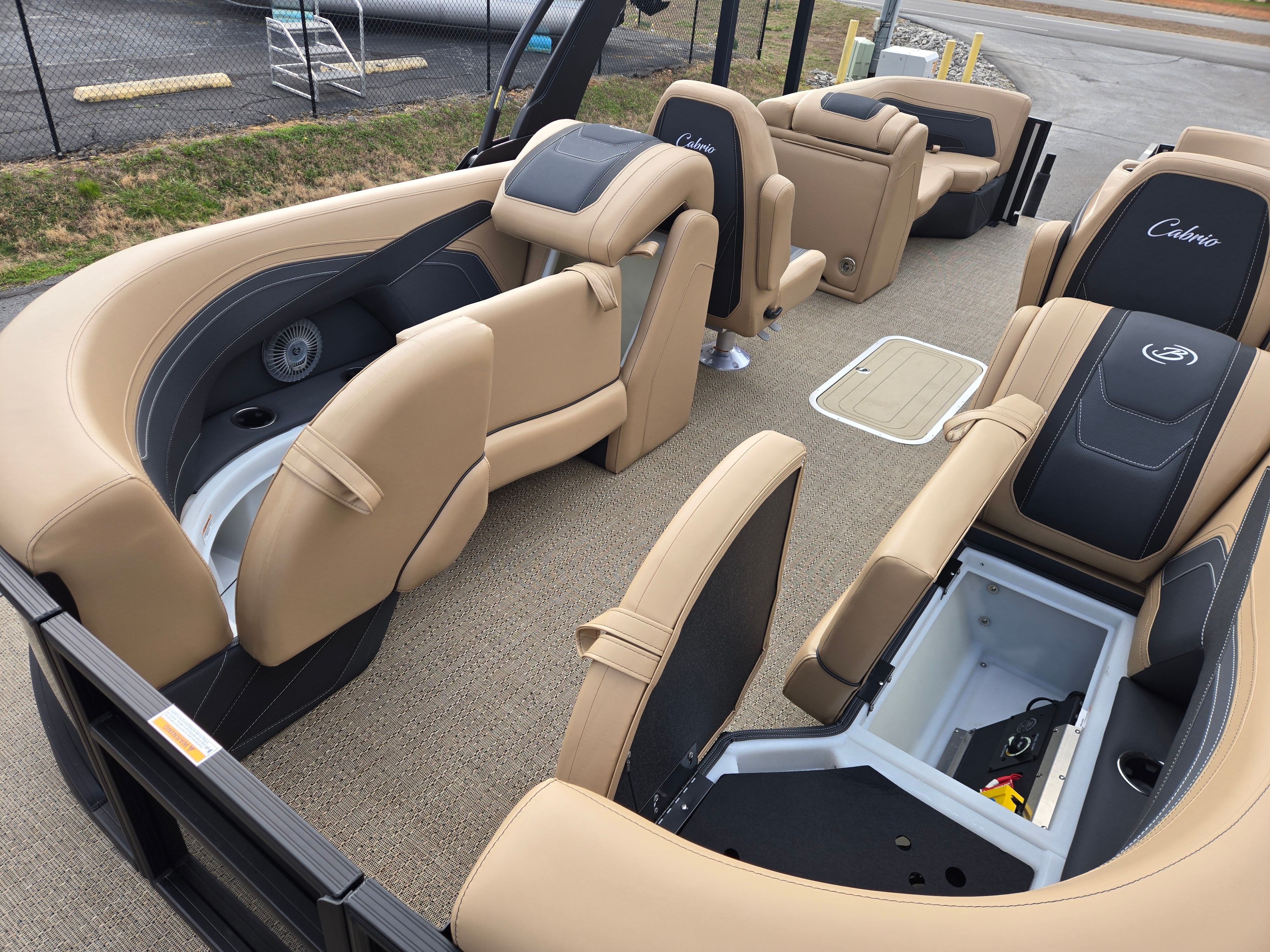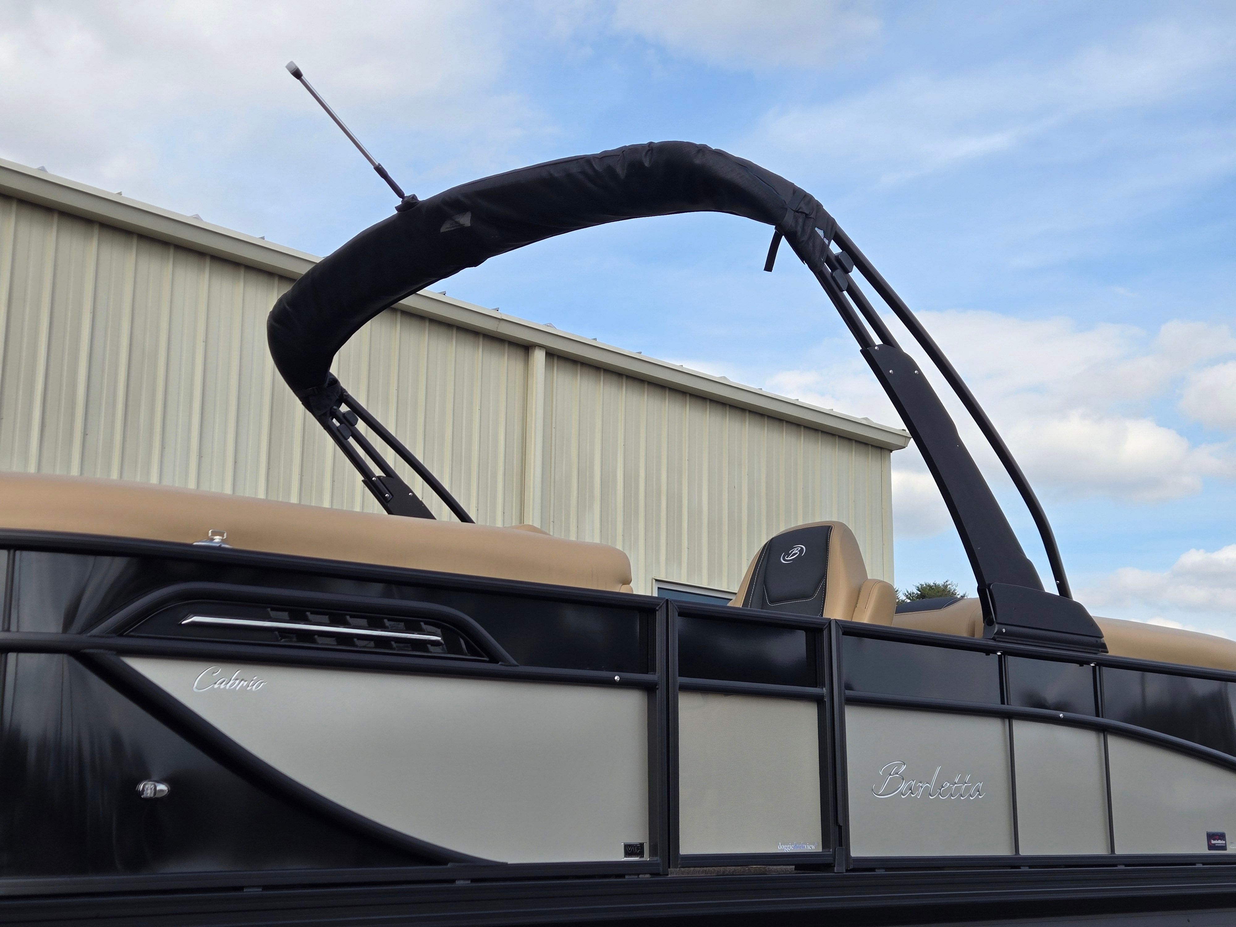Step aboard and experience the luxury of Carmella Tan furniture accented with Onyx, providing a sophisticated and inviting atmosphere for you and your guests. The Amore Tan flooring offers both comfort and style, creating a warm and welcoming environment underfoot. The Railskin Color in Black Diamond, complemented by a Champagne accent, gives the boat a sleek and modern appearance, further enhanced by the Blackout Package Cabrio for a bold, contemporary look.The Triple Toon Package with midship storage is a standout feature, offering additional stability and ample space for storing gear, water toys, or picnic essentials. The Sport Bimini, installed in place of the standard bimini, provides superior shade and protection from the sun, allowing you to enjoy long days on the water in comfort. Every detail of the Barletta Cabrio C22QC is designed to maximize your enjoyment and convenience, making it a truly exceptional pontoon boat for sale.