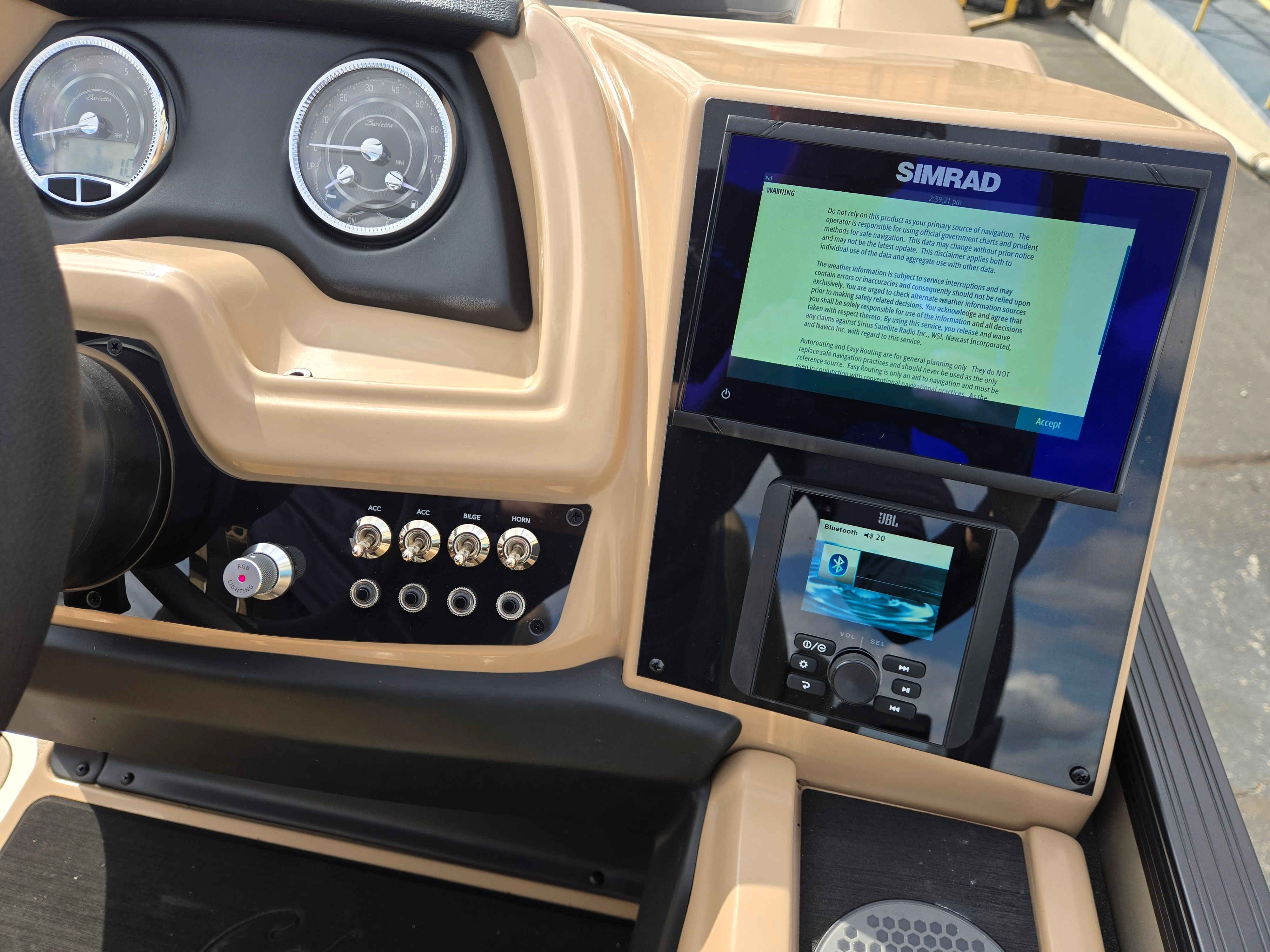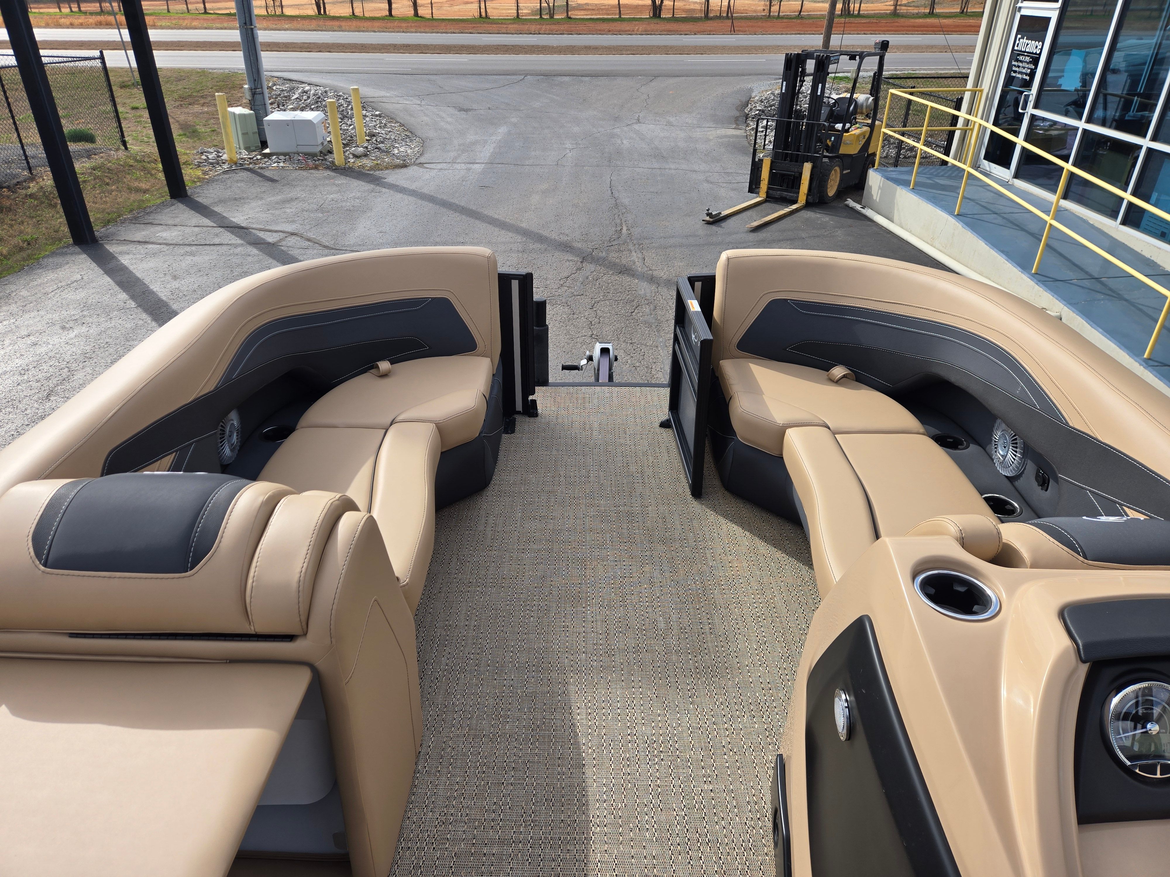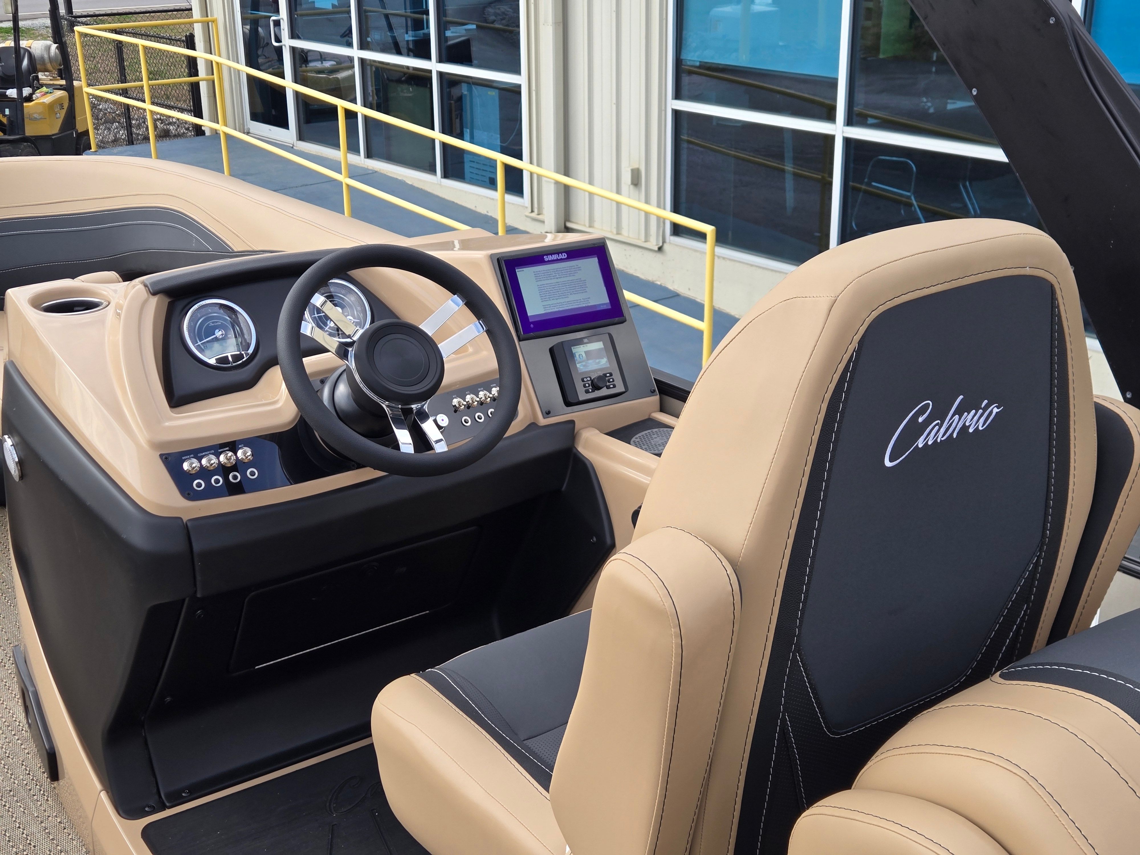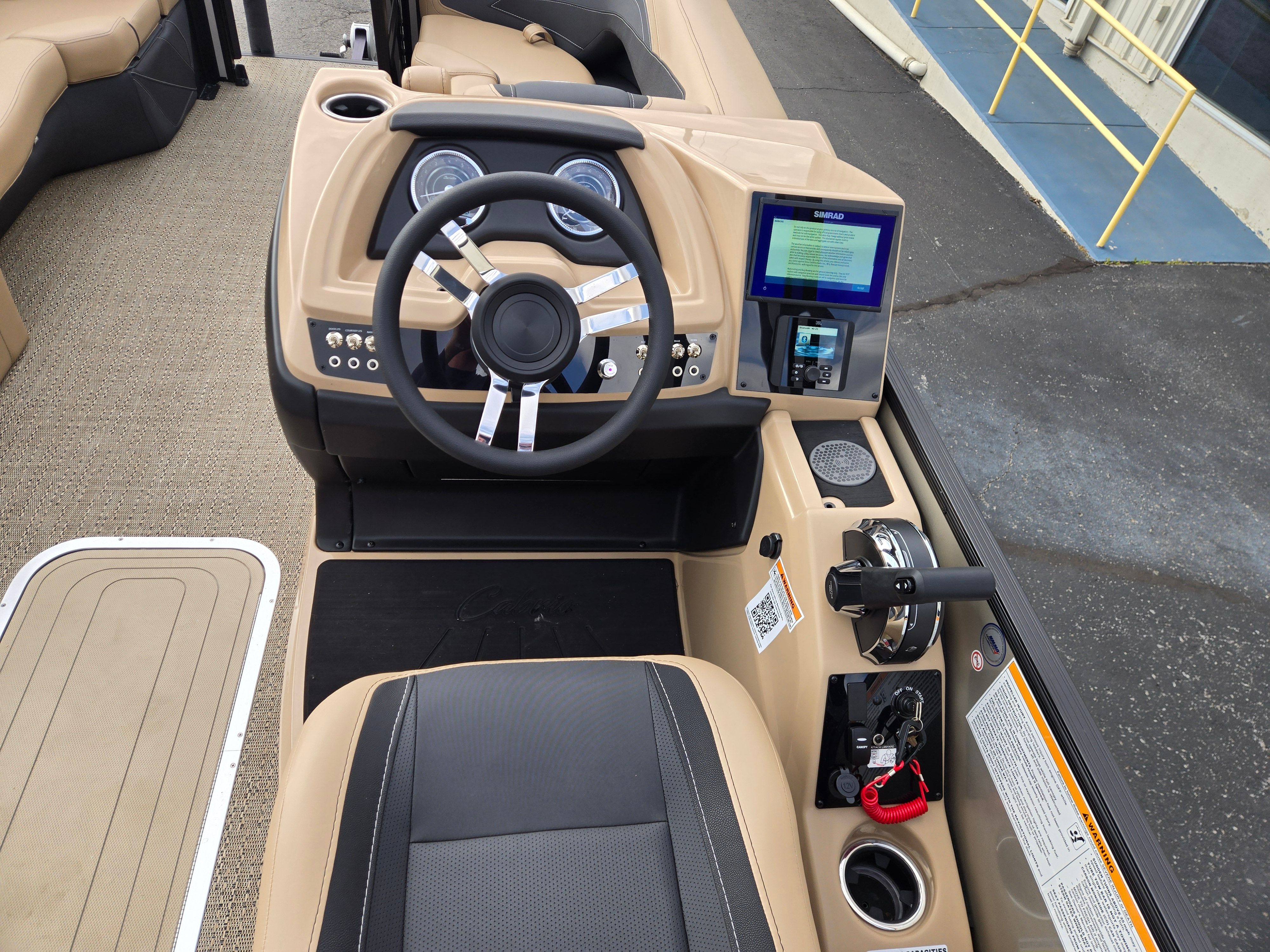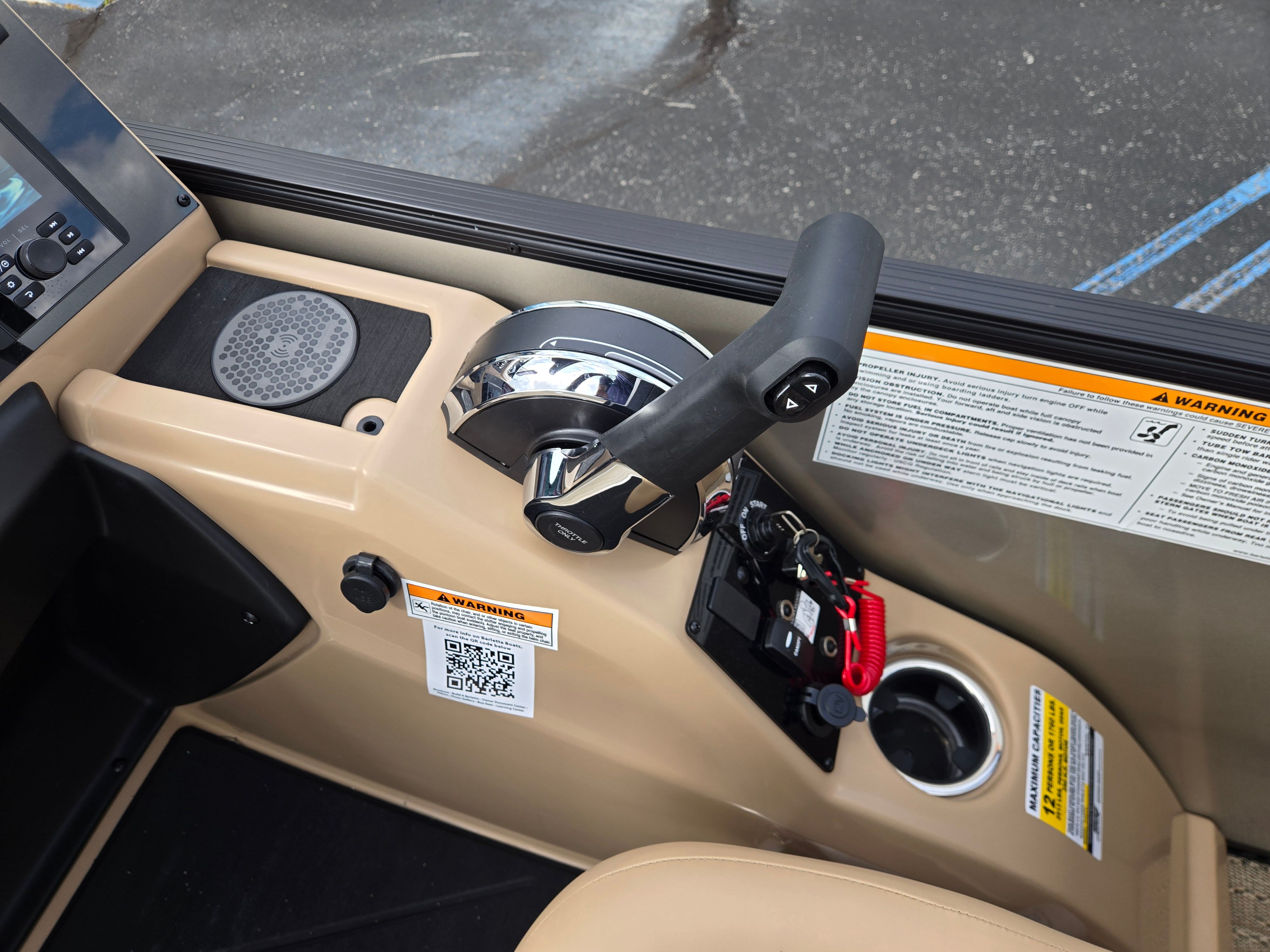 Step aboard and experience the luxury of Carmella Tan furniture accented with Onyx, providing a sophisticated and inviting atmosphere for you and your guests. The Amore Tan flooring offers both comfort and style, creating a warm and welcoming environment underfoot. The Railskin Color in Black Diamond, complemented by a Champagne accent, gives the boat a sleek and modern appearance, further enhanced by the Blackout Package Cabrio for a bold, contemporary look.The Triple Toon Package with midship storage is a standout feature, offering additional stability and ample space for storing gear, water toys, or picnic essentials. The Sport Bimini, installed in place of the standard bimini, provides superior shade and protection from the sun, allowing you to enjoy long days on the water in comfort. Every detail of the Barletta Cabrio C22QC is designed to maximize your enjoyment and convenience, making it a truly exceptional pontoon boat for sale.