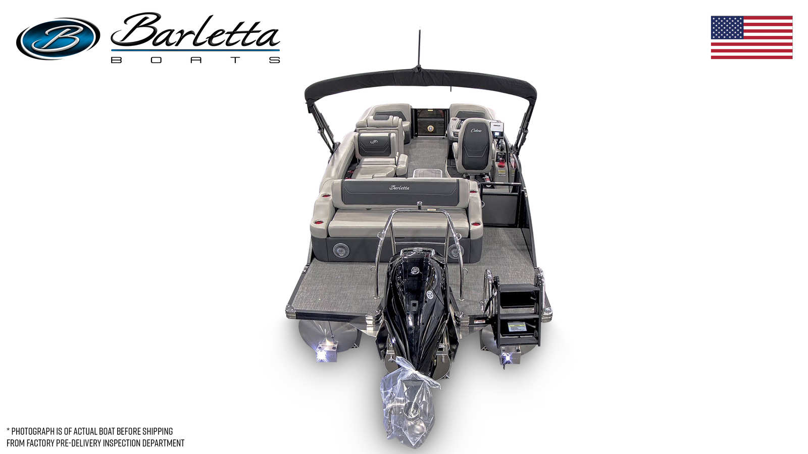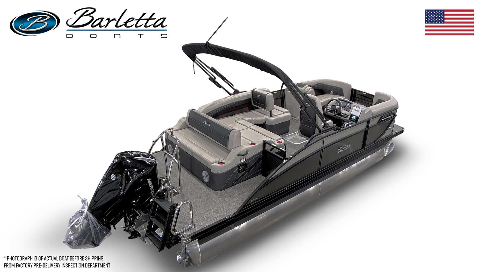 The Barletta Cabrio C22U is packed with premium features designed to maximize comfort, convenience, and enjoyment. The Champagne Railskin color and Gray Moonstone accent give the boat a refined, modern look, while the Blackout Package Cabrio adds a touch of bold sophistication. Inside, the Marquesan Gray/Onyx furniture provides plush seating and ample lounging space, complemented by the stylish Amore Gray flooring that’s both durable and easy to maintain.The Triple Toon Package with midship storage offers enhanced stability and extra room for gear, making it easy to stow water toys, fishing equipment, or picnic supplies. The Mercury (M) 200L FourStroke engine is paired with mechanical pre-rigging and power assist for effortless operation, and the stainless steel prop ensures optimal performance. A stainless steel flag pole with an American flag adds a patriotic touch, perfect for celebrating holidays or simply showing your pride on the water.