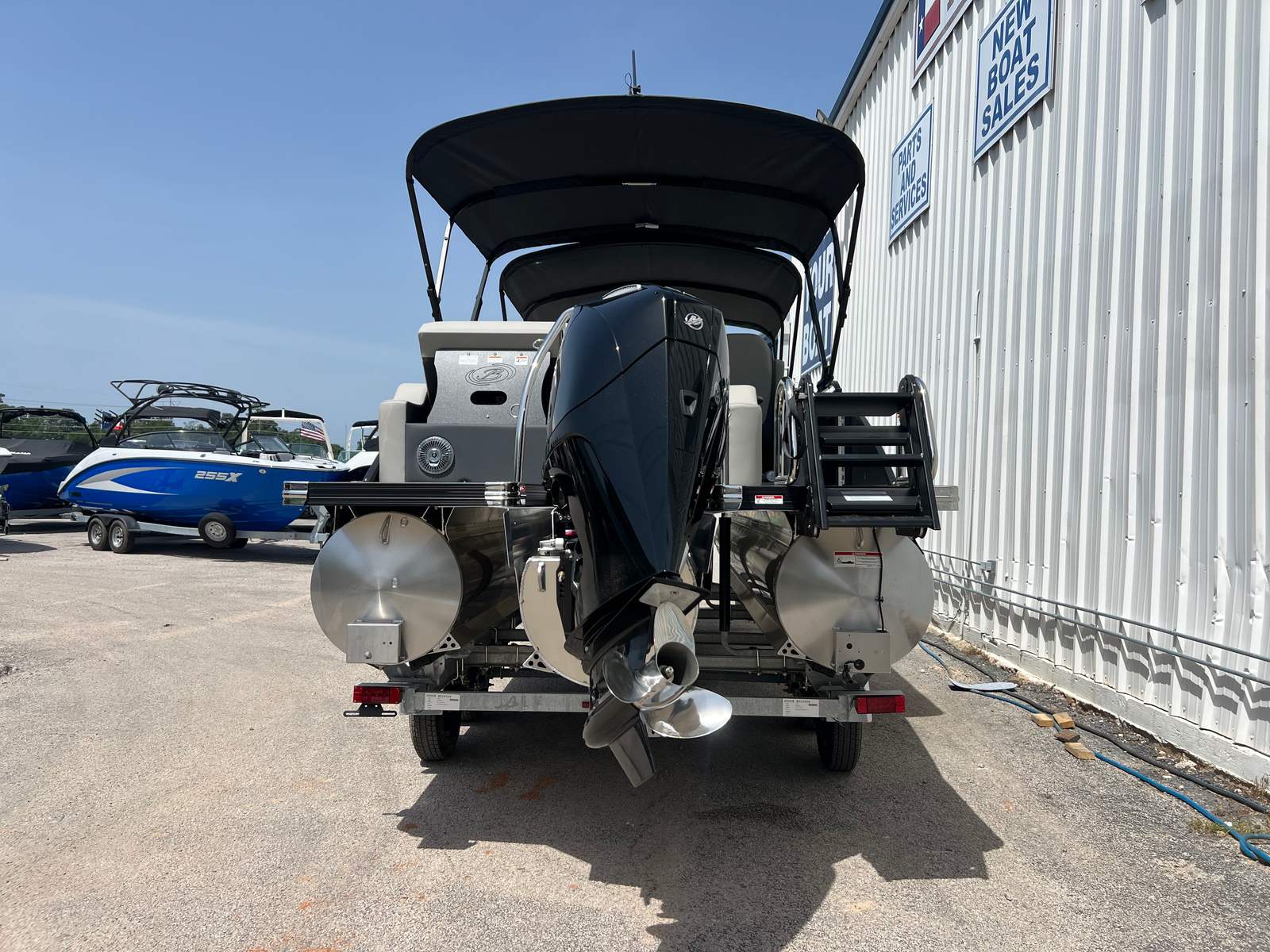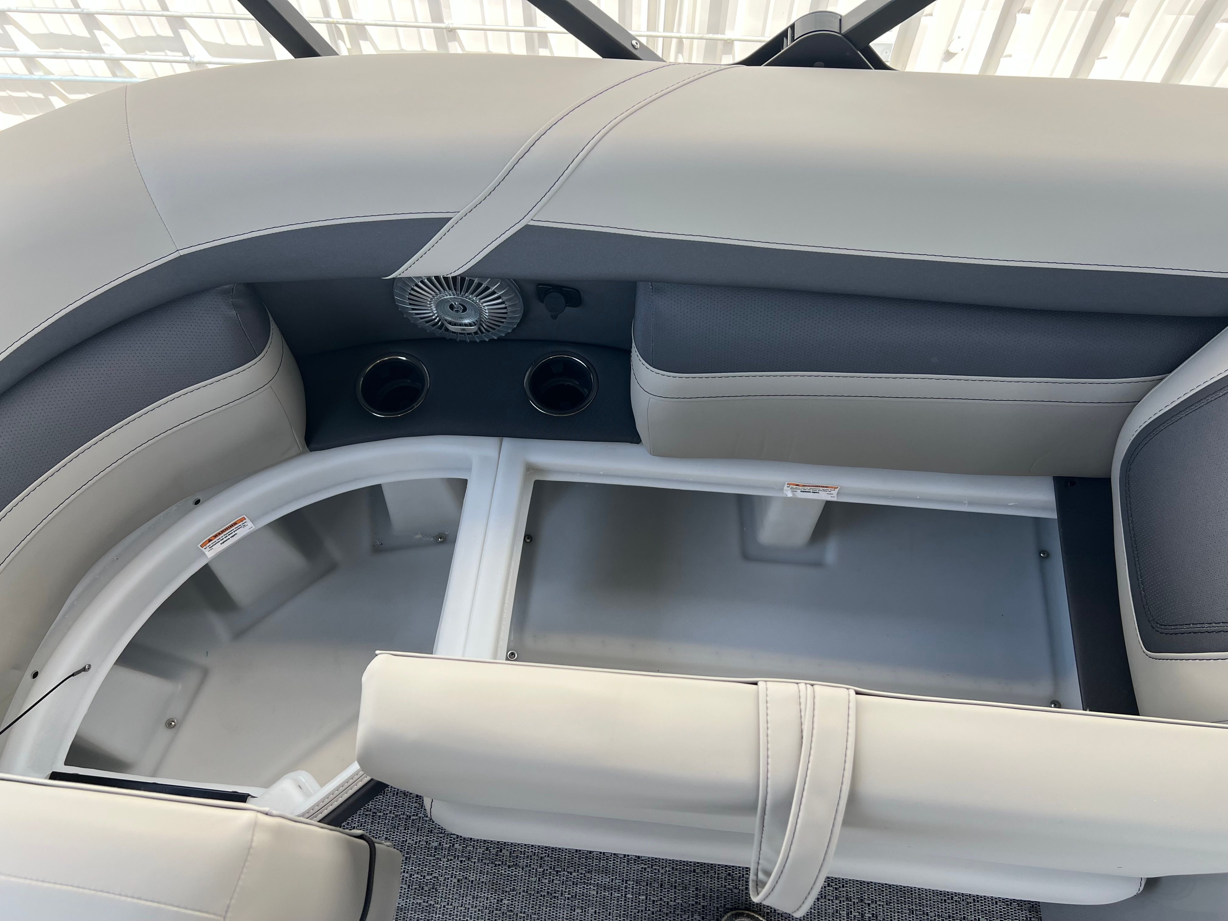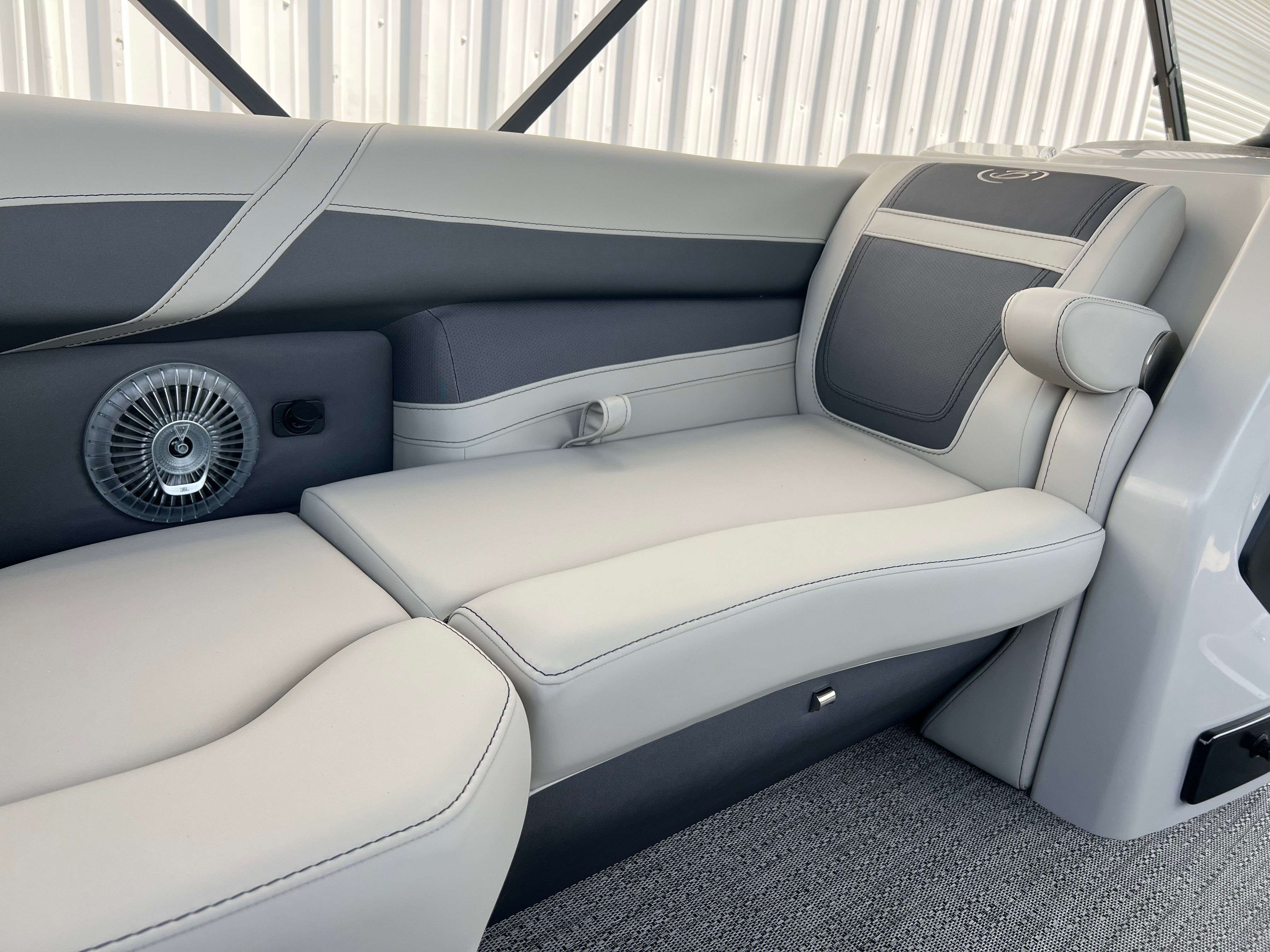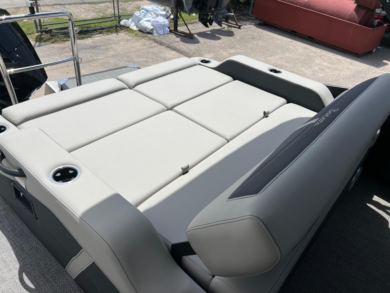 This new pontoon boat is loaded with premium features designed to enhance your time on the water. The Triple Toon Package with midship storage on the Cabrio model provides increased stability, improved handling, and extra space for all your gear. The double bimini canvas offers versatile shade options, allowing you to relax in comfort no matter the weather. The meticulously crafted furniture in Marquesan Gray with Charcoal Accent not only looks stunning but also provides plush seating for all your guests. The Amore Gray flooring is both stylish and durable, ensuring easy maintenance and a sophisticated look. With the Blackout Package Cabrio, the Matte Black Railskin color gives the boat a bold, contemporary appearance that’s sure to turn heads at the marina.
