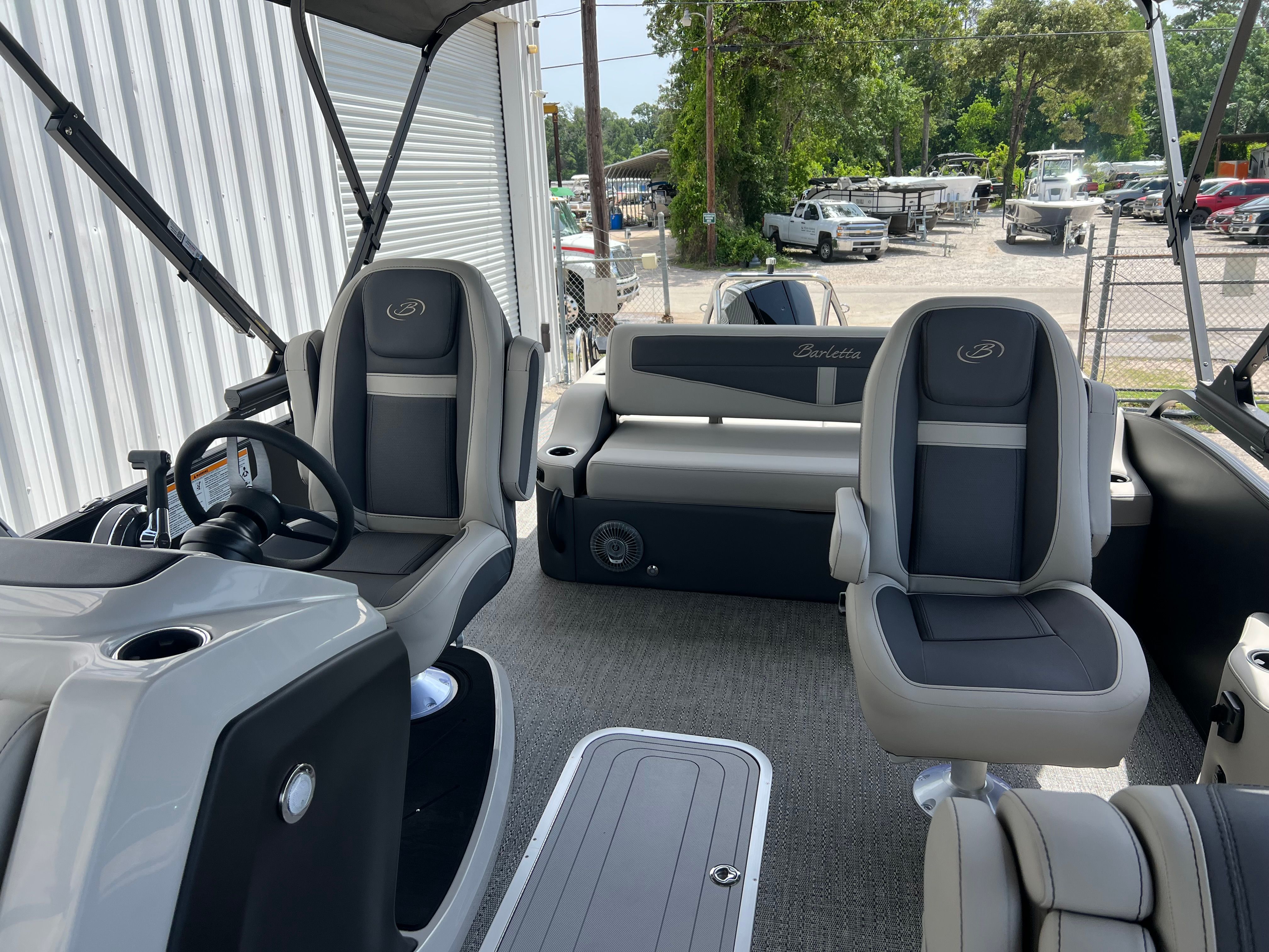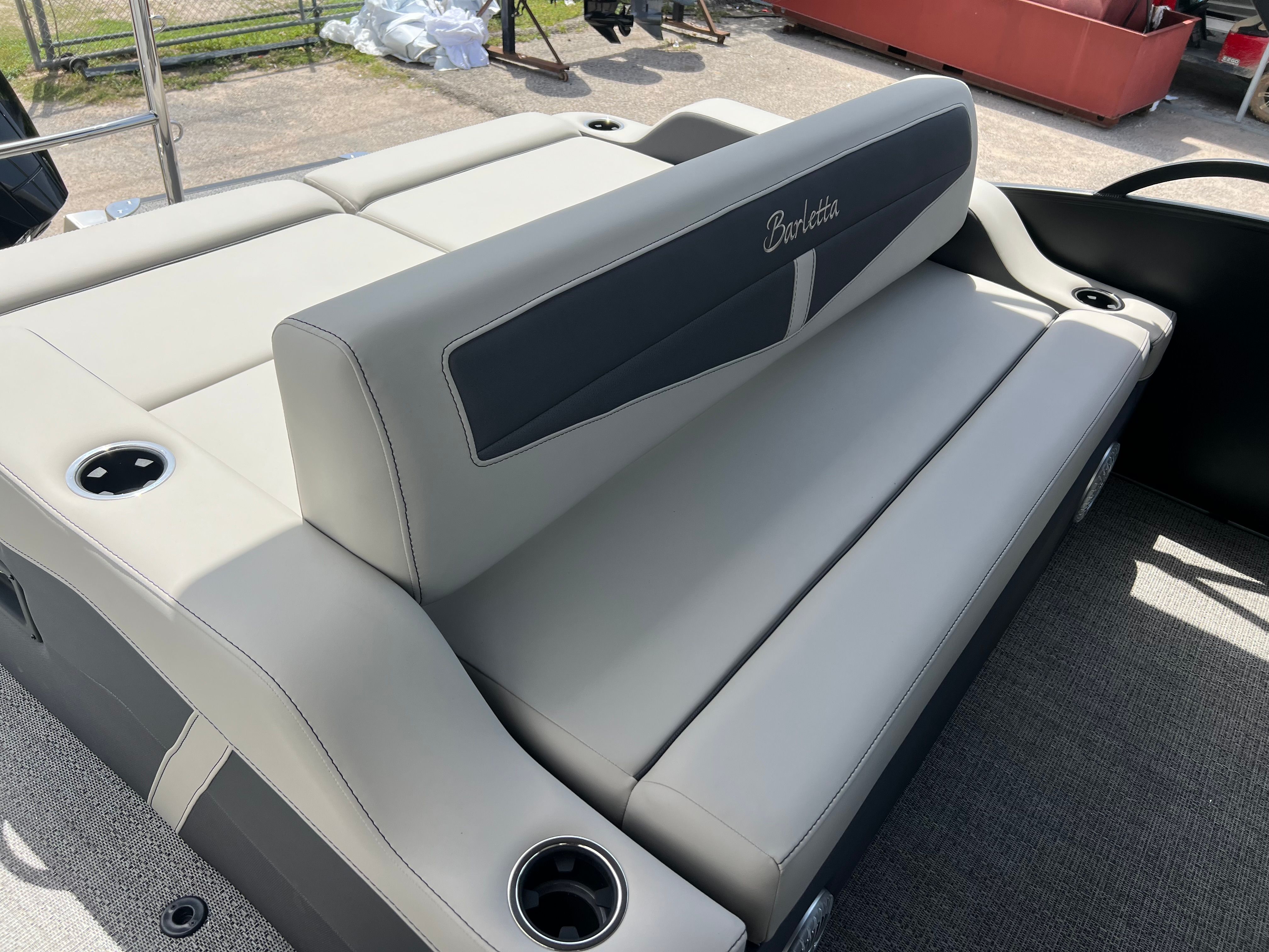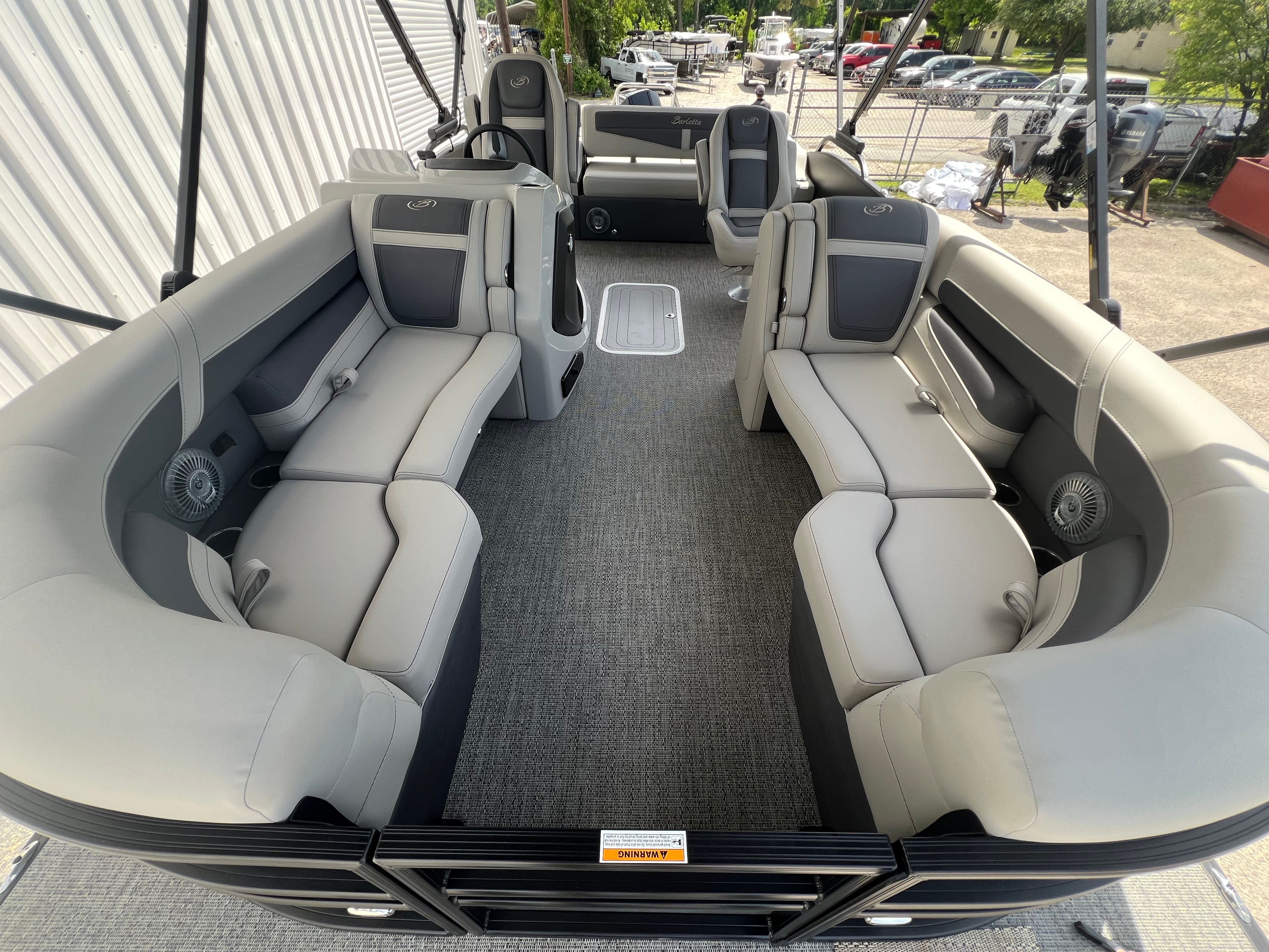This Barletta pontoon boat for sale is designed with practicality in mind. The midship storage in the Triple Toon Package offers convenient space for life jackets, water toys, and other essentials, keeping the deck clutter-free and organized. The Power Assist Steering makes docking and maneuvering effortless, even for novice boaters. The durable Amore Gray flooring is easy to clean and maintain, ensuring your boat stays looking its best season after season. Fuel efficiency is enhanced by the advanced Mercury FourStroke engine, allowing you to spend more time enjoying the water and less time refueling. The double bimini canvas provides flexible shade options, making it easy to adapt to changing weather conditions and keep everyone comfortable.