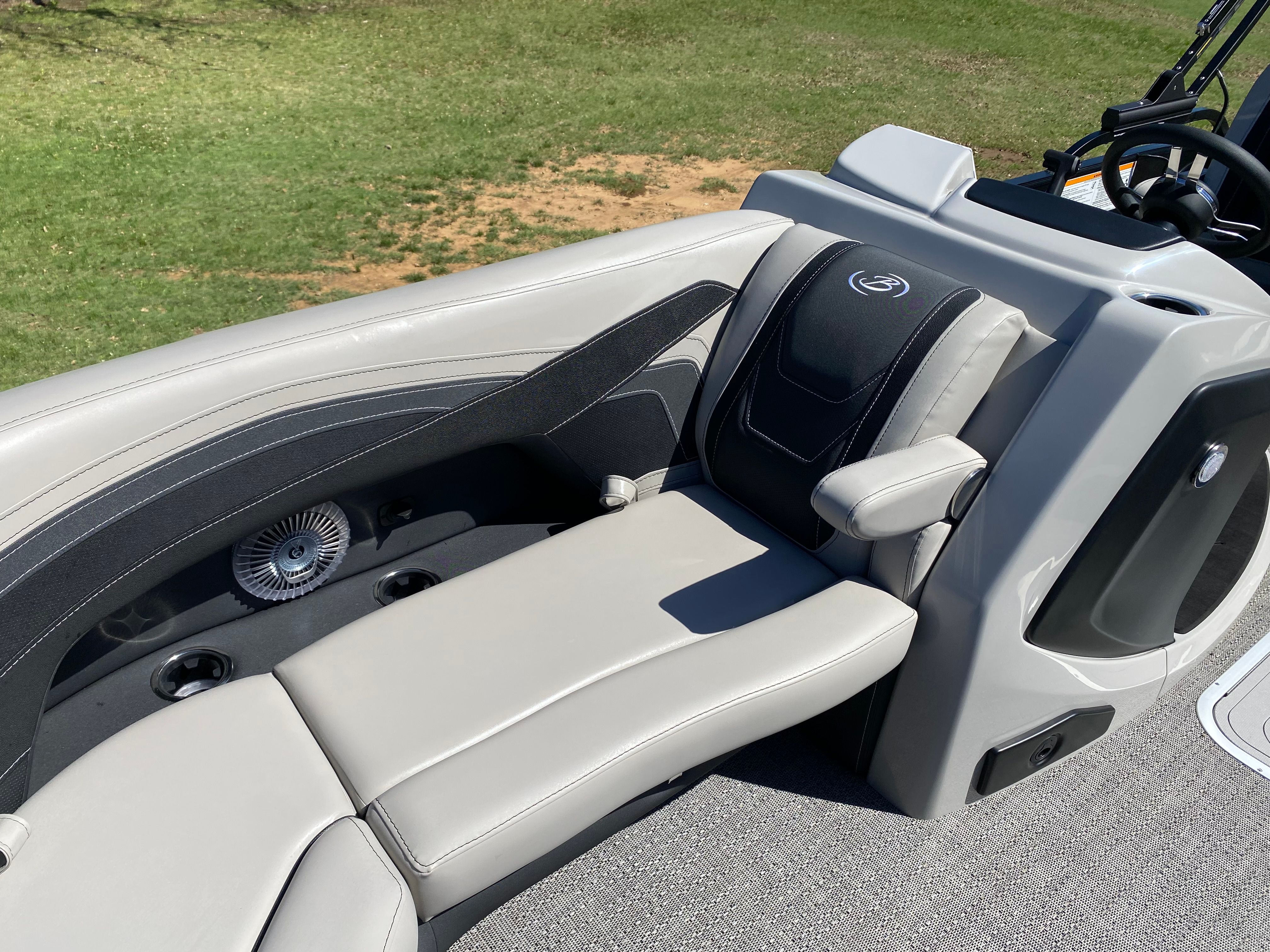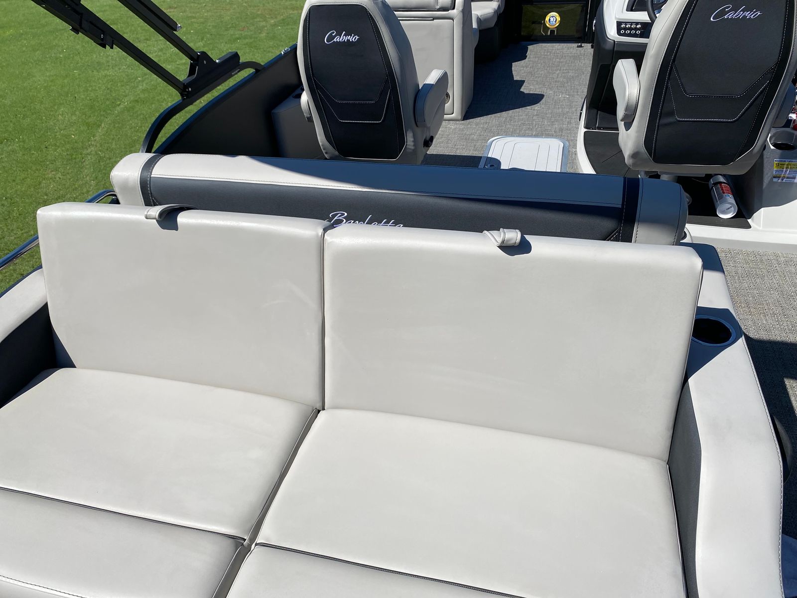 Step aboard the Cabrio C22UC and you’ll immediately notice the attention to detail in its design and amenities. The furniture is finished in Marquesan Gray with Onyx accents, providing a sophisticated and inviting atmosphere. The flooring is Amore Gray, adding a touch of elegance while being durable and easy to maintain. The triple toon package not only boosts performance but also includes convenient midship storage, perfect for stowing gear, water toys, or picnic supplies.The onboard battery charger supports two batteries, ensuring you have reliable power for all your electronics and accessories throughout your day on the water. The Blackout Package Cabrio gives the boat a sleek, modern aesthetic, while the Railskin Color and accent choices make it uniquely stylish. Every element of the Cabrio C22UC is crafted to enhance your boating experience, from the plush seating to the thoughtful storage solutions.