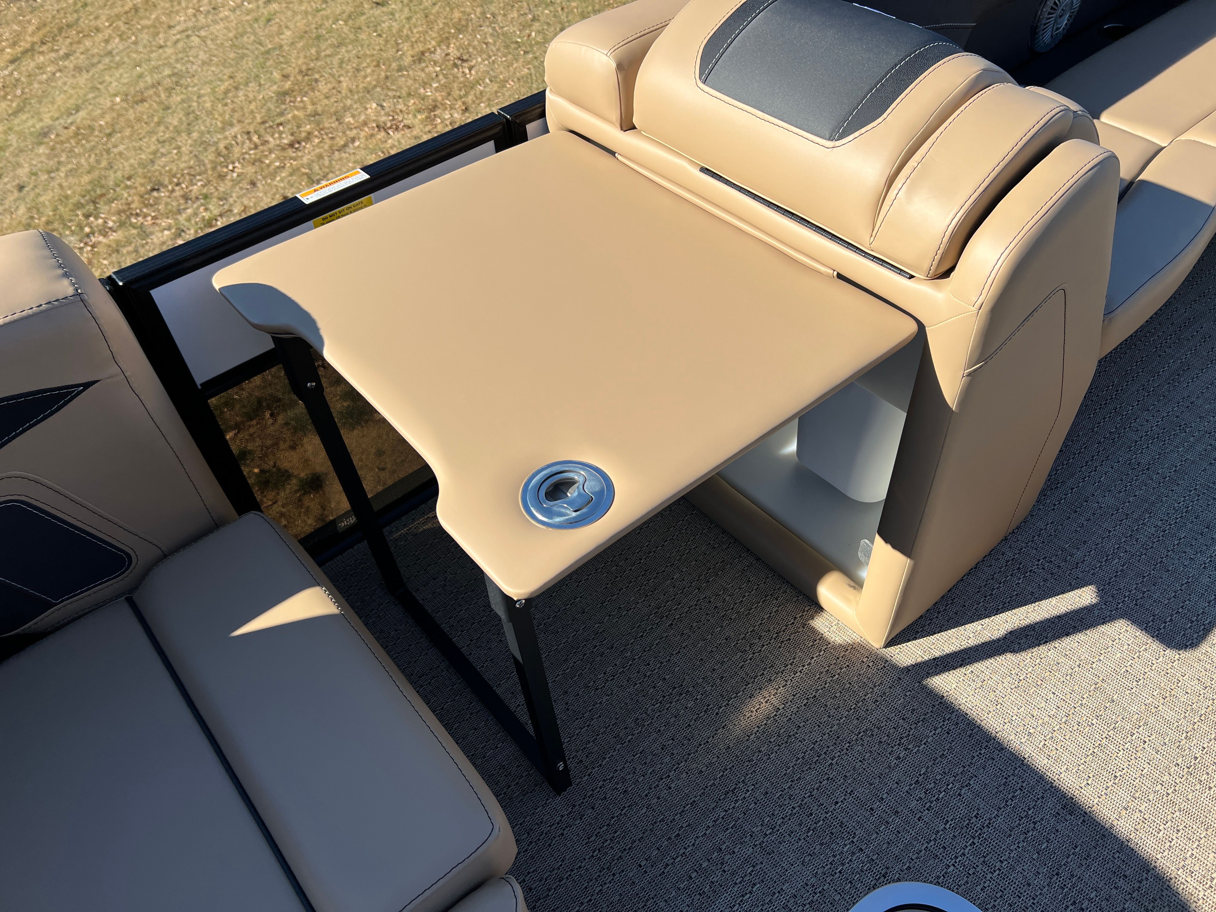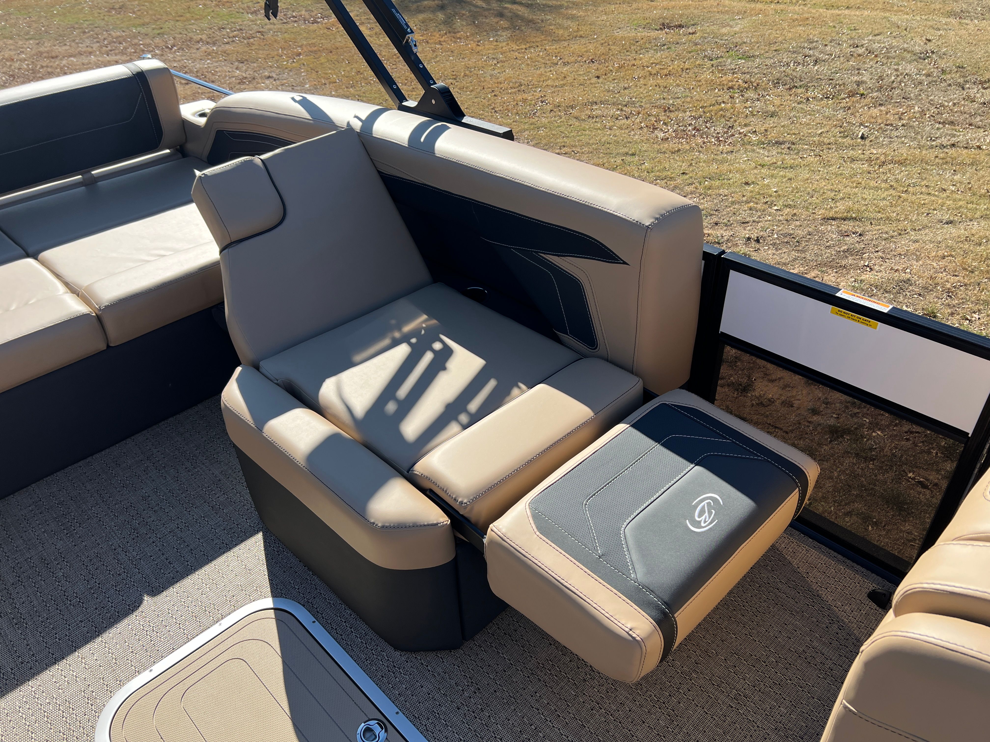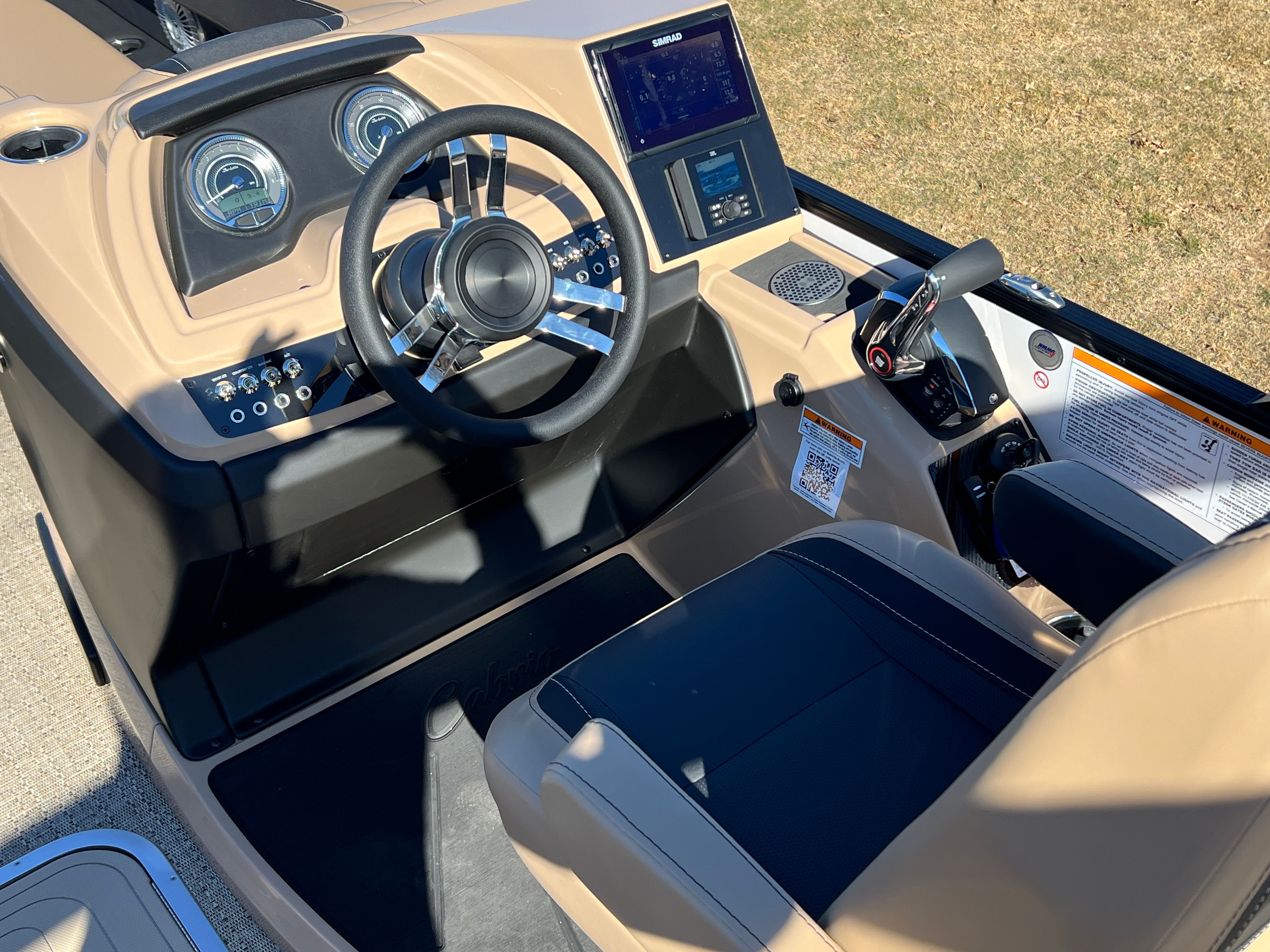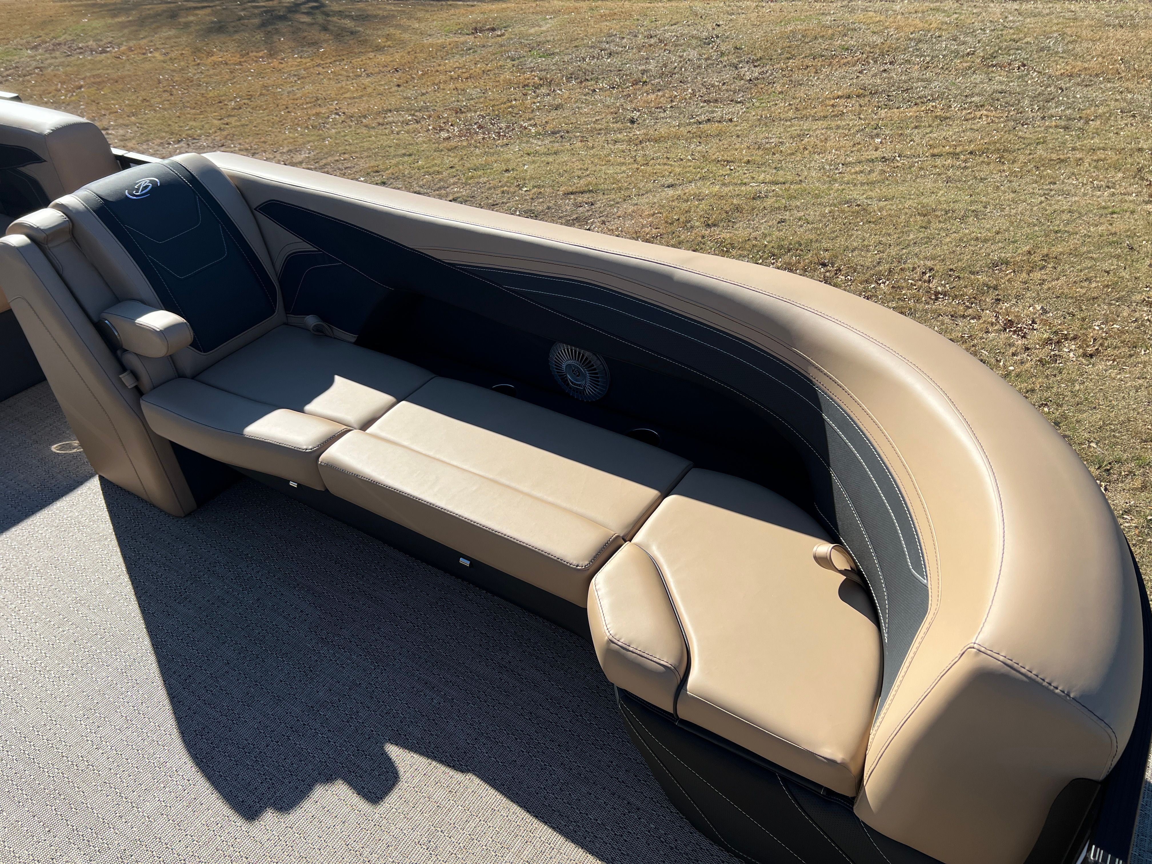 Step aboard the Barletta Cabrio C24U and you are greeted by a luxurious interior featuring Carmella Tan furniture with Onyx accents, creating an inviting and upscale atmosphere. The Amore Tan flooring not only adds to the visual appeal but also provides a comfortable and slip-resistant surface underfoot. The Blackout Package Cabrio, combined with the Black Diamond railskin and Winter White accent, gives this pontoon a distinctive and sophisticated look. The Triple Toon Package with midship storage offers ample space for stowing gear, water toys, and other essentials, keeping the deck uncluttered and organized. The boat is protected with Metal Jacket Protectant, ensuring its finish remains pristine and resistant to the elements.