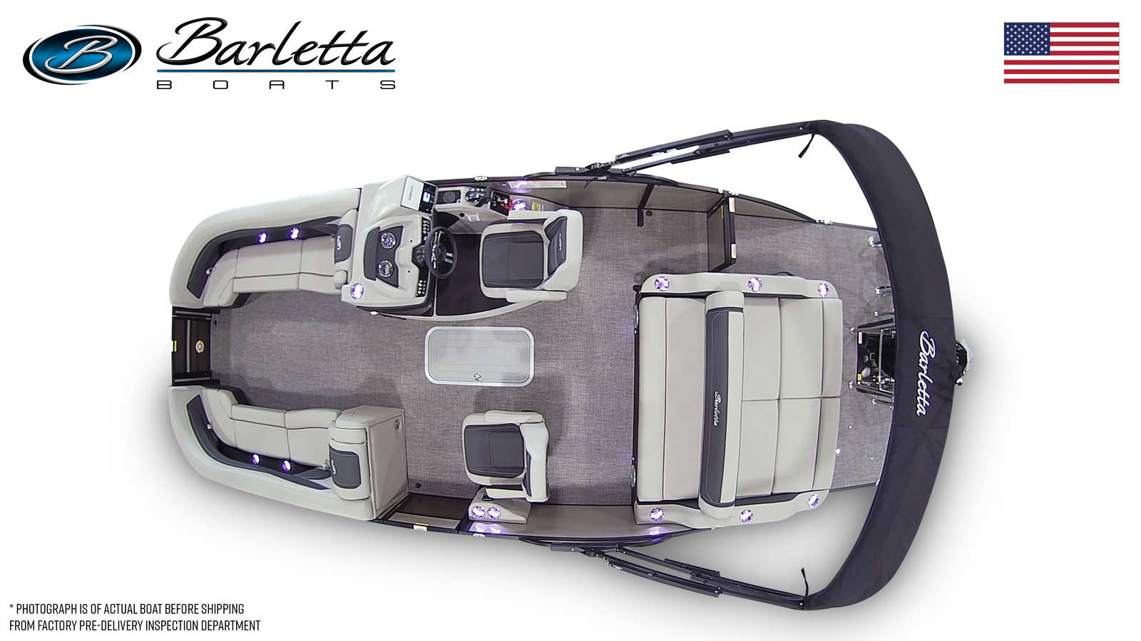 The 2026 Barletta Cabrio C24UC is packed with features designed to enhance your boating experience. The triple toon package with midship storage provides added stability, buoyancy, and ample space for storing gear, water toys, or picnic essentials. The Marquesan Gray with Onyx furniture offers a sophisticated and comfortable seating arrangement, perfect for lounging or entertaining guests. The Amore Gray flooring is both stylish and practical, providing a slip-resistant surface that is easy to clean and maintain.The exterior of the Cabrio C24UC is adorned with a stainless steel flag pole and an American flag, adding a touch of patriotism and elegance to your vessel. The railskin color and accent combination, along with the Blackout Package Cabrio, create a striking visual appeal that is sure to turn heads wherever you go. Every detail, from the rigged engine with stainless steel prop to the thoughtfully designed storage solutions, reflects Barletta’s commitment to quality and innovation.