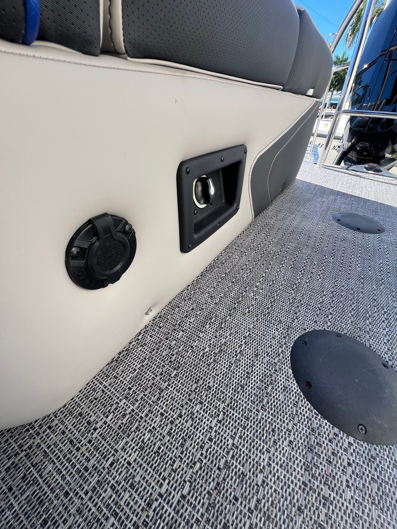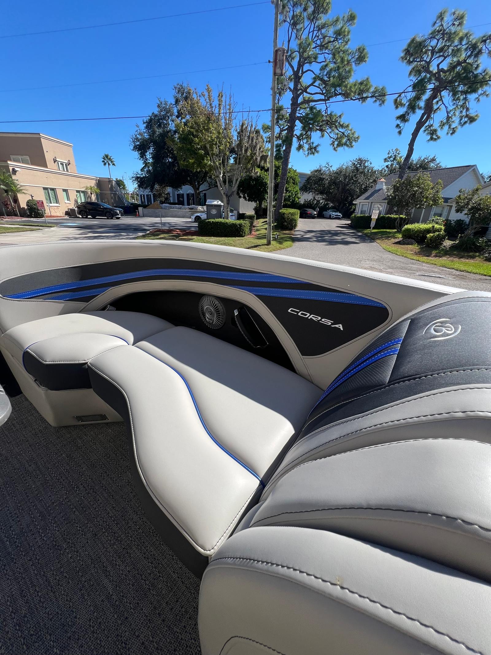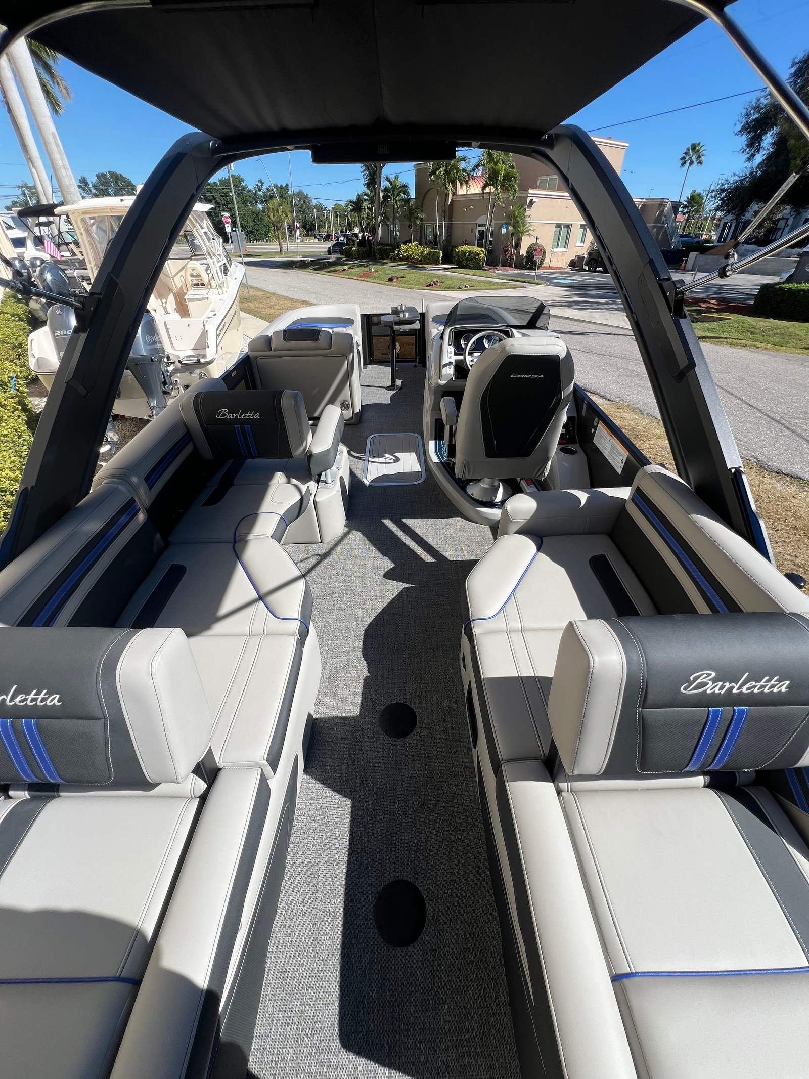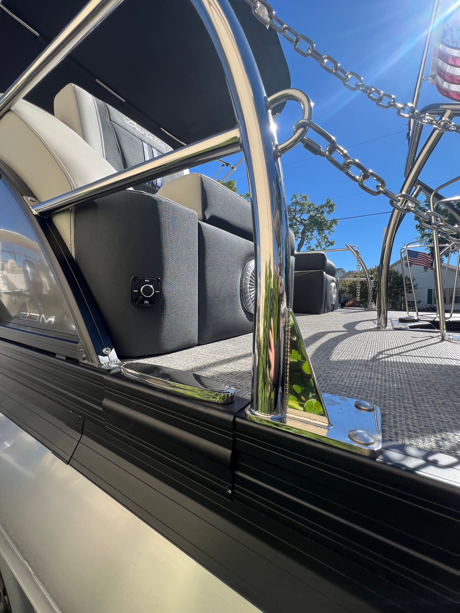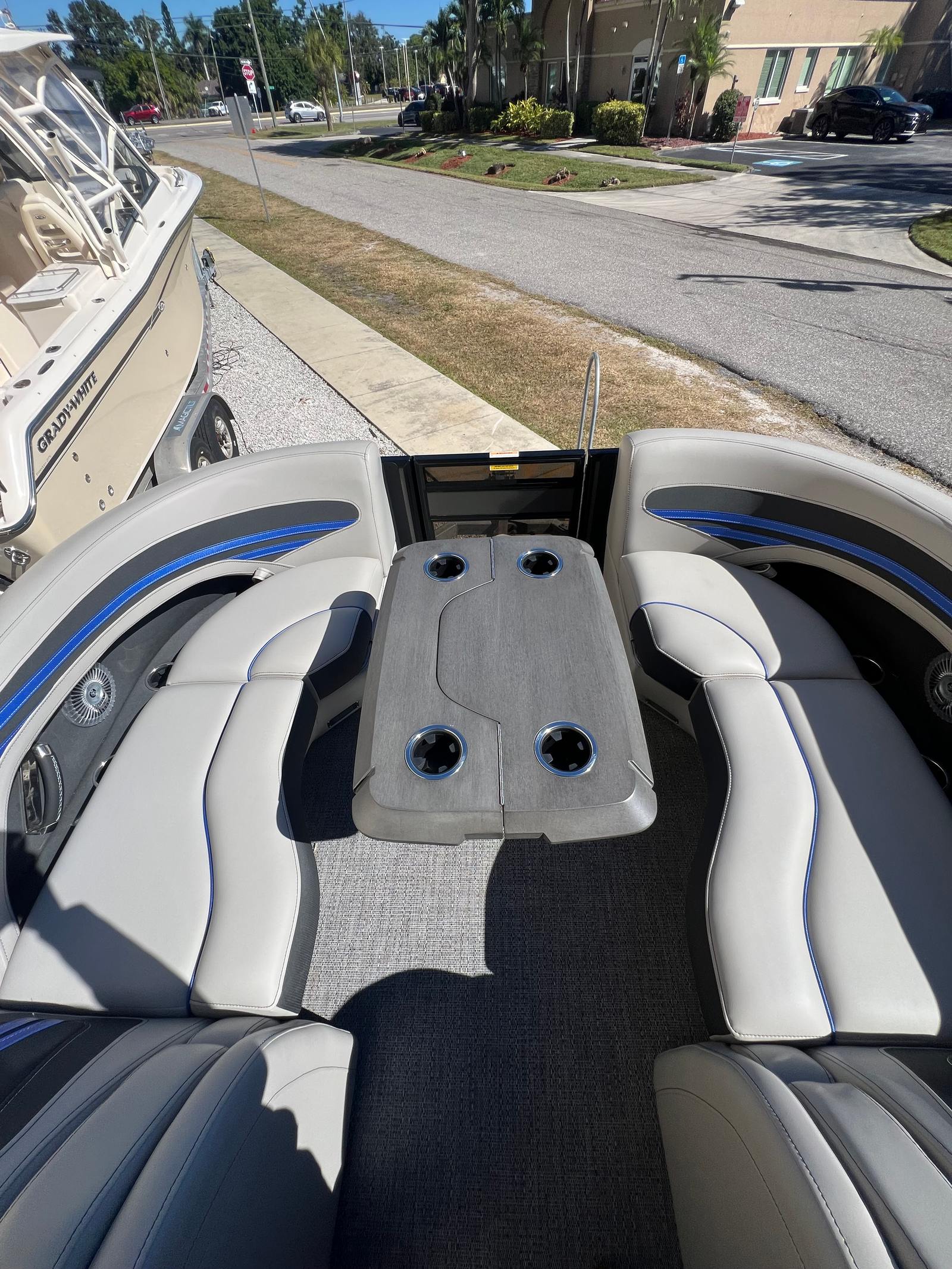 The Barletta Corsa 23MA is packed with special features that set it apart from other pontoon boats for sale. The exterior lighting includes white underdeck and underwater illumination, creating a striking visual effect during evening cruises and enhancing safety around the boat. The stainless steel flag pole with an American flag adds a touch of patriotic flair and sophistication to the vessel’s profile.Entertainment is at the forefront with the Arch Sound Bar, ensuring high-quality audio for your favorite music and enhancing the atmosphere for social gatherings. The flooring is finished in Amore Gray, providing both durability and a modern aesthetic that complements the boat’s overall design. The Blackout Package Corsa railskin package gives the exterior a sleek, contemporary look, while the Coastal Edition Corsa adds unique styling elements that make this pontoon truly distinctive.Inside, comfort is paramount. The adjustable pedestal on the captain’s chair at the helm allows for personalized seating, ensuring the captain enjoys optimal visibility and control. The furniture features Soft Touch Marquesan Gray with Blue Accent, offering plush seating and a stylish color scheme that invites relaxation. Every detail has been thoughtfully designed to maximize comfort and enjoyment for all passengers.