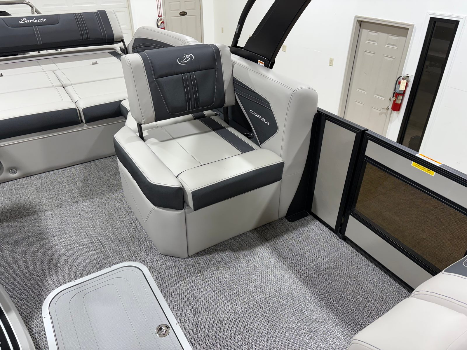The Barletta Corsa 25U is as practical as it is luxurious. Its generous length provides ample storage for all your gear, from water toys and fishing equipment to picnic supplies and extra towels. The ease of docking, thanks to the hydraulic and power assist steering, means you can confidently navigate marinas and tight spaces, making every trip stress-free. The fuel-efficient Mercury 250L Verado V8 engine allows you to spend more time on the water and less time at the fuel dock, maximizing your enjoyment and minimizing operating costs.The durable flooring and high-quality upholstery are designed to withstand the rigors of active use, ensuring that your pontoon remains in top condition for years to come. The sport bimini provides essential shade on hot days, while the stainless steel flag pole with American flag adds a touch of pride and personality to your vessel.