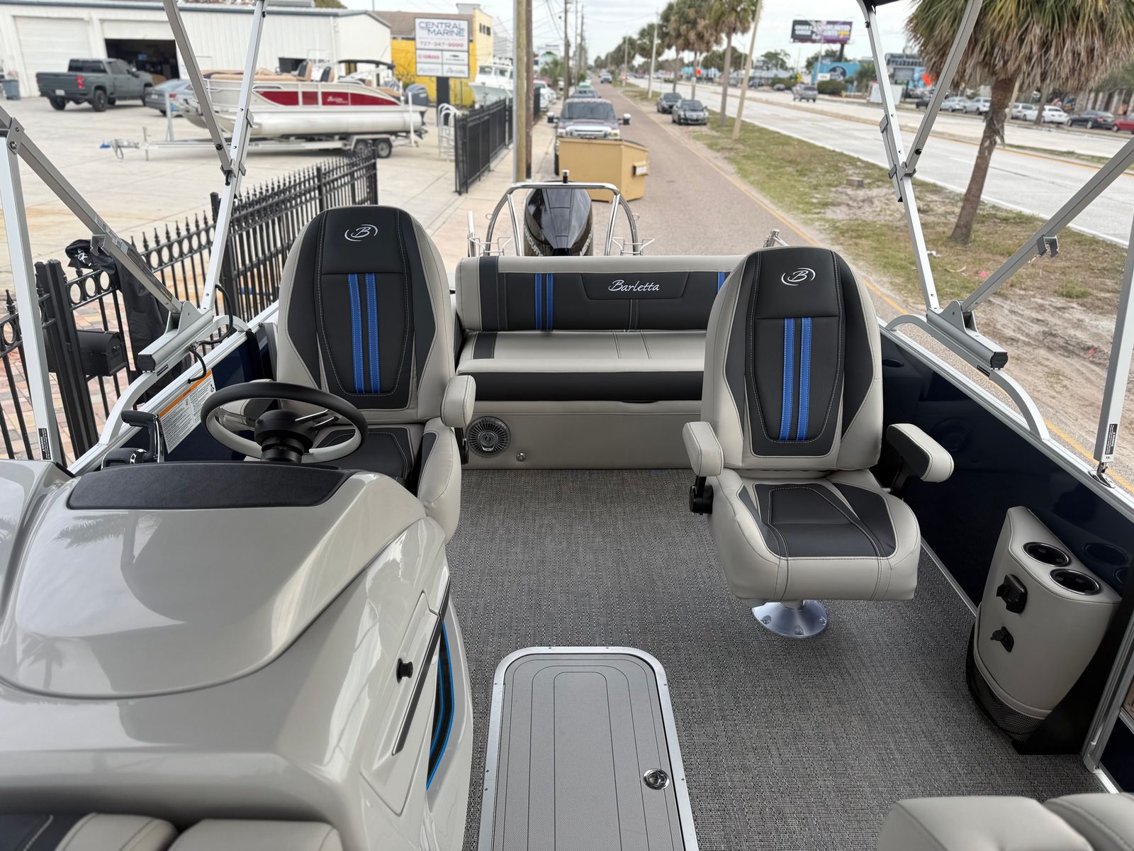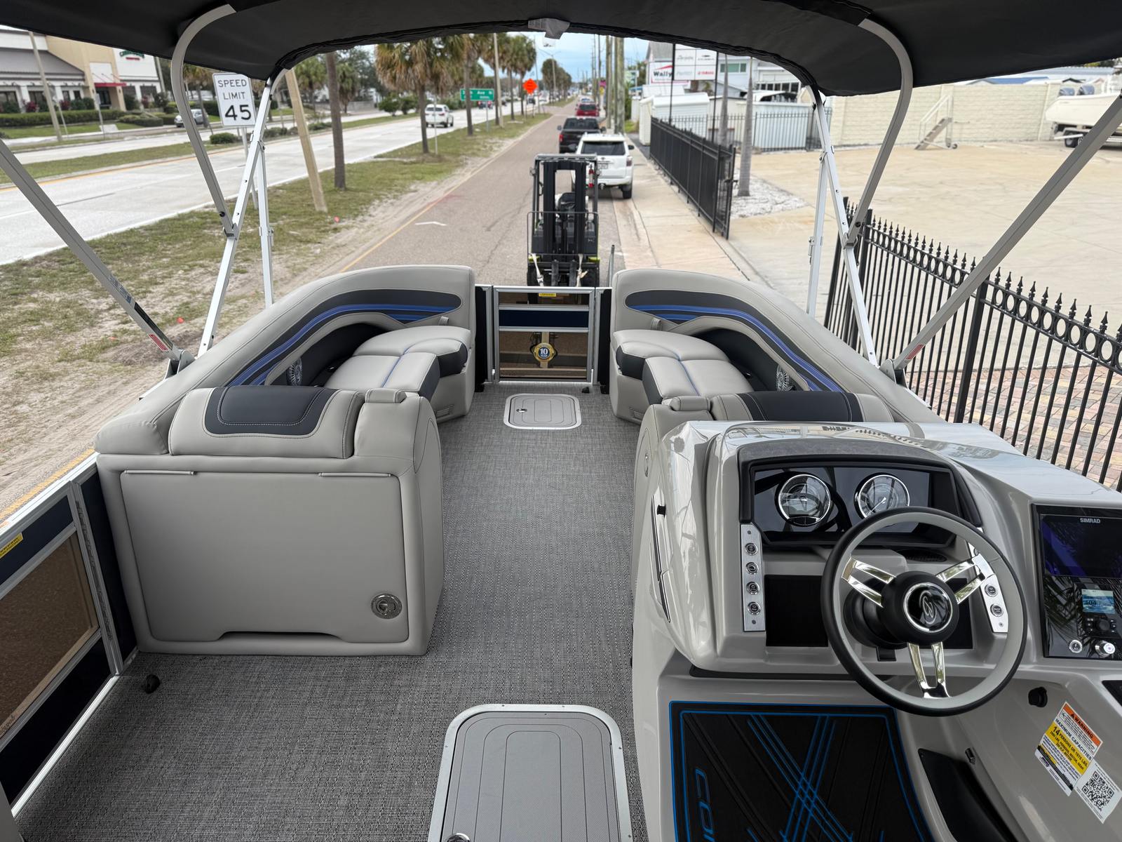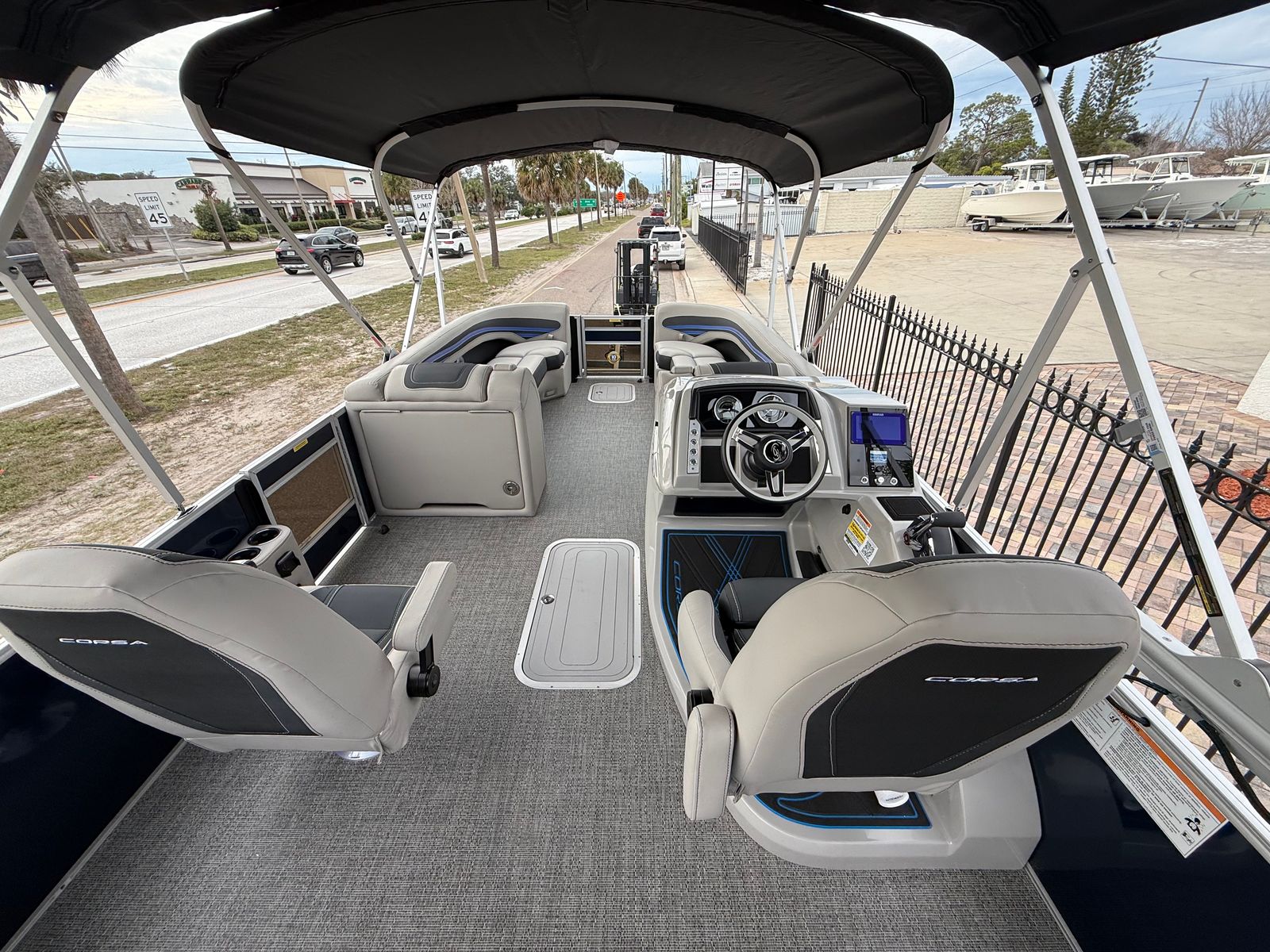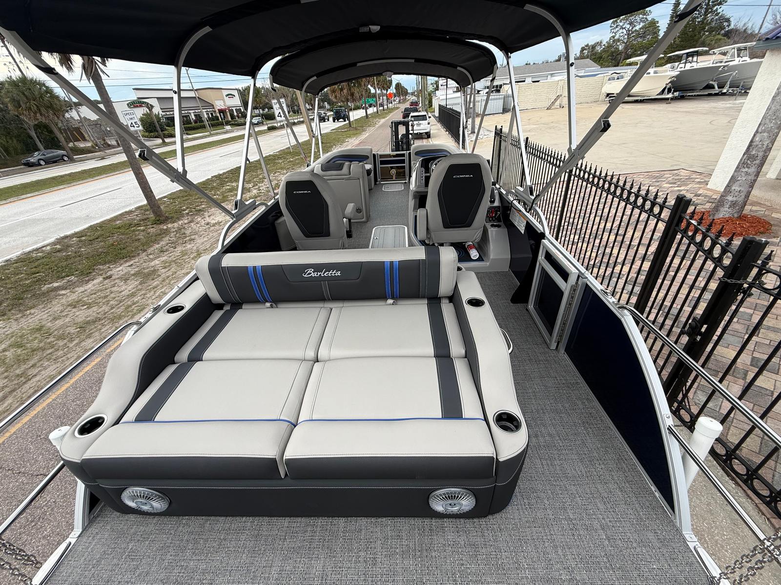 The Barletta Corsa 25UC is packed with premium features designed to elevate your boating experience. The double bimini setup, including an additional power bimini, provides ample shade and protection from the sun, allowing you to relax in comfort no matter the weather. The onboard battery charger with two batteries ensures reliable power for all your electronics and accessories, so you can stay connected and entertained on the water.The Coastal Edition Corsa package enhances the boat’s versatility and durability, making it ideal for a wide range of environments. The combination of Blue Sapphire and Winter White Railskin colors, along with the Marquesan Gray furniture and Amore Gray flooring, creates a cohesive and inviting atmosphere that’s perfect for socializing, lounging, or celebrating special occasions.