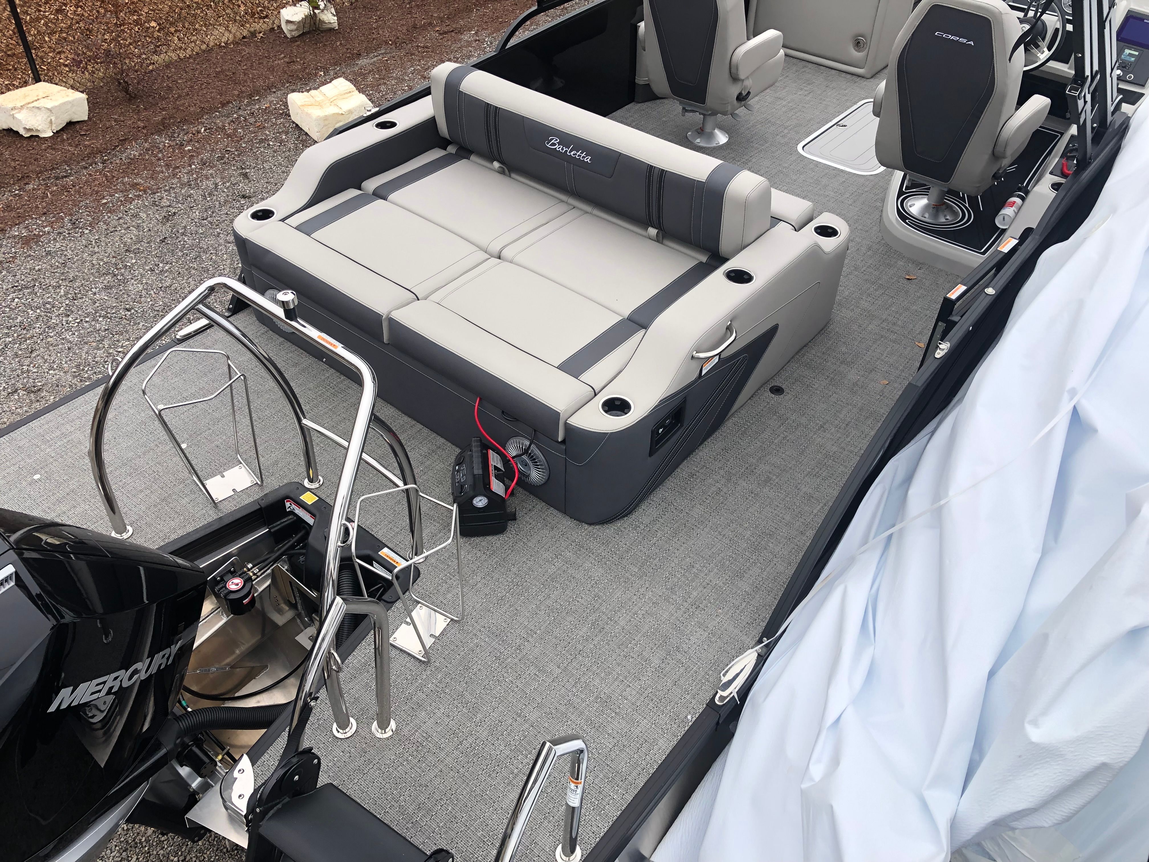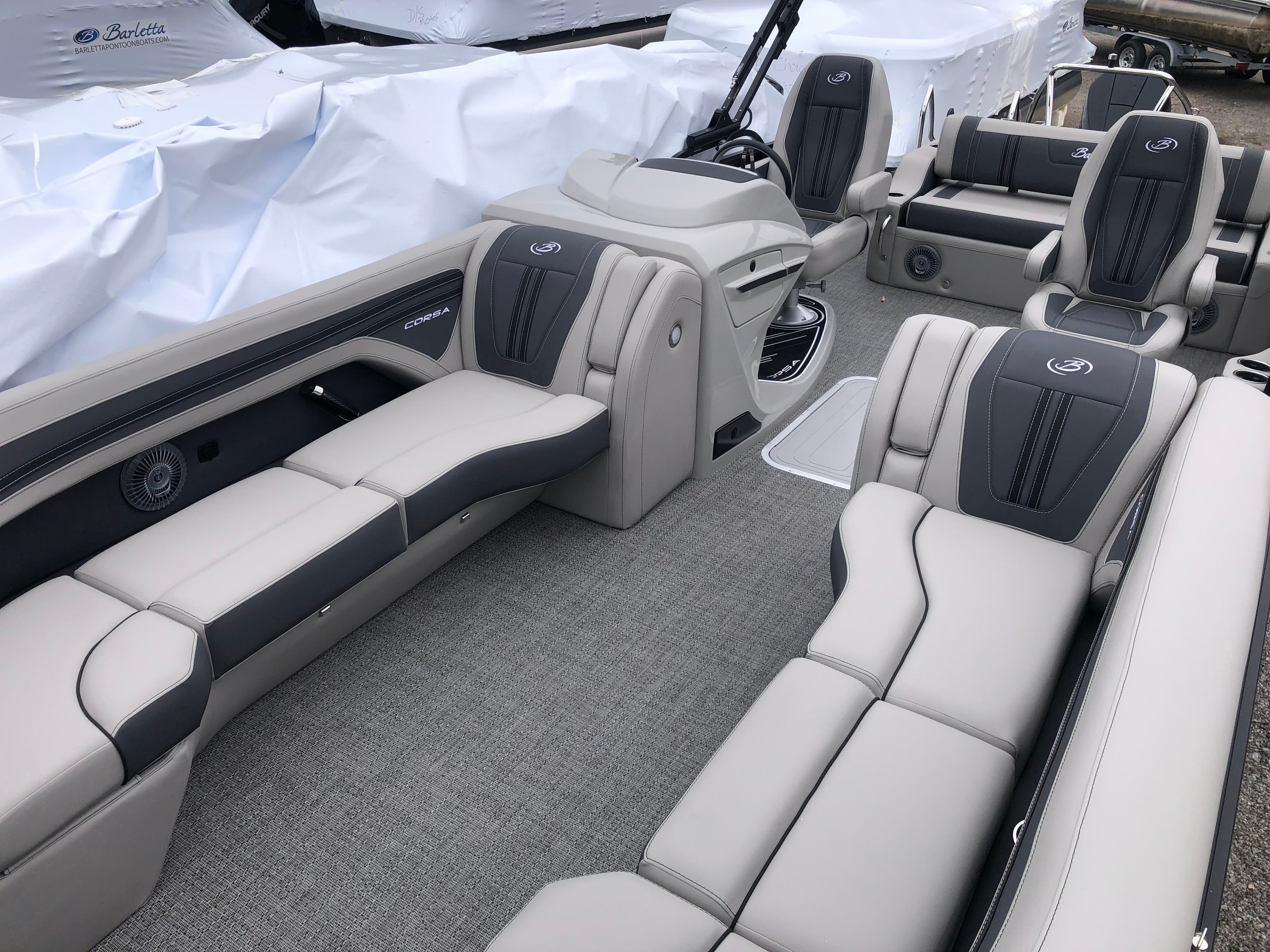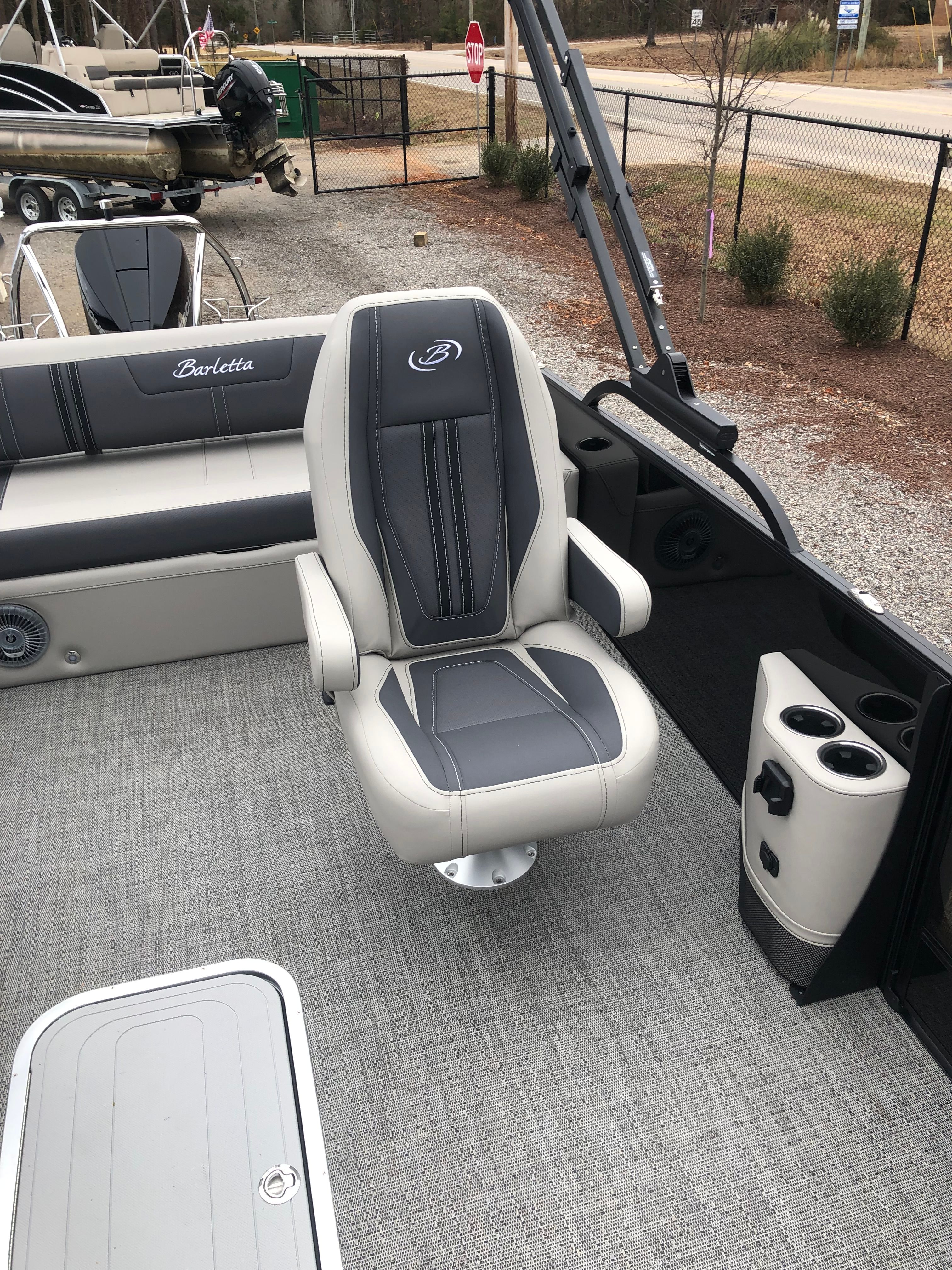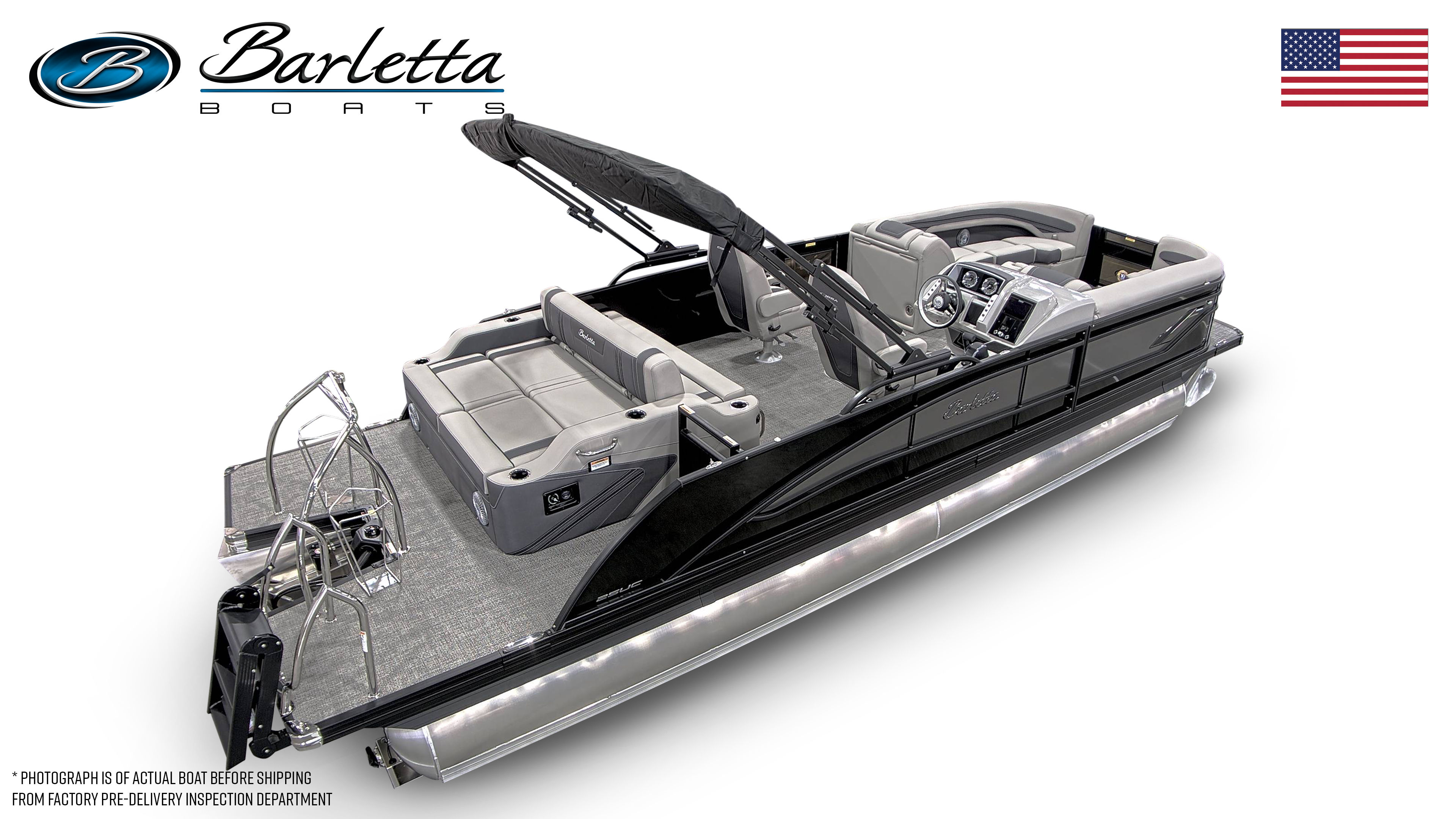 The 2025 Barletta Corsa 25UC is packed with features designed to maximize comfort, convenience, and style. The Soft Touch Marquesan Gray furniture with Carbon Accent creates a plush, inviting atmosphere, perfect for relaxing or entertaining guests. Amore Gray flooring adds a touch of elegance while providing durability and easy maintenance. The Triple Toon Package with midship storage not only boosts performance but also offers practical storage solutions for all your gear, making it easy to keep the deck organized and clutter-free. The exterior is adorned with a stainless steel flag pole and American flag, adding a patriotic touch and enhancing the boat’s overall appeal. Rigging includes a drop ship engine with no prop, ensuring you have the flexibility to customize your setup as desired.
