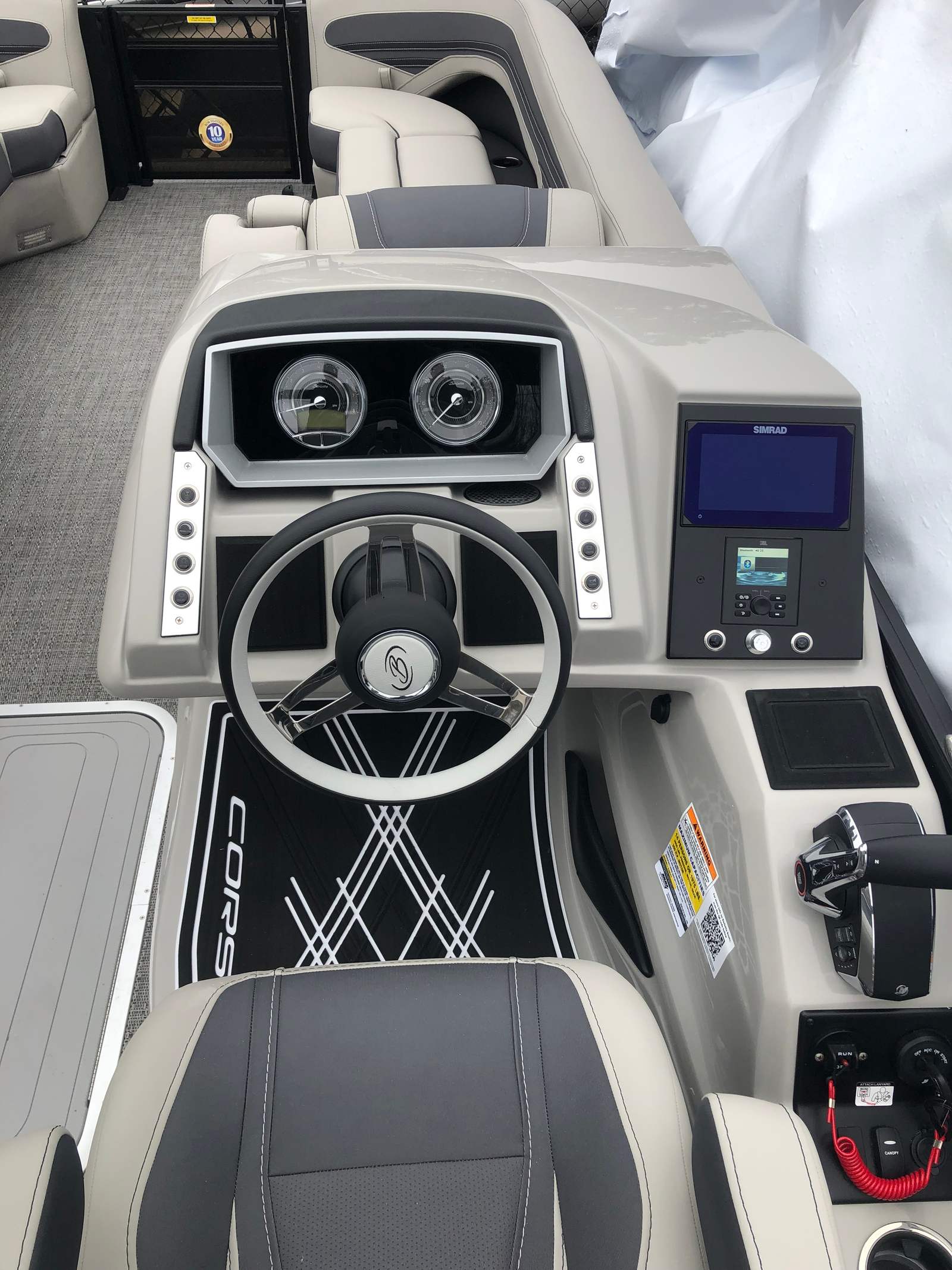 Power and precision come together in the Corsa 25UC, thanks to its Mercury (D) 300L Verado V8 engine. With a robust 300 horsepower at your command, this pontoon boat for sale offers exhilarating acceleration, smooth cruising, and reliable performance for all your adventures. The Mercury Digital DTS Pre-Rig for VERADO engines with Vessel Link ensures seamless integration and responsive control, while hydraulic and power assist steering make handling effortless, even in challenging conditions. Digital gauges provide real-time feedback, allowing you to monitor performance metrics and enjoy peace of mind as you navigate lakes, rivers, or coastal waters. The Triple Toon Package with midship storage enhances stability and maneuverability, delivering a smooth ride and superior handling that sets the Corsa 25UC apart from other pontoon boats.