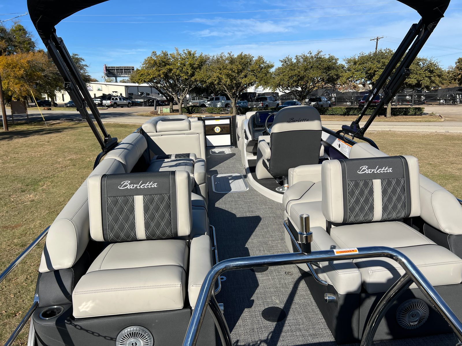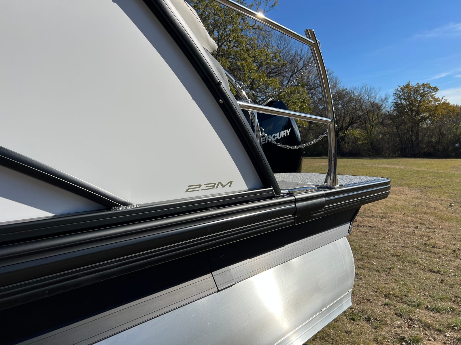 The 2026 Barletta Lusso L23M stands out as a premier pontoon boat, boasting a generous length of 25.5 feet. This spacious design provides ample room for family and friends, making it ideal for entertaining, cruising, or simply soaking up the sun. As a new model, the Lusso L23M showcases Barletta’s commitment to quality craftsmanship and innovative design, ensuring every outing is a memorable experience. The sleek exterior features a sophisticated Sweep Color in Winter White, complemented by an Accent Color in Pacific Matte Blue, creating a striking presence on any waterway. The Blackout Package Lusso railskin adds a modern, upscale touch, while the Marquesan Gray with Onyx furniture and Amore Gray flooring deliver a refined and inviting atmosphere.