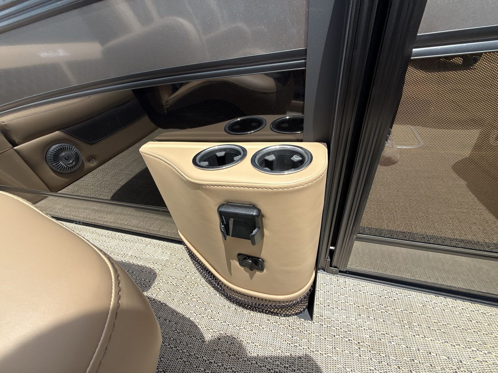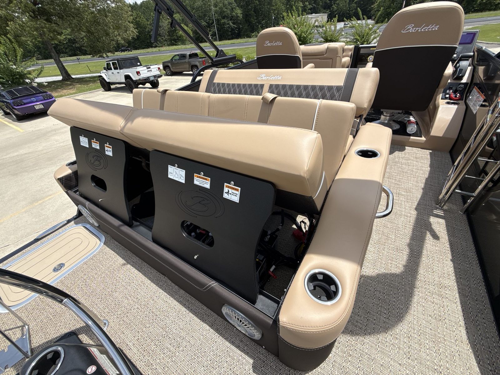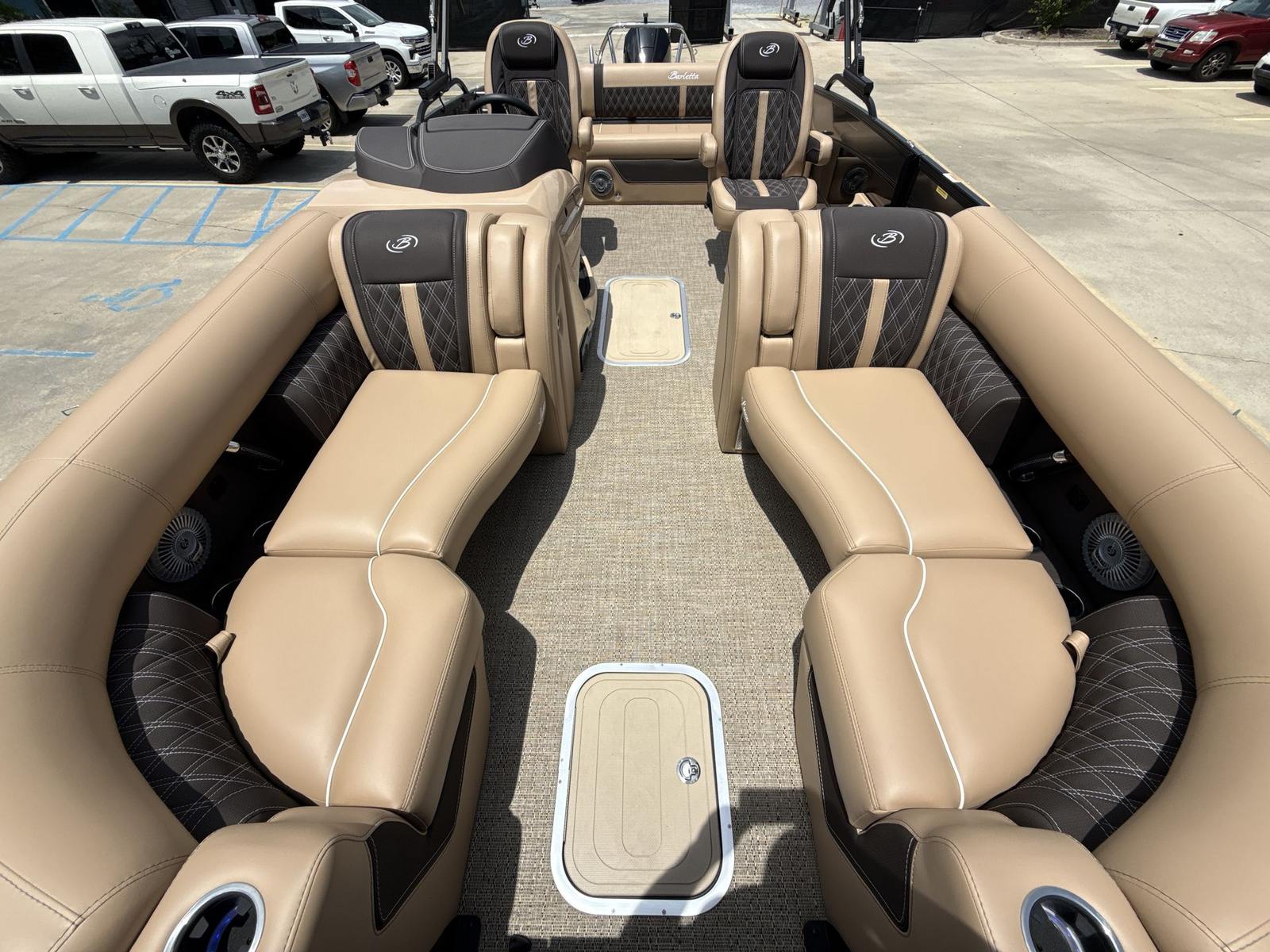 The Barletta Lusso L23UC is loaded with features that elevate your boating experience to new heights. The exterior boasts a sophisticated Sweep Color in Gray Moonstone, complemented by a striking Black Diamond accent color. The Blackout Package Lusso railskin package adds a bold, modern touch, ensuring your pontoon turns heads wherever you go. The Metal Jacket Protectant on the exterior provides an extra layer of durability, helping to keep your boat looking pristine season after season.Step aboard and you’ll be greeted by luxurious Carmella Tan with Bison furniture, offering plush comfort and a refined aesthetic. The Amore Tan flooring is both stylish and practical, providing a soft, slip-resistant surface underfoot. The captain’s chair features an adjustable pedestal, allowing you to find the perfect position for long days at the helm. Digital gauges provide clear, real-time information, while the rigging includes a stainless steel prop for optimal performance and longevity.