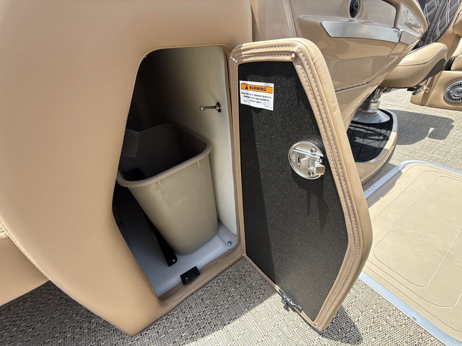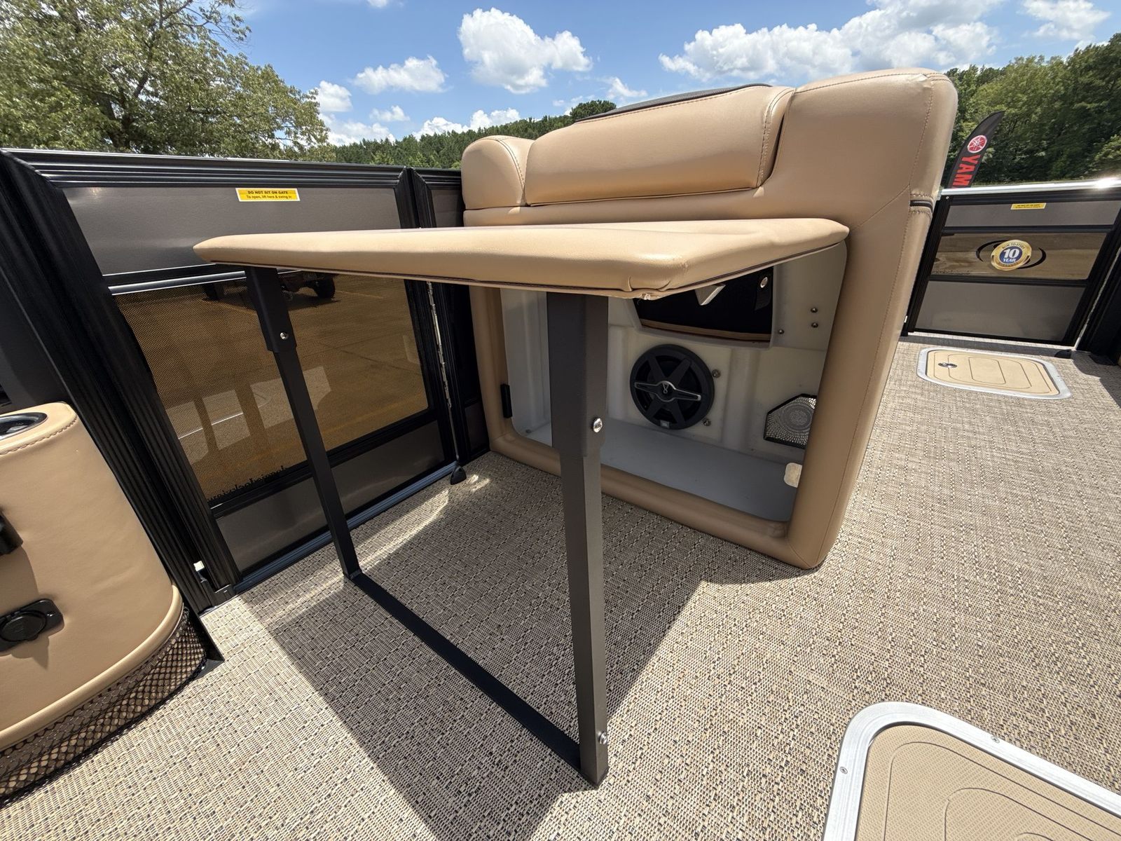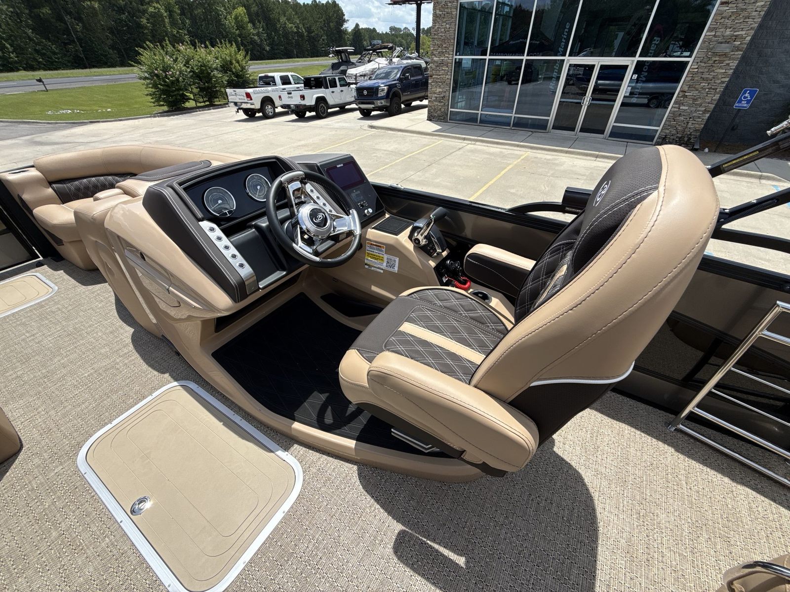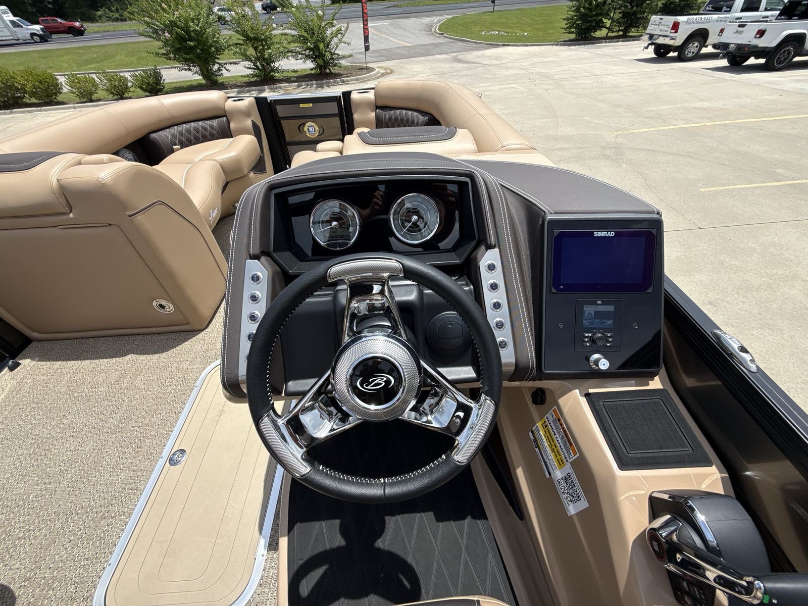 The Barletta Lusso L23UC is loaded with features that elevate your boating experience to new heights. The exterior boasts a sophisticated Sweep Color in Gray Moonstone, complemented by a striking Black Diamond accent color. The Blackout Package Lusso railskin package adds a bold, modern touch, ensuring your pontoon turns heads wherever you go. The Metal Jacket Protectant on the exterior provides an extra layer of durability, helping to keep your boat looking pristine season after season.Step aboard and you’ll be greeted by luxurious Carmella Tan with Bison furniture, offering plush comfort and a refined aesthetic. The Amore Tan flooring is both stylish and practical, providing a soft, slip-resistant surface underfoot. The captain’s chair features an adjustable pedestal, allowing you to find the perfect position for long days at the helm. Digital gauges provide clear, real-time information, while the rigging includes a stainless steel prop for optimal performance and longevity.