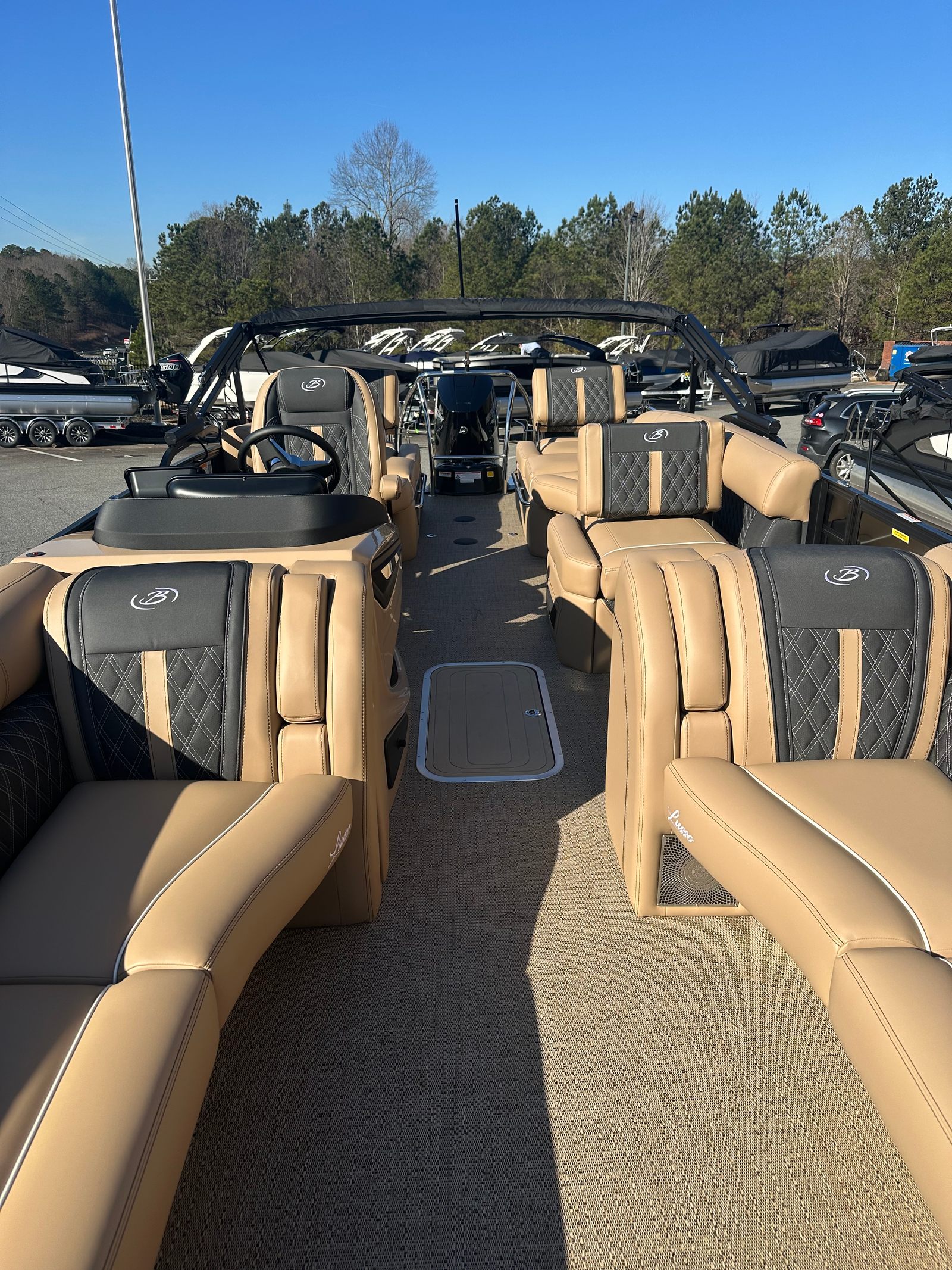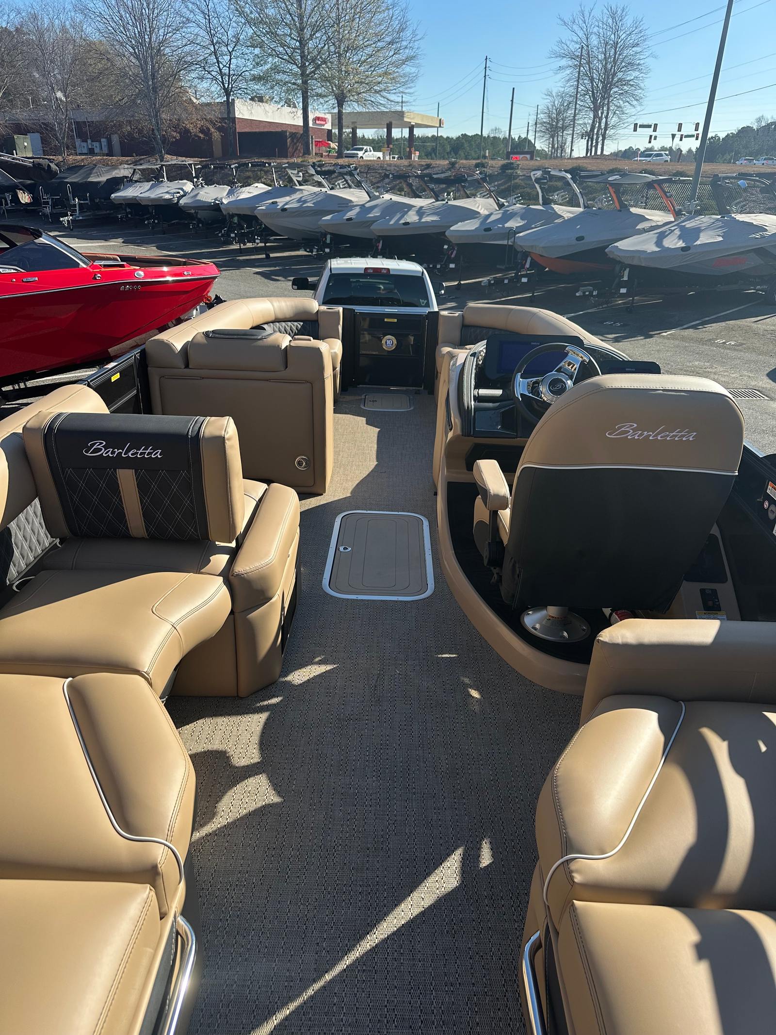 The 2026 Barletta Lusso L25M is loaded with premium features that set it apart from other pontoon boats for sale. The Black Diamond sweep and accent colors, combined with the Blackout Package Lusso railskin, create a bold and sophisticated exterior. Inside, the Carmella Tan with Onyx furniture provides a luxurious and inviting atmosphere, perfectly complemented by the Amore Tan flooring. The bolster seat, replacing the traditional captain's chair, offers enhanced comfort and support, ensuring that every journey is as enjoyable as possible. The onboard battery charger with two batteries ensures you have reliable power for all your onboard electronics and accessories, adding to the boat's convenience and functionality.