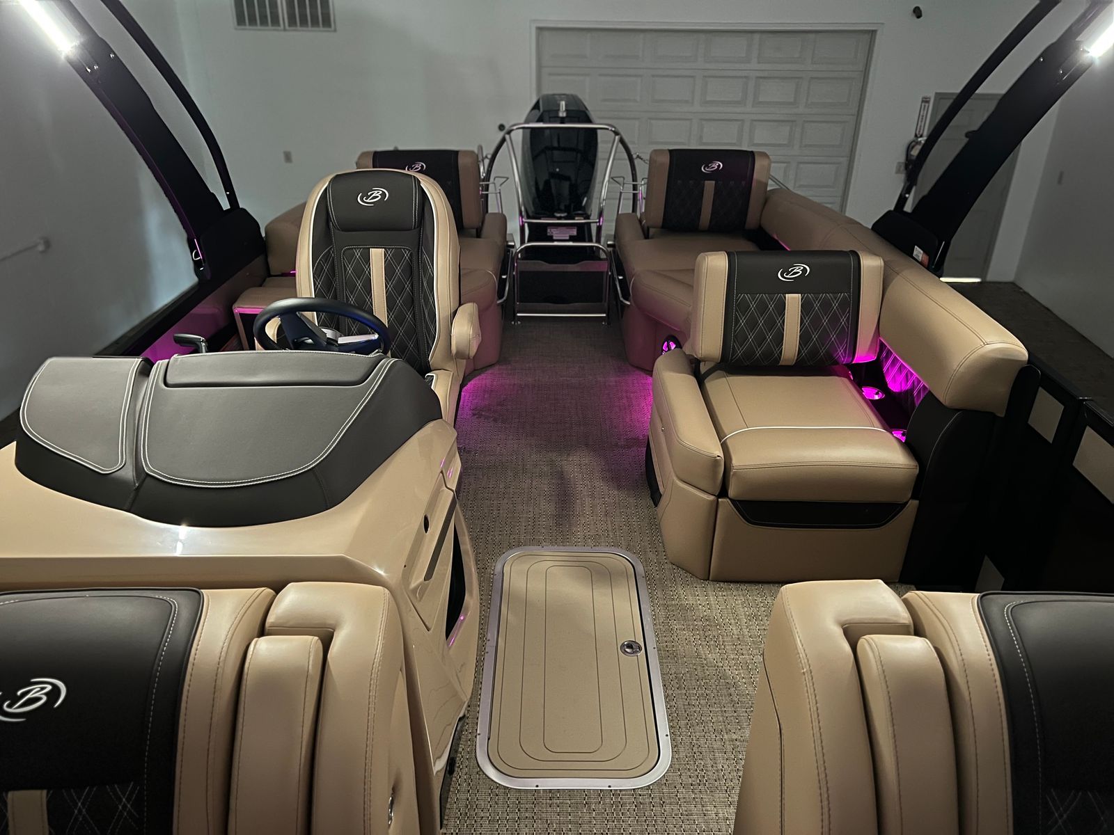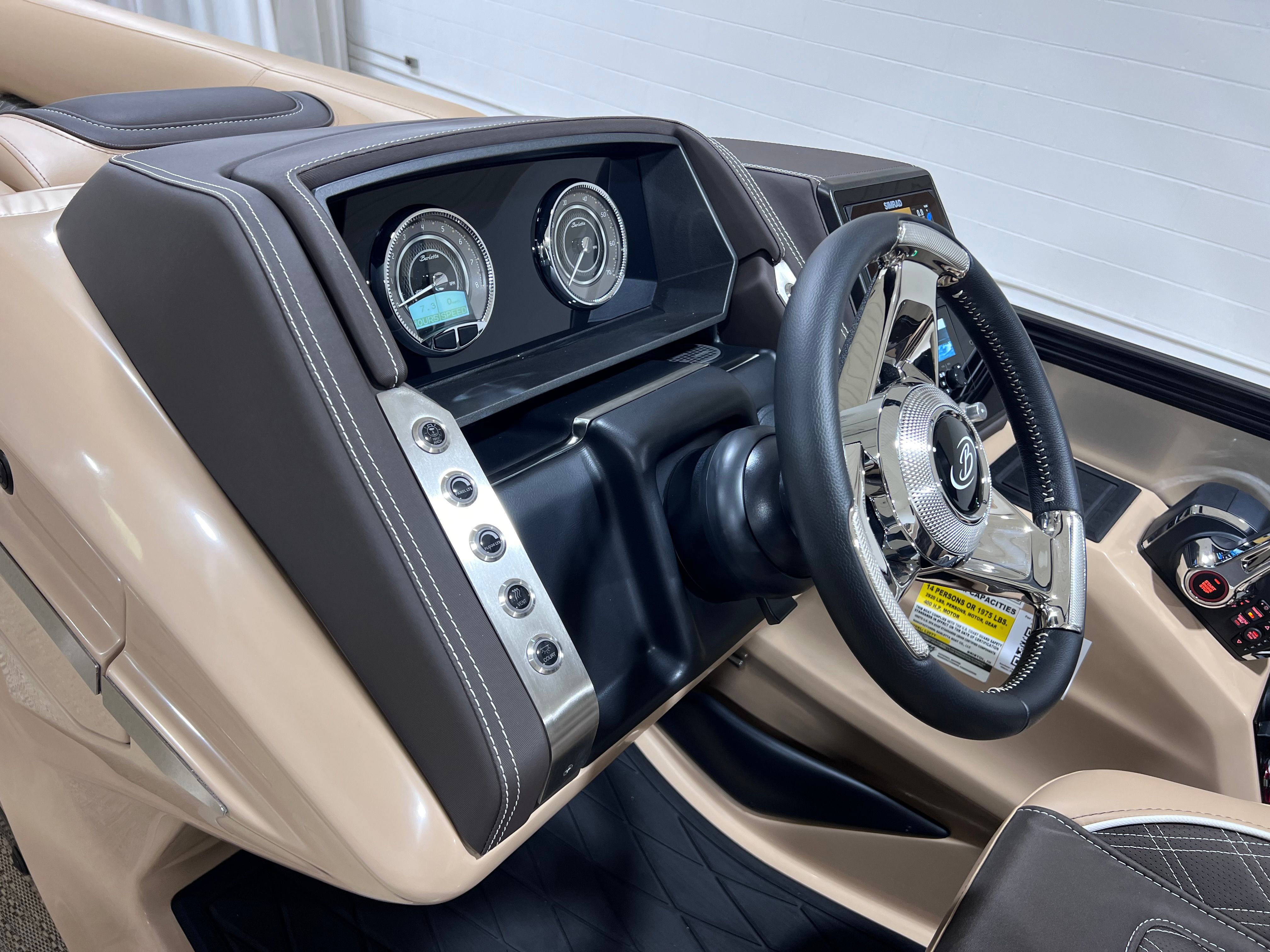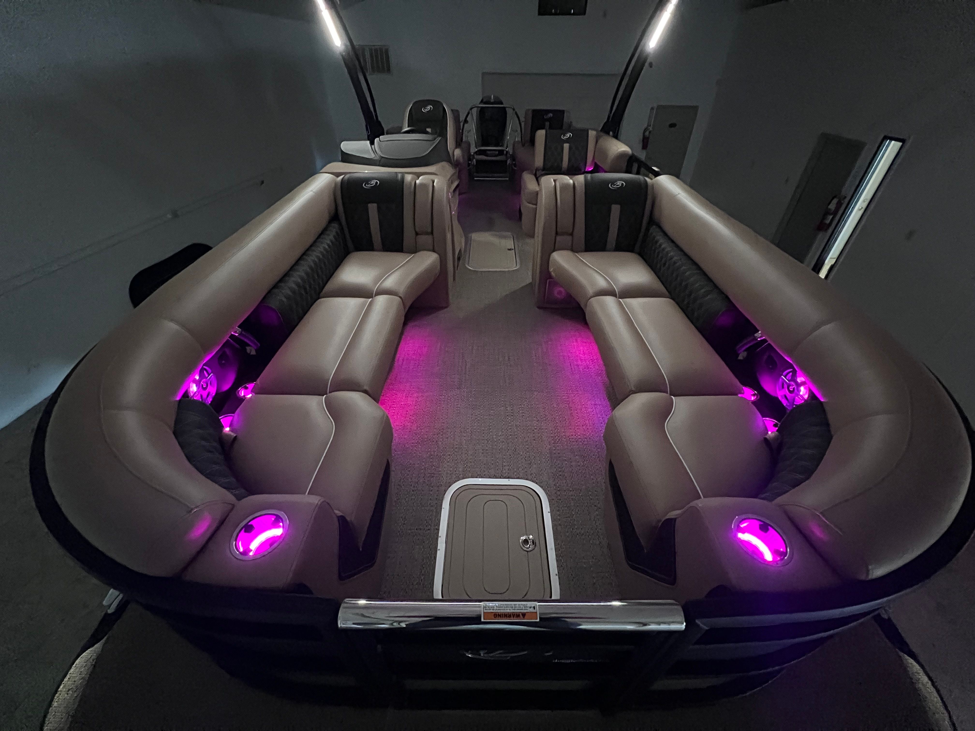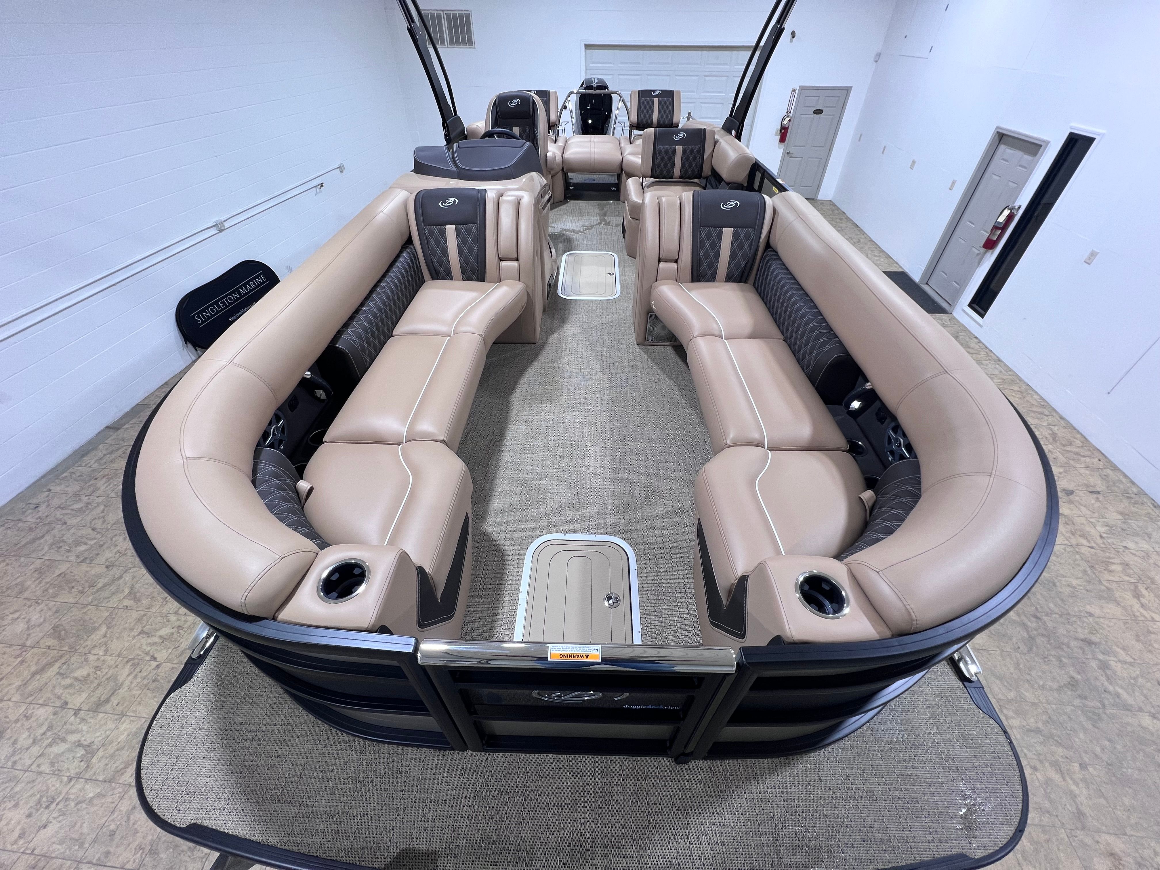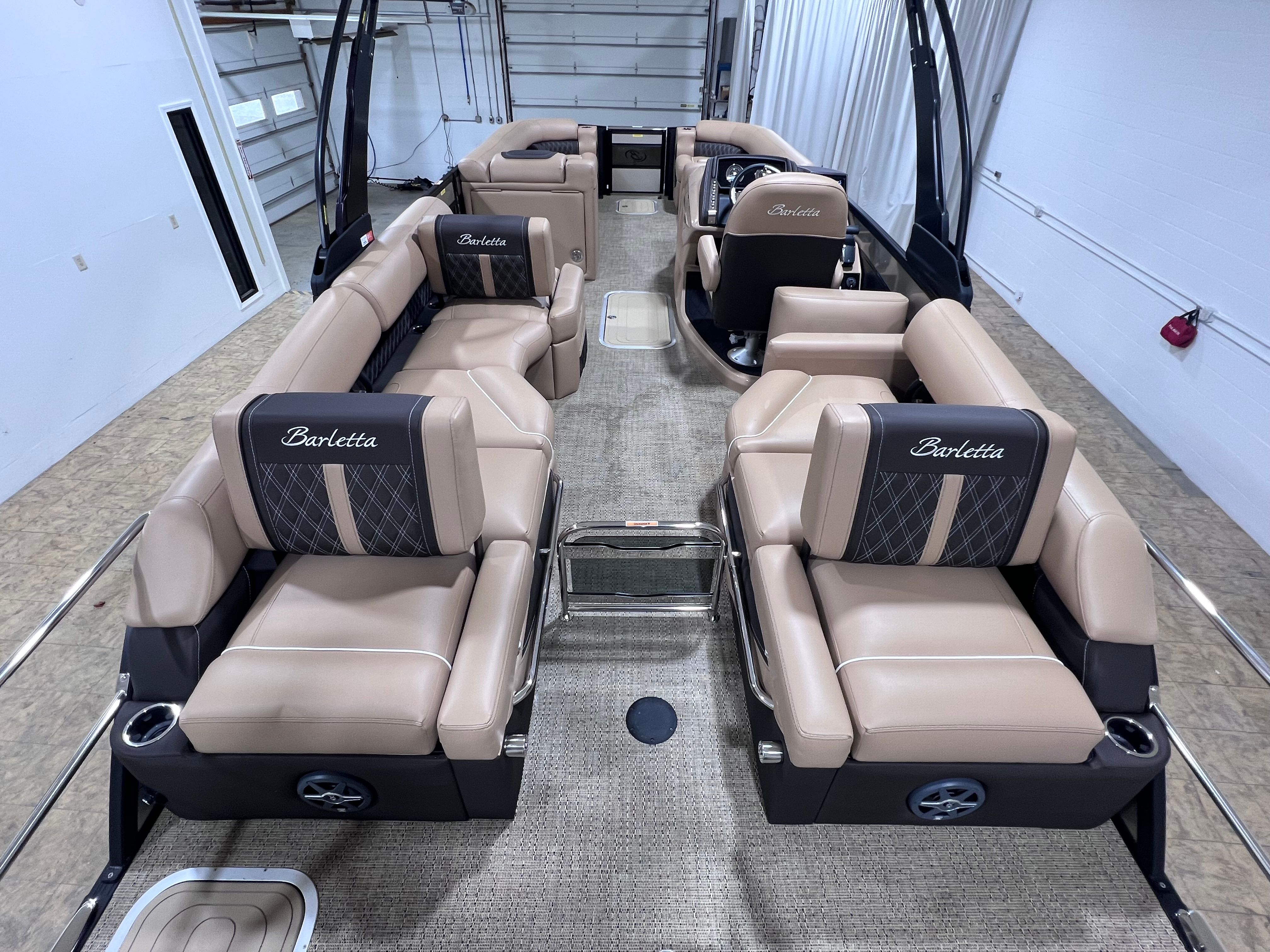 The Barletta Lusso L25M is packed with premium features designed to enhance your boating experience. The Champagne sweep color and Matte Black accent create a sophisticated exterior, while the Blackout Package Lusso railskin adds a sleek, modern flair. Step aboard and you are greeted by Carmella Tan with Bison furniture, offering plush comfort and a refined aesthetic. The Amore Tan flooring not only looks stunning but is also durable and easy to maintain, making it ideal for both relaxing and entertaining.This pontoon boat also comes equipped with a Metal Jacket Protectant, ensuring long-lasting protection against the elements and preserving the boat’s pristine appearance. The Aft Gate (Divider) for Lusso Meridian adds an extra layer of convenience and safety, making it easy to manage access and create separate spaces for different activities on board.