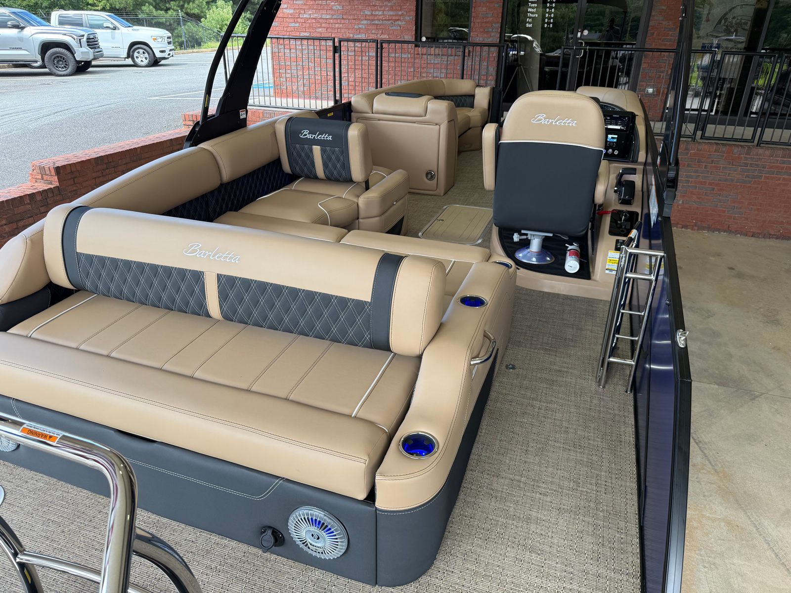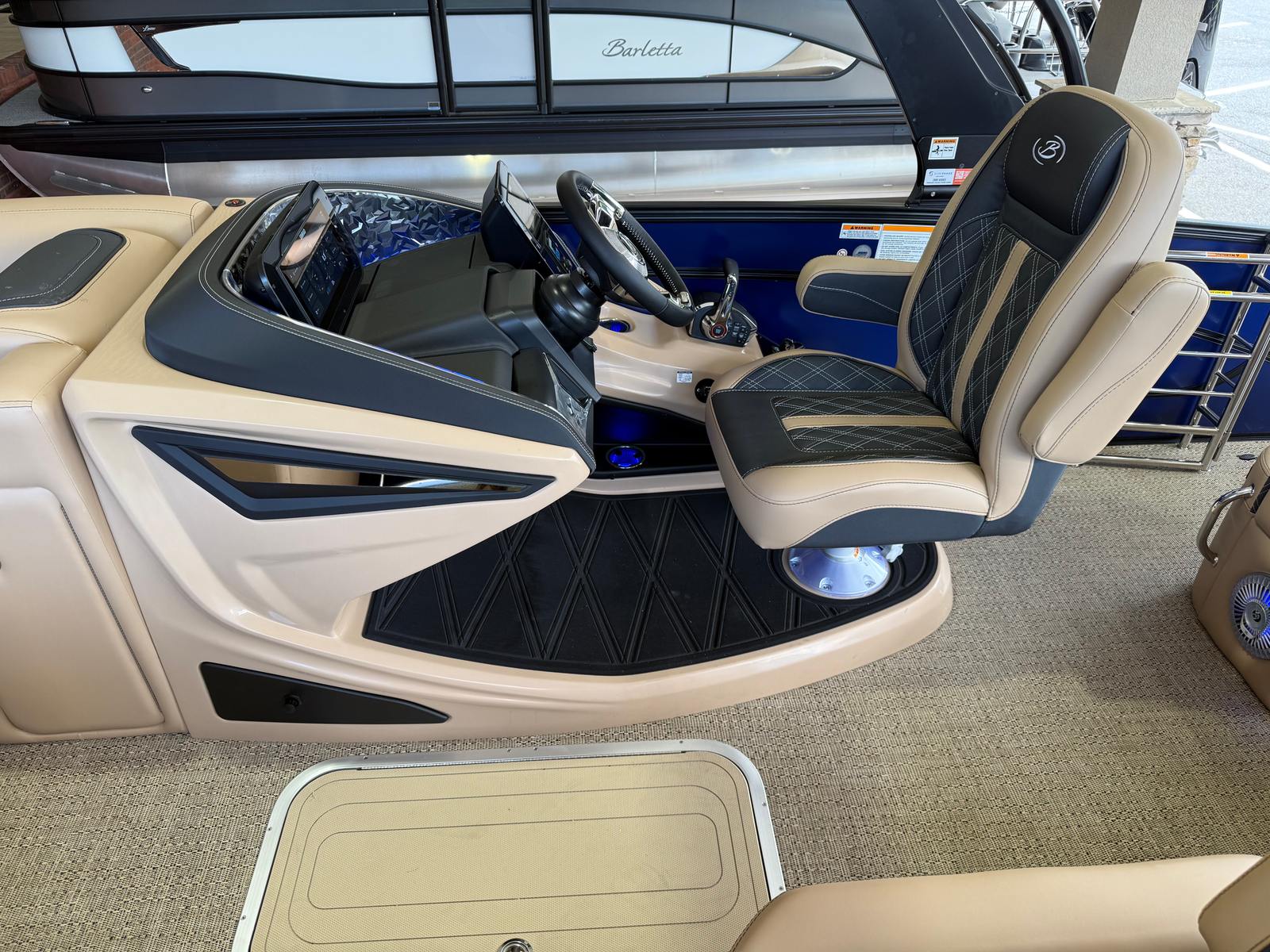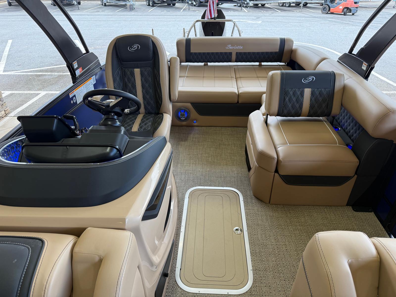 The 2026 Barletta Lusso L25U is loaded with special features that elevate your time on the water. The striking Bohemian Blue accent color and sweep color create a bold, sophisticated look, while the Blackout Package Lusso railskin adds a touch of modern elegance. The exterior lighting, including white underdeck and underwater lights, not only enhances the boat’s visual appeal but also provides added safety and ambiance during evening cruises.Step aboard and you’ll be greeted by luxurious Carmella Tan furniture with Onyx accents, perfectly complemented by the Amore Tan flooring. The spacious and comfortable seating areas are designed for relaxation and socializing, making it easy to host gatherings or enjoy quiet moments with loved ones. The Sport Bimini, installed in place of the standard bimini, offers superior shade and protection from the sun, ensuring comfort throughout the day.