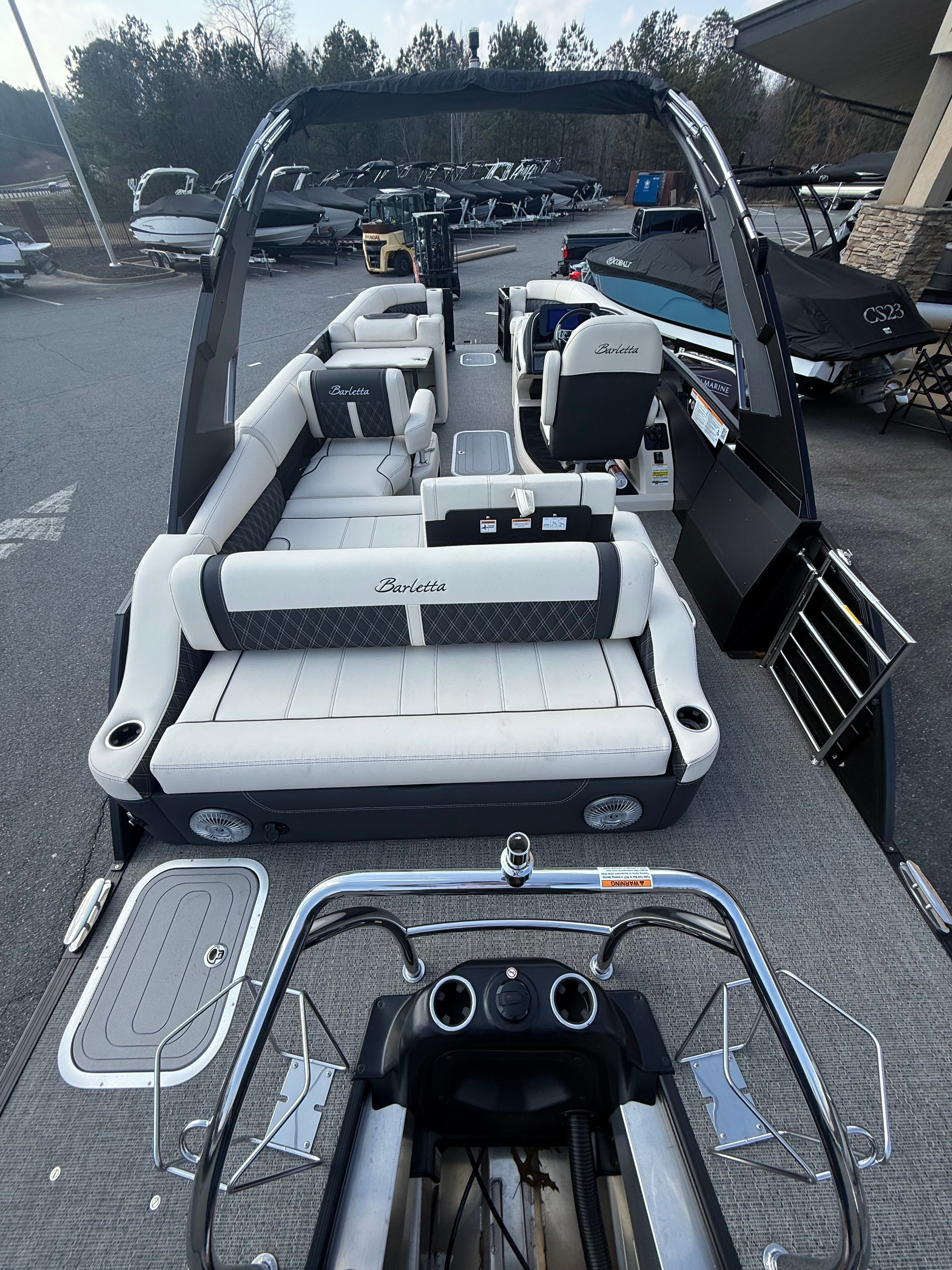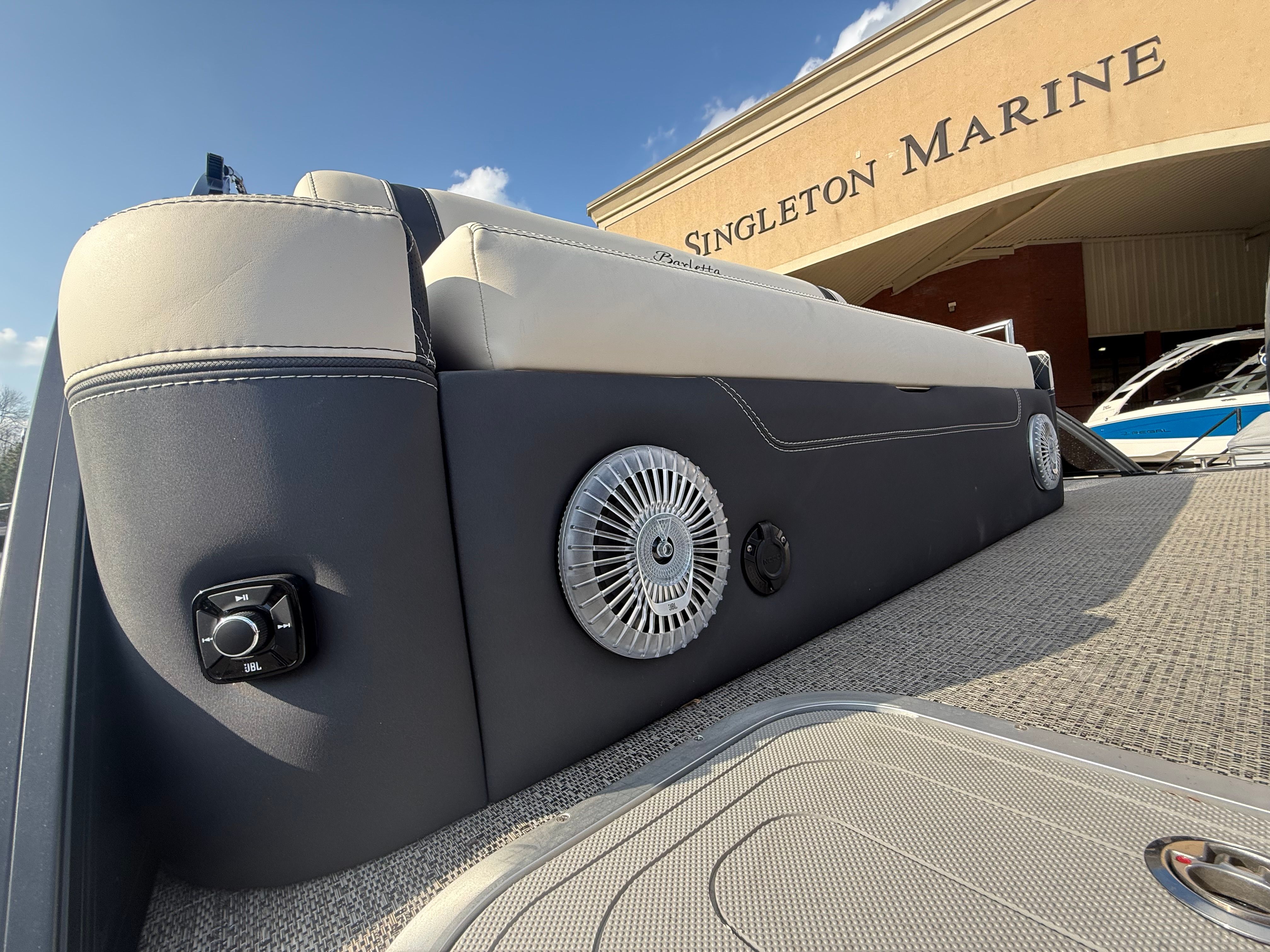 The 2026 Barletta Lusso L25UA is loaded with premium features designed to elevate your boating experience. The exterior lighting package includes white underdeck and underwater lights, creating a captivating ambiance for evening cruises and dockside gatherings. The Amore Gray flooring not only adds a touch of elegance but also provides a comfortable, slip-resistant surface for all your on-board activities. The furniture, finished in luxurious Linen with Onyx accents, offers plush seating and ergonomic support, ensuring every passenger enjoys the journey in style. The Blackout Package Lusso railskin enhances the boat’s sleek profile, while the Matte Black accent color adds a modern edge to its overall appearance.
