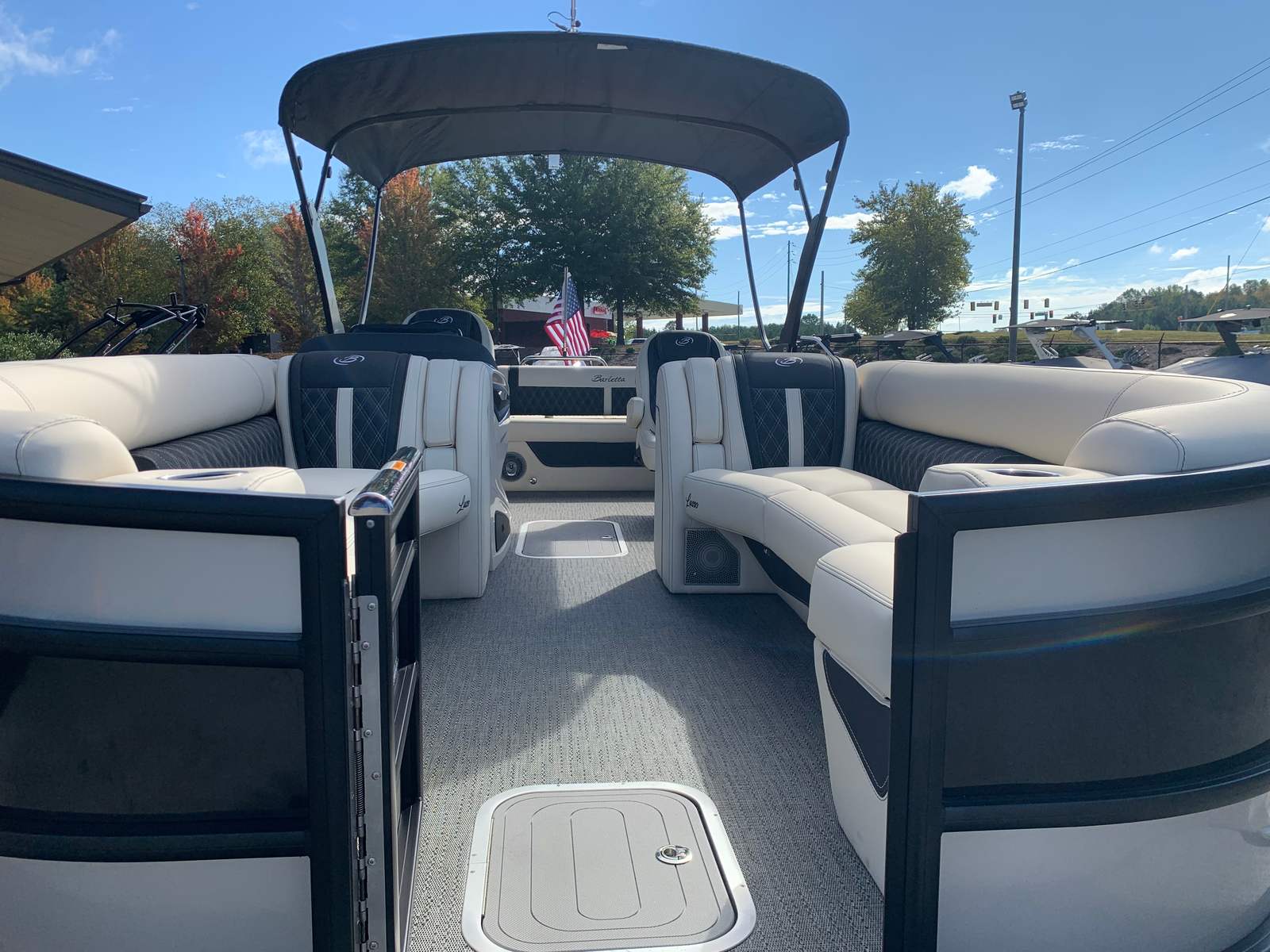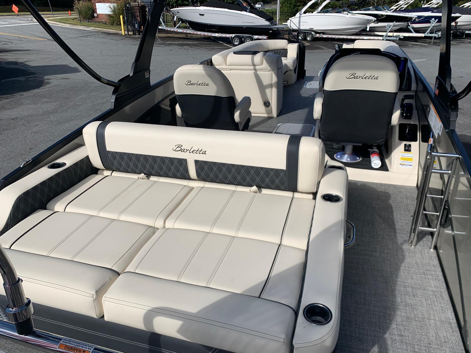 The 2026 Barletta Lusso L25UC is packed with premium features that set it apart from other pontoon boats for sale. The flooring is finished in elegant Amore Gray, providing both durability and a contemporary look. The furniture is upholstered in luxurious Linen with Onyx accents, offering plush seating and a sophisticated atmosphere. The Blackout Package Lusso railskin adds a bold, modern edge, while the accent color in Black Diamond and sweep color in Champagne create a striking visual appeal.For those who love to spend long days on the water, the Sport Bimini (installed in place of the standard Bimini) offers superior sun protection and style. The exterior lighting package includes white underdeck and underwater lights, enhancing the boat’s ambiance and visibility during evening cruises. Every detail, from the rigging to the color choices, is thoughtfully designed to elevate your boating experience.