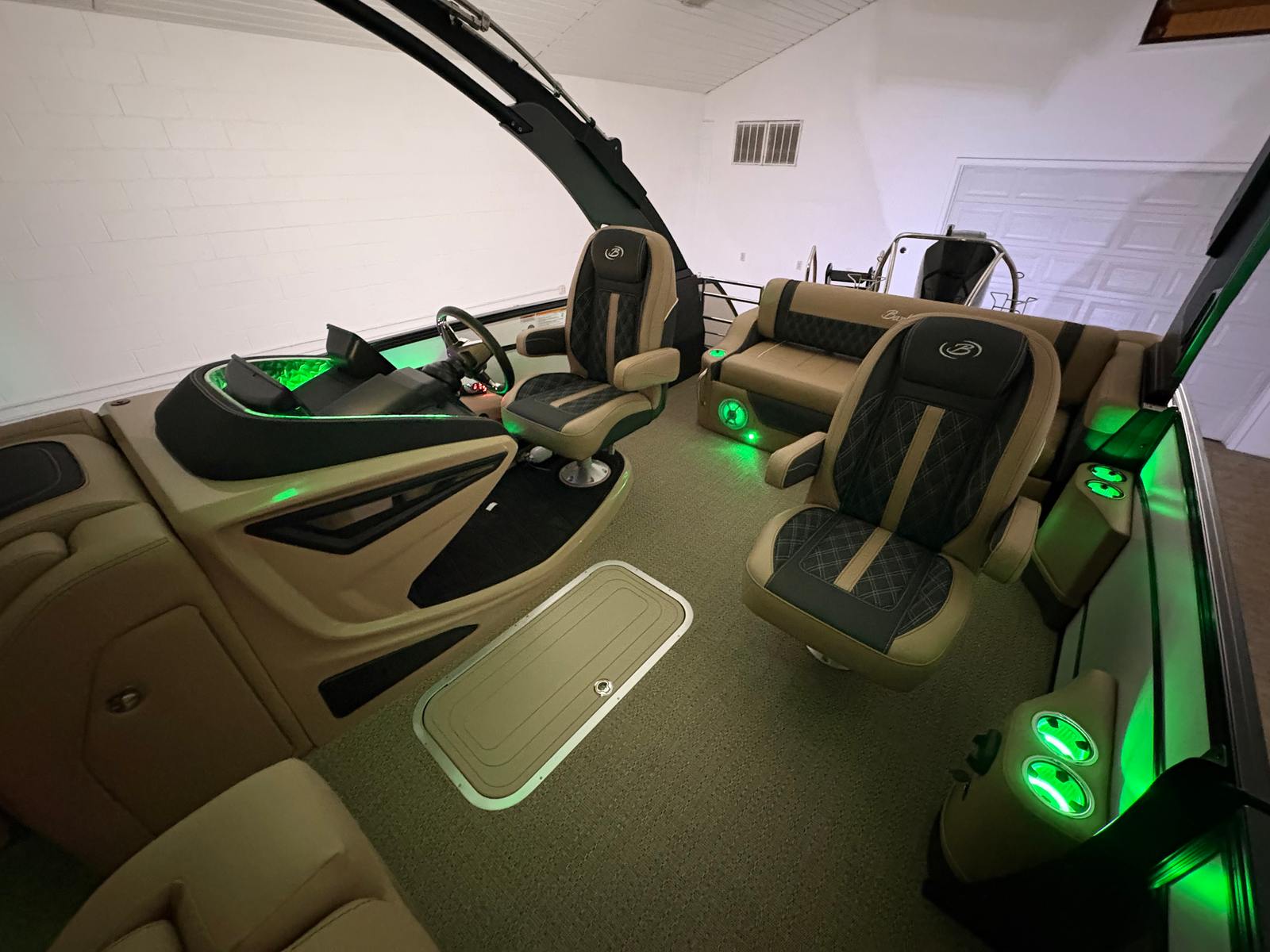 The Barletta Lusso L25UCA is packed with premium features that elevate your boating experience. The exterior lighting, including white underdeck and underwater lights, creates a captivating ambiance for evening cruises and dockside gatherings. Digital gauges provide clear, real-time information at a glance, ensuring you stay informed and in control at all times. The carefully selected Carmella Tan with Onyx furniture offers plush seating and ample space for relaxation, while the Amore Tan flooring adds a touch of elegance and comfort underfoot. The Blackout Package Lusso railskin not only enhances the boat’s appearance but also adds an extra layer of sophistication and exclusivity.
