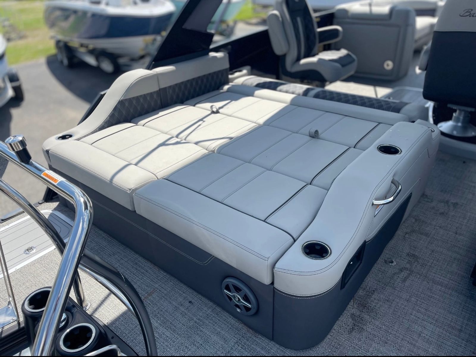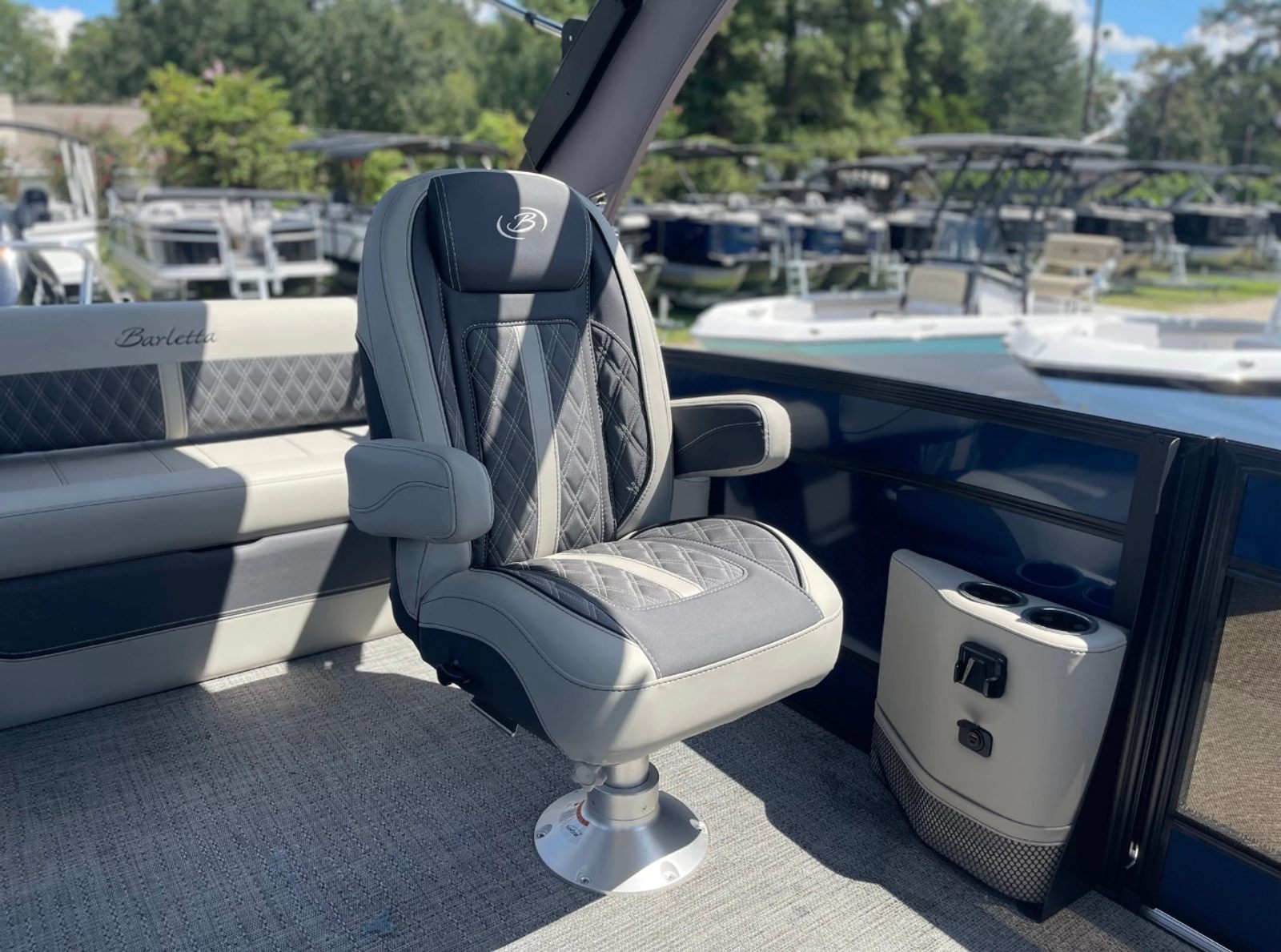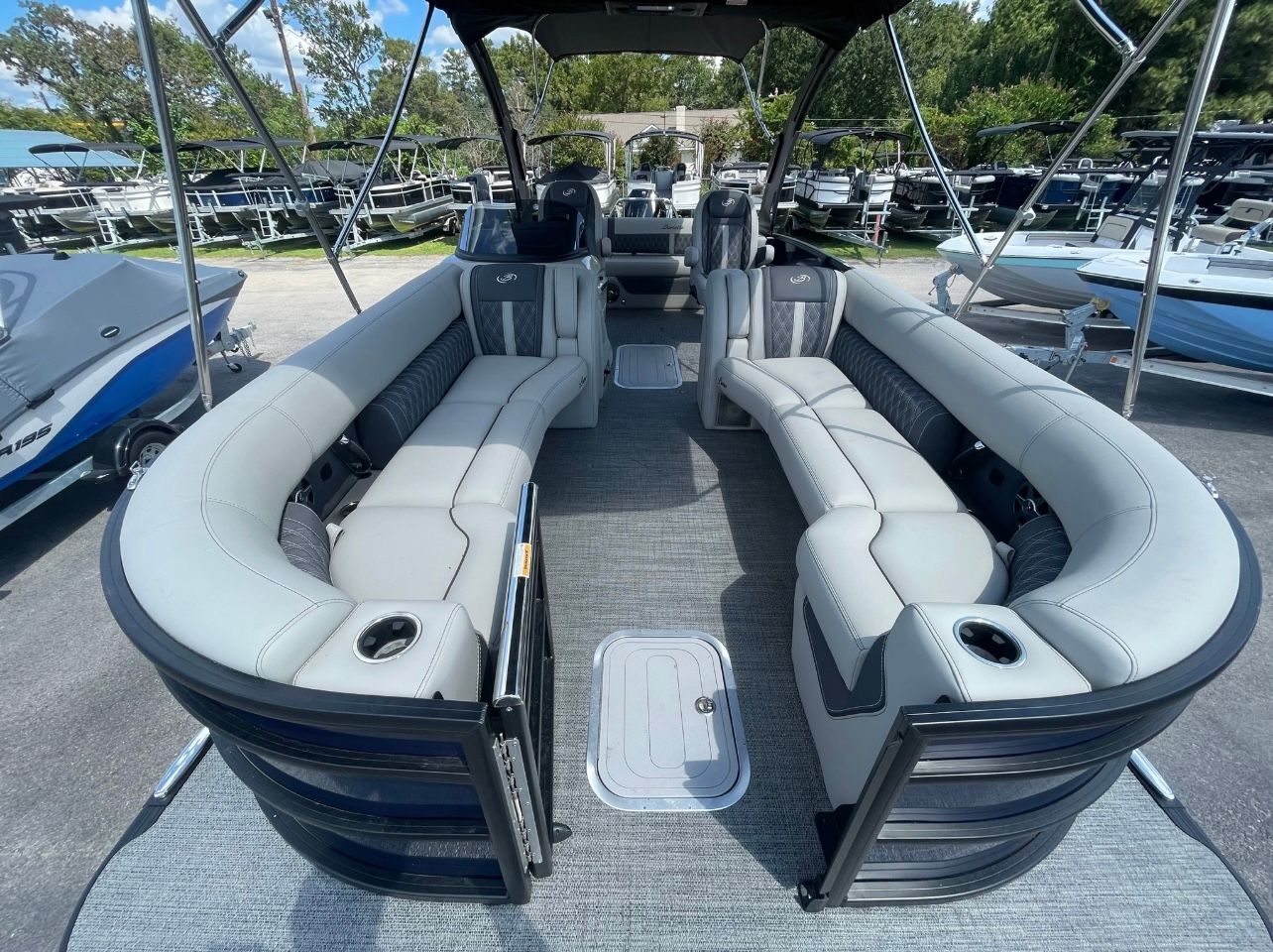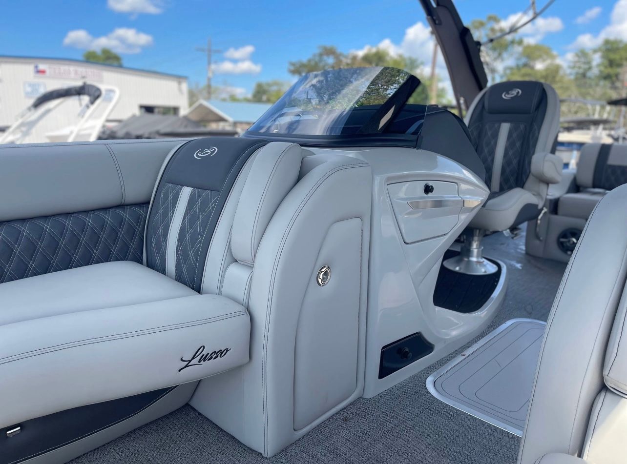 The 2025 Barletta Lusso L25UCA is loaded with special features that enhance both comfort and style. The adjustable pedestal on the captain's chair allows for personalized comfort, ensuring the captain enjoys every moment at the helm. The double bimini arch models provide ample shade, making long days on the water more enjoyable and protecting you from the sun’s rays. The exterior lighting, including white underdeck and underwater lights, creates a captivating ambiance during evening cruises and adds a layer of safety and visibility. The Metal Jacket Protectant on the exterior ensures your boat maintains its pristine appearance, offering added durability against the elements. The Blue Sapphire accent color further elevates the boat’s visual appeal, making it a true head-turner on any lake or river.