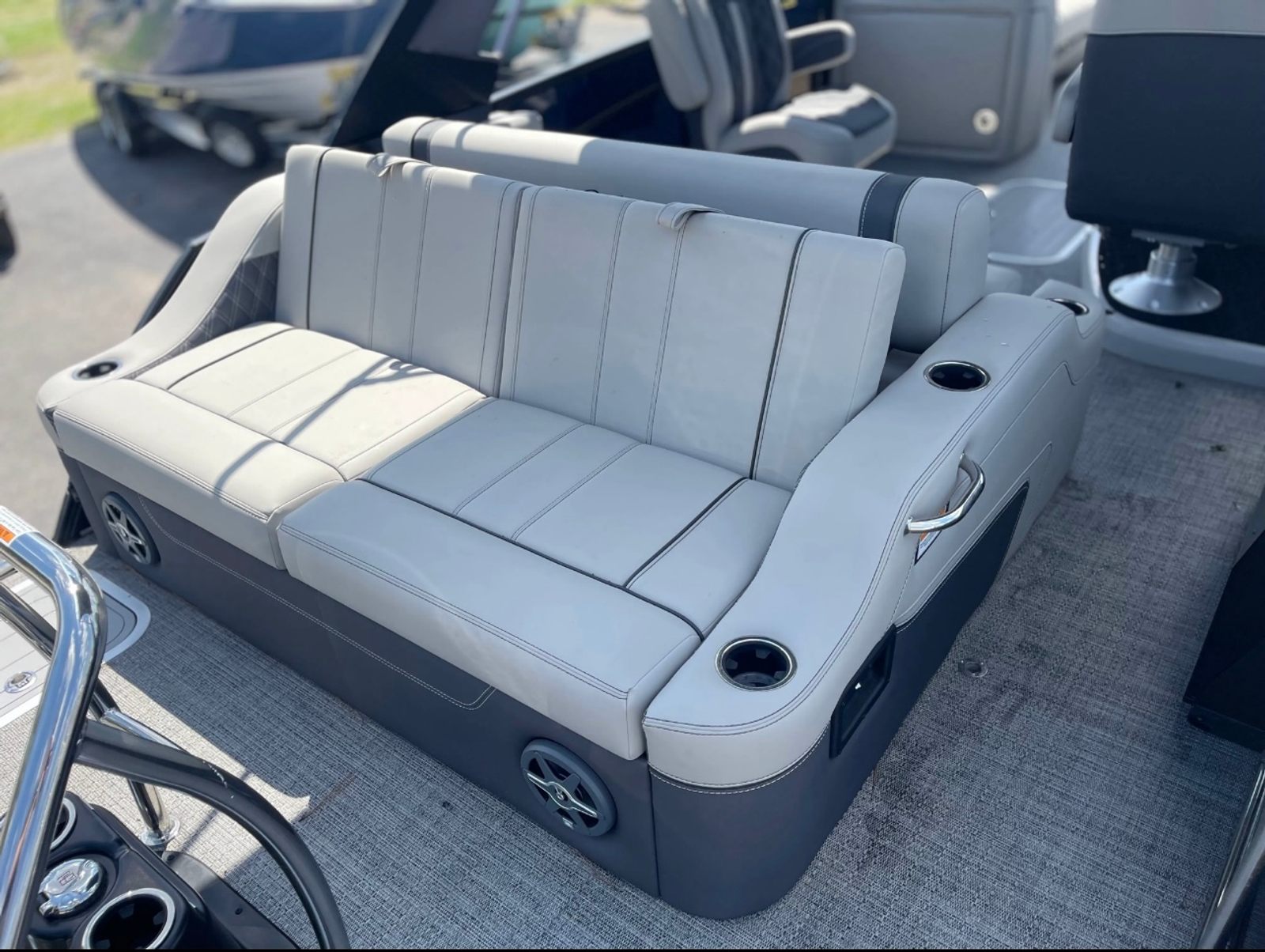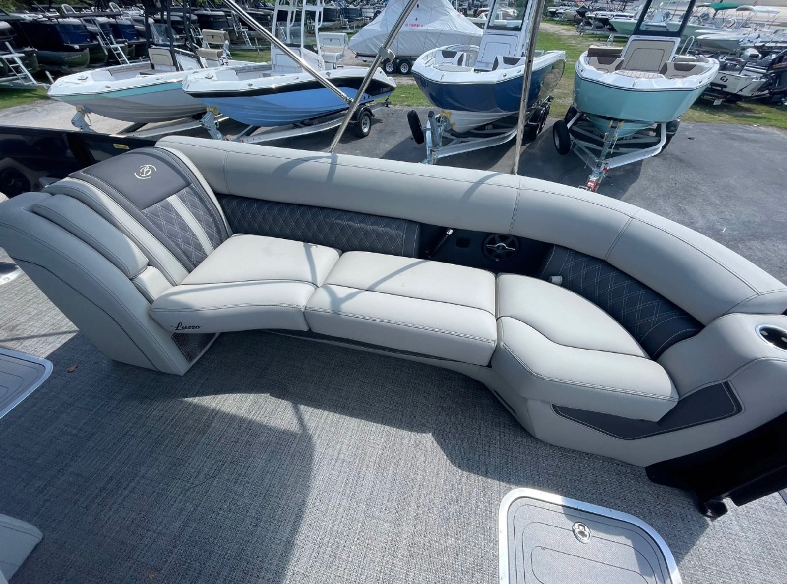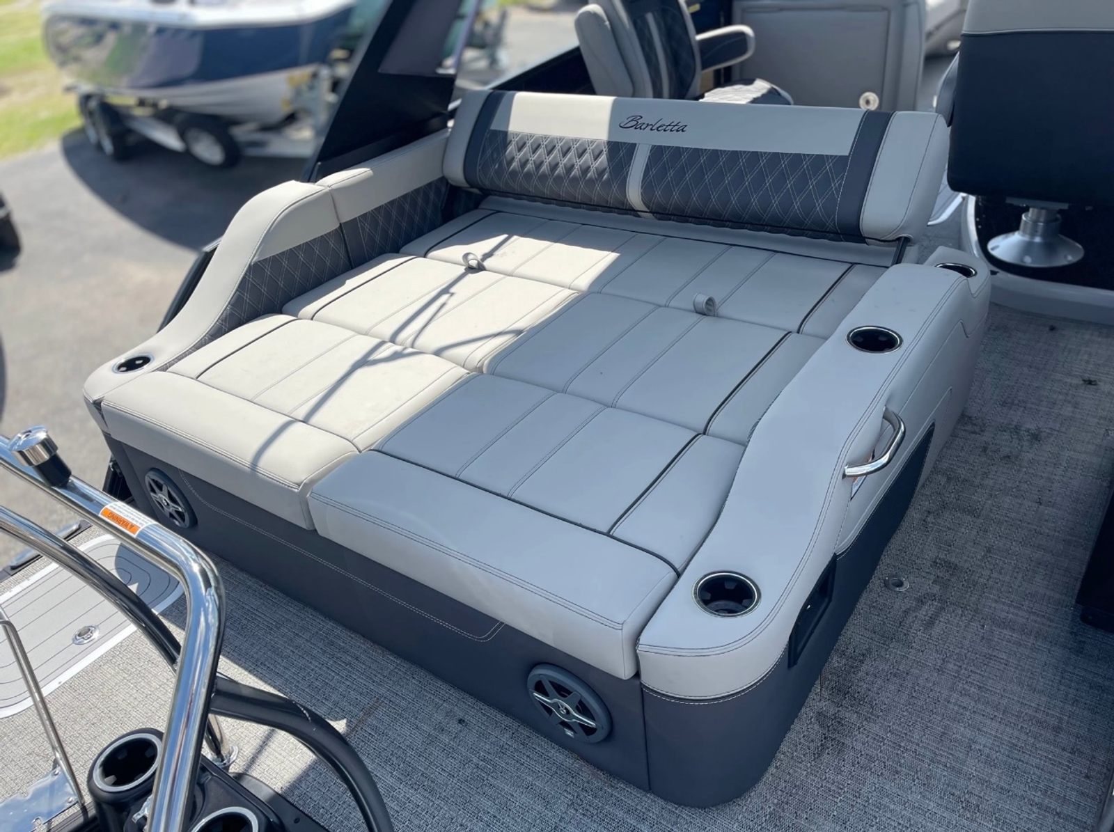The 2025 Barletta Lusso L25UCA is loaded with special features that enhance both comfort and style. The adjustable pedestal on the captain's chair allows for personalized comfort, ensuring the captain enjoys every moment at the helm. The double bimini arch models provide ample shade, making long days on the water more enjoyable and protecting you from the sun’s rays. The exterior lighting, including white underdeck and underwater lights, creates a captivating ambiance during evening cruises and adds a layer of safety and visibility. The Metal Jacket Protectant on the exterior ensures your boat maintains its pristine appearance, offering added durability against the elements. The Blue Sapphire accent color further elevates the boat’s visual appeal, making it a true head-turner on any lake or river.
