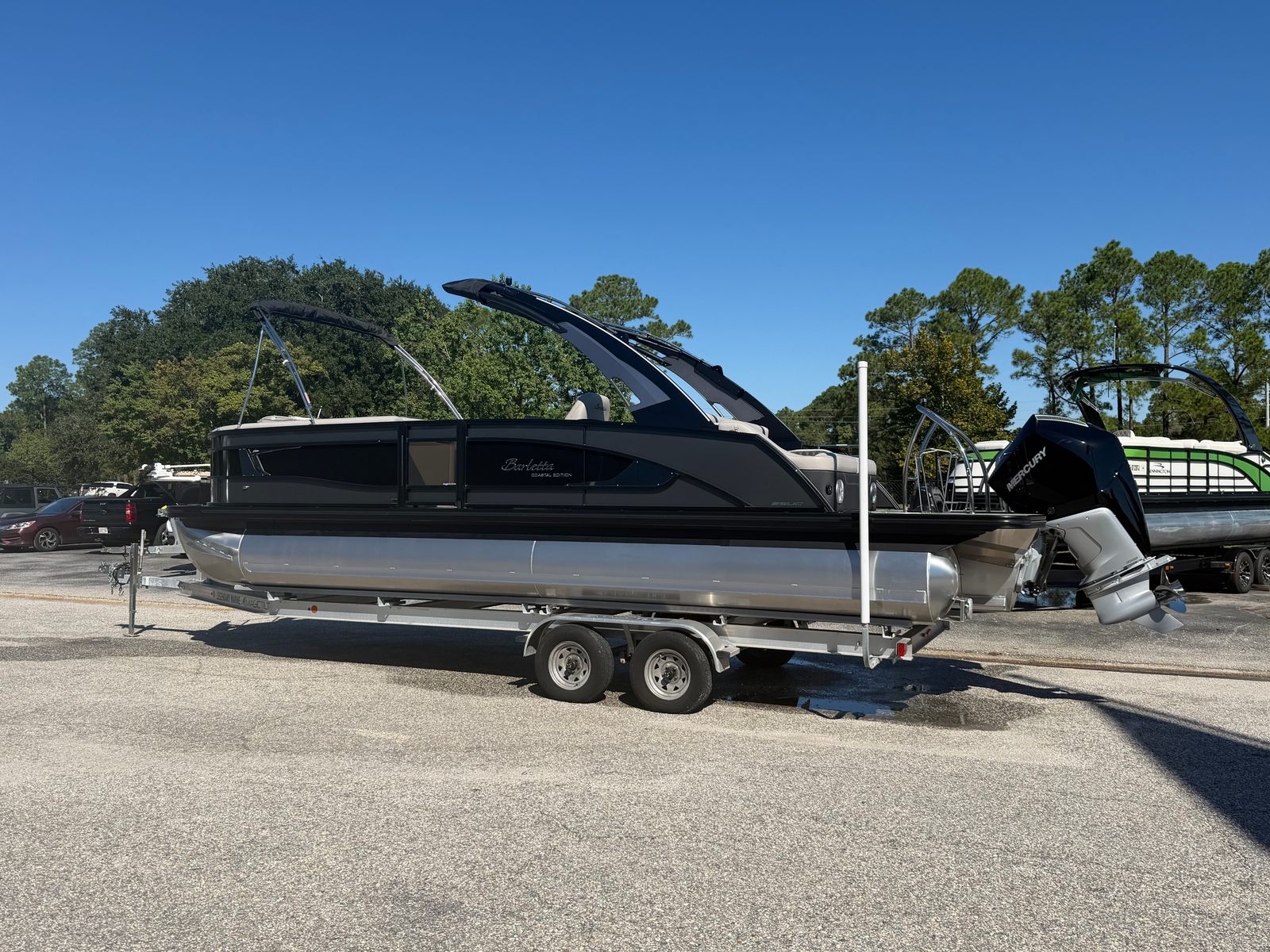 This Barletta boat for sale is packed with premium features designed to enhance your boating experience. The Double Bimini Arch Models offer versatile shade options, allowing you to enjoy the sun or relax in the cool comfort of the shade. The Coastal Edition Lusso brings added durability and style, perfect for both freshwater and coastal adventures. The Blackout Package Lusso, combined with the sleek railskin packages, gives the boat a bold, contemporary look that’s sure to impress. Inside, the Marquesan Gray with Onyx furniture provides plush seating and ample space for socializing, while the Amore Gray flooring is both stylish and easy to maintain. Digital gauges offer real-time information at your fingertips, and the Mercury Digital DTS Pre-Rig ensures your engine is ready for peak performance.