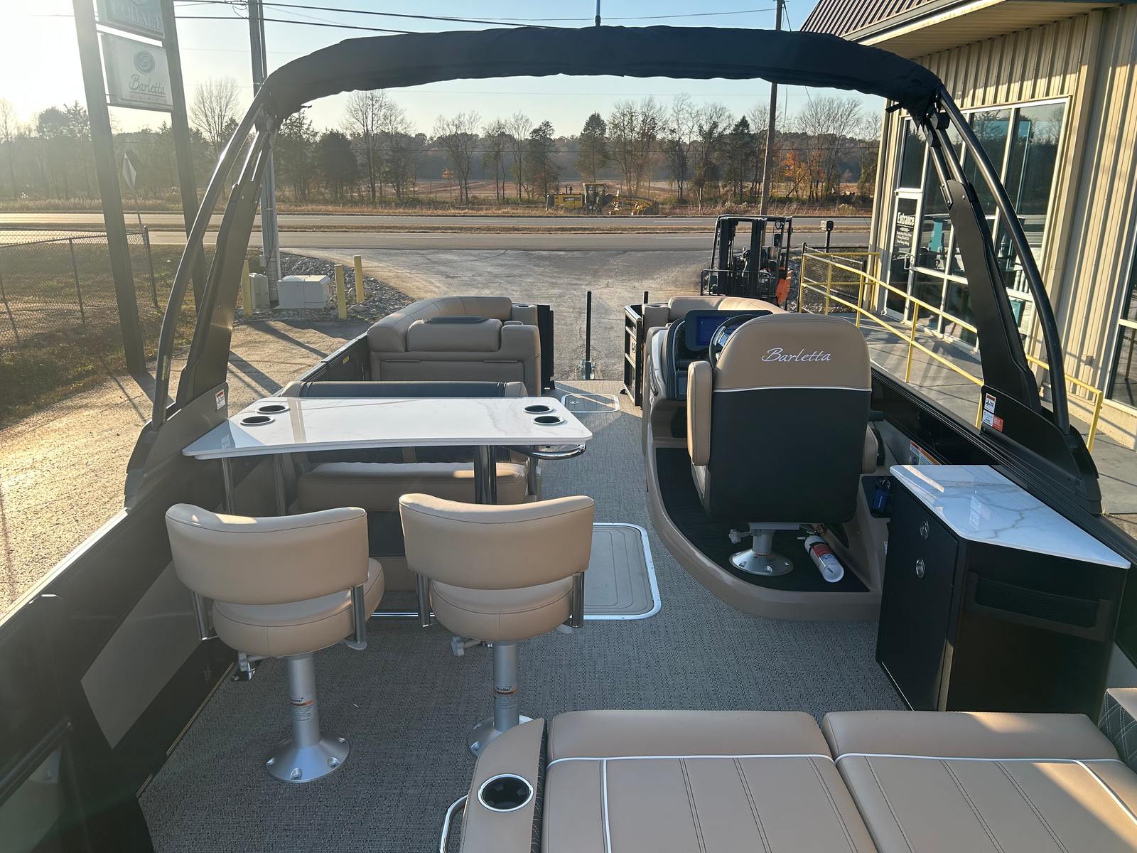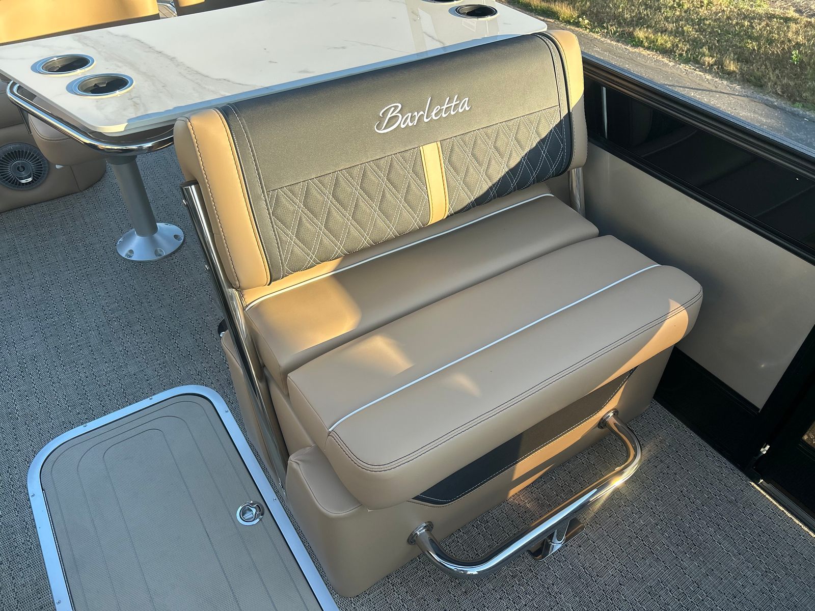 The 2026 Barletta Lusso L25UE is loaded with features that enhance both comfort and convenience. The Blackout Package Lusso railskin adds a bold, modern touch to the exterior, while the Carmella Tan with Onyx furniture offers plush seating for all your guests. The Amore Tan flooring is not only stylish but also easy to maintain, making it ideal for active days on the water. The Sport Bimini, installed in place of the standard bimini, provides ample shade and protection from the sun, ensuring comfort during long afternoons afloat. An onboard battery charger with two batteries ensures you have reliable power for all your electronic needs, keeping your adventures uninterrupted.