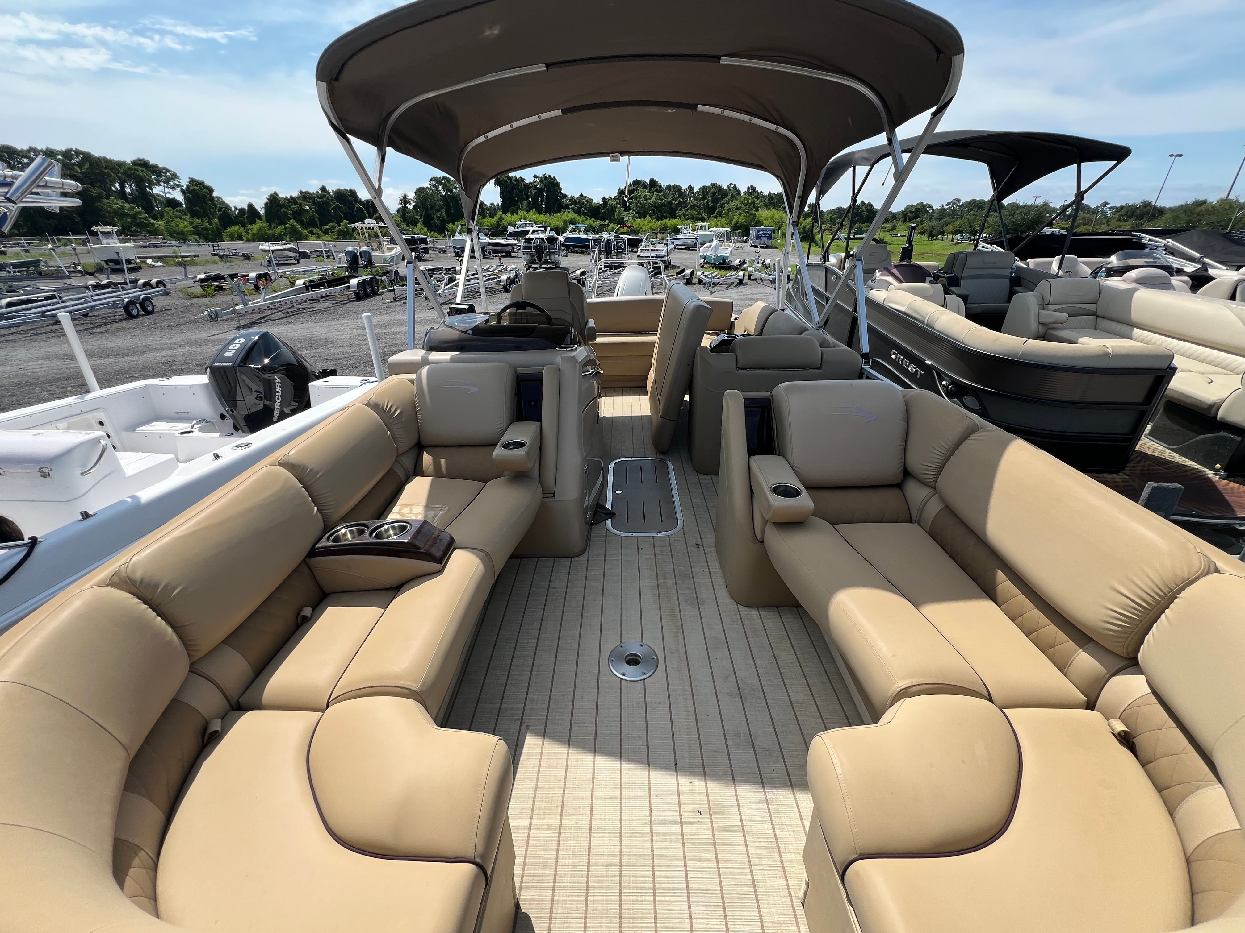 DESIGN. WITH BUILT IN CUP HOLDERS AND PLUSH PILLOW TOP LOUNGERS THIS PONTOON IS A