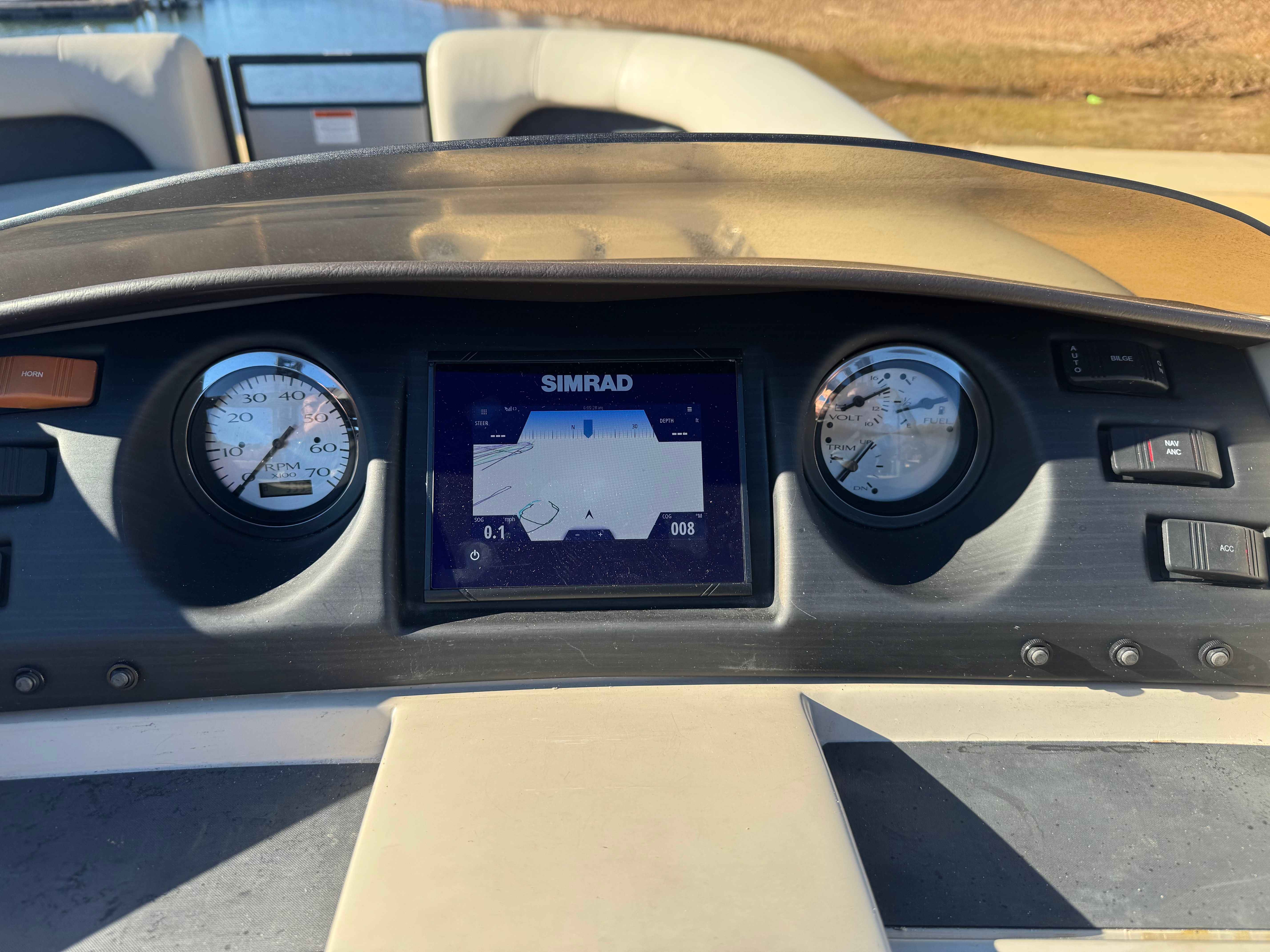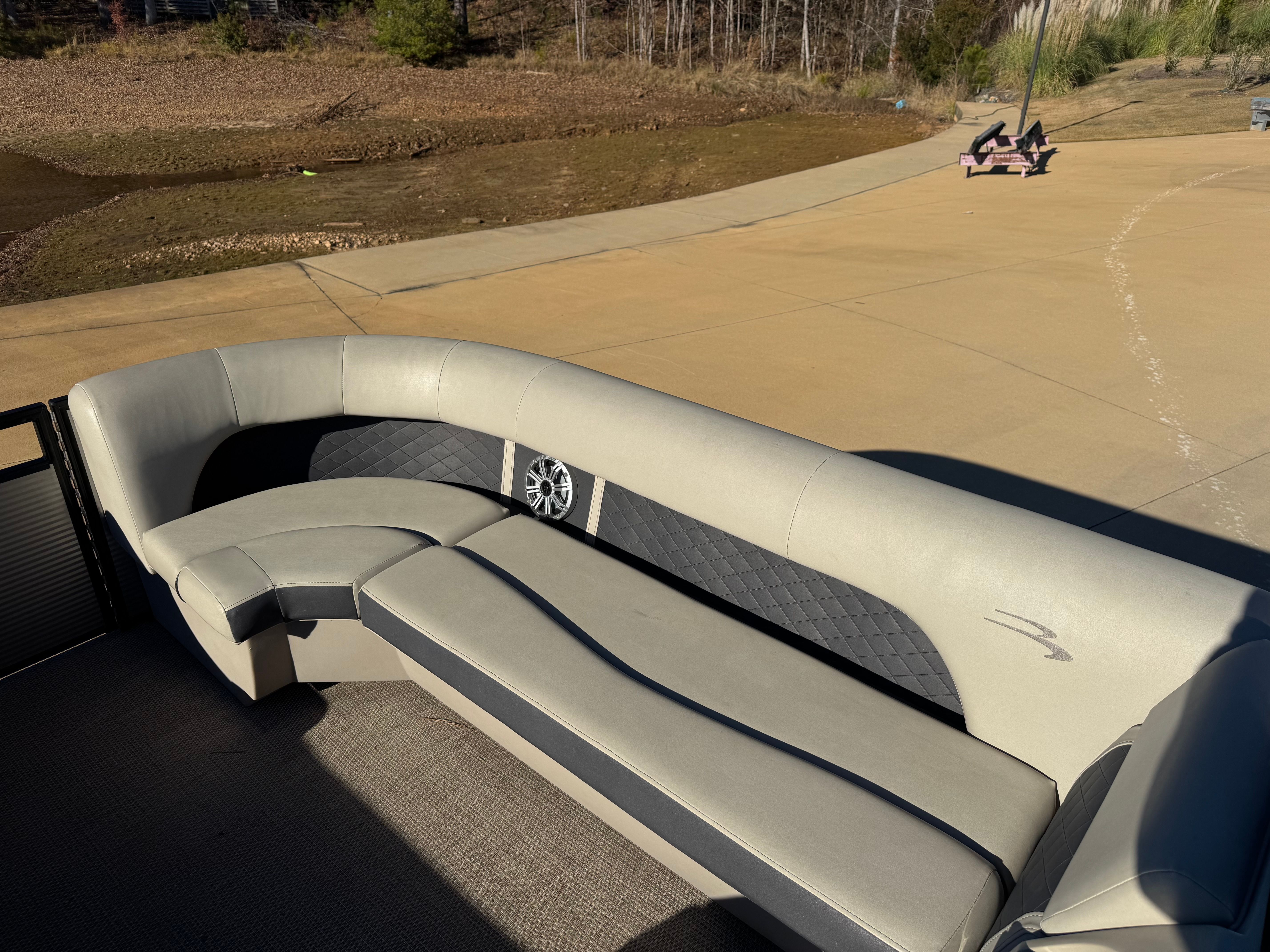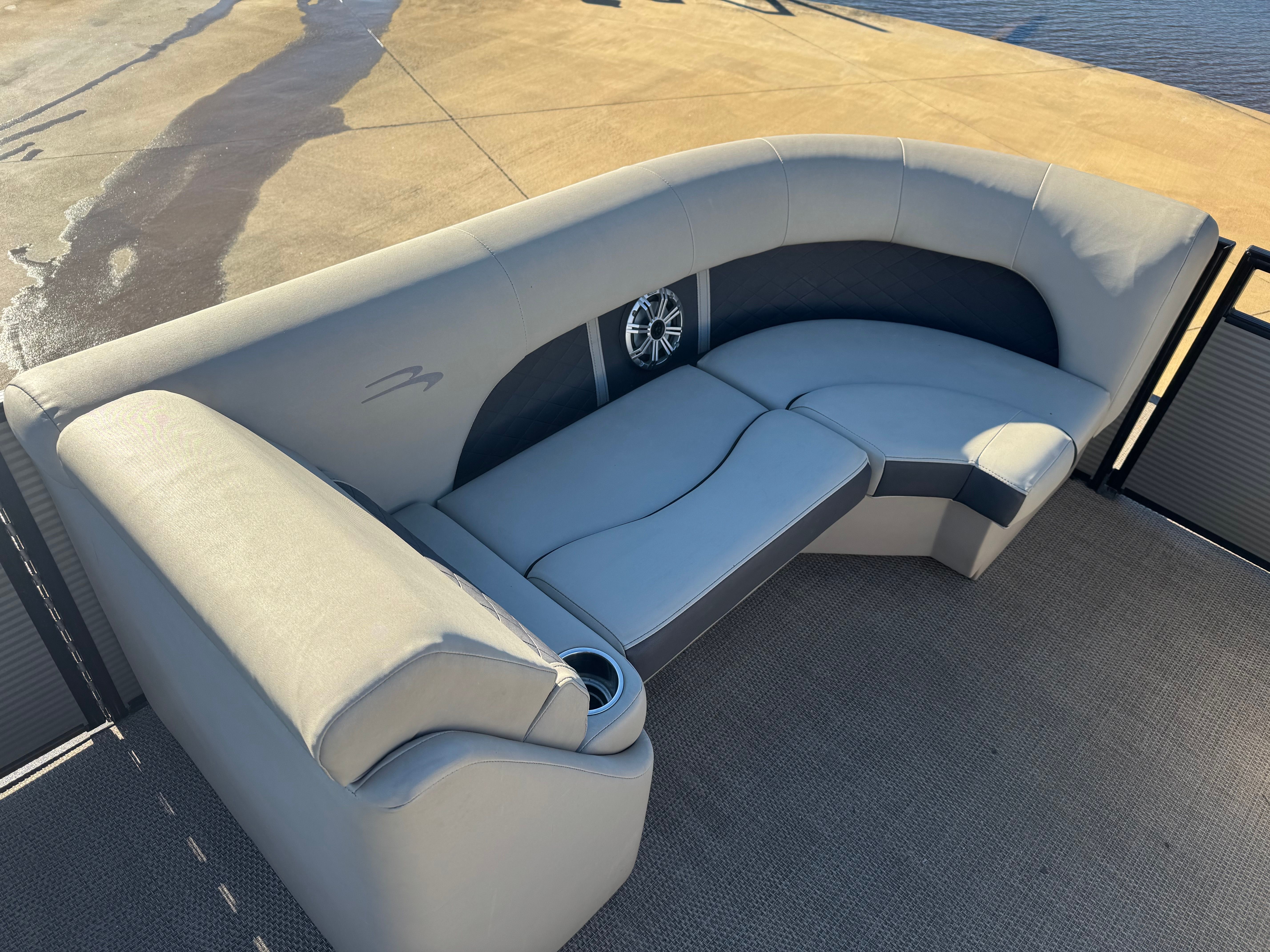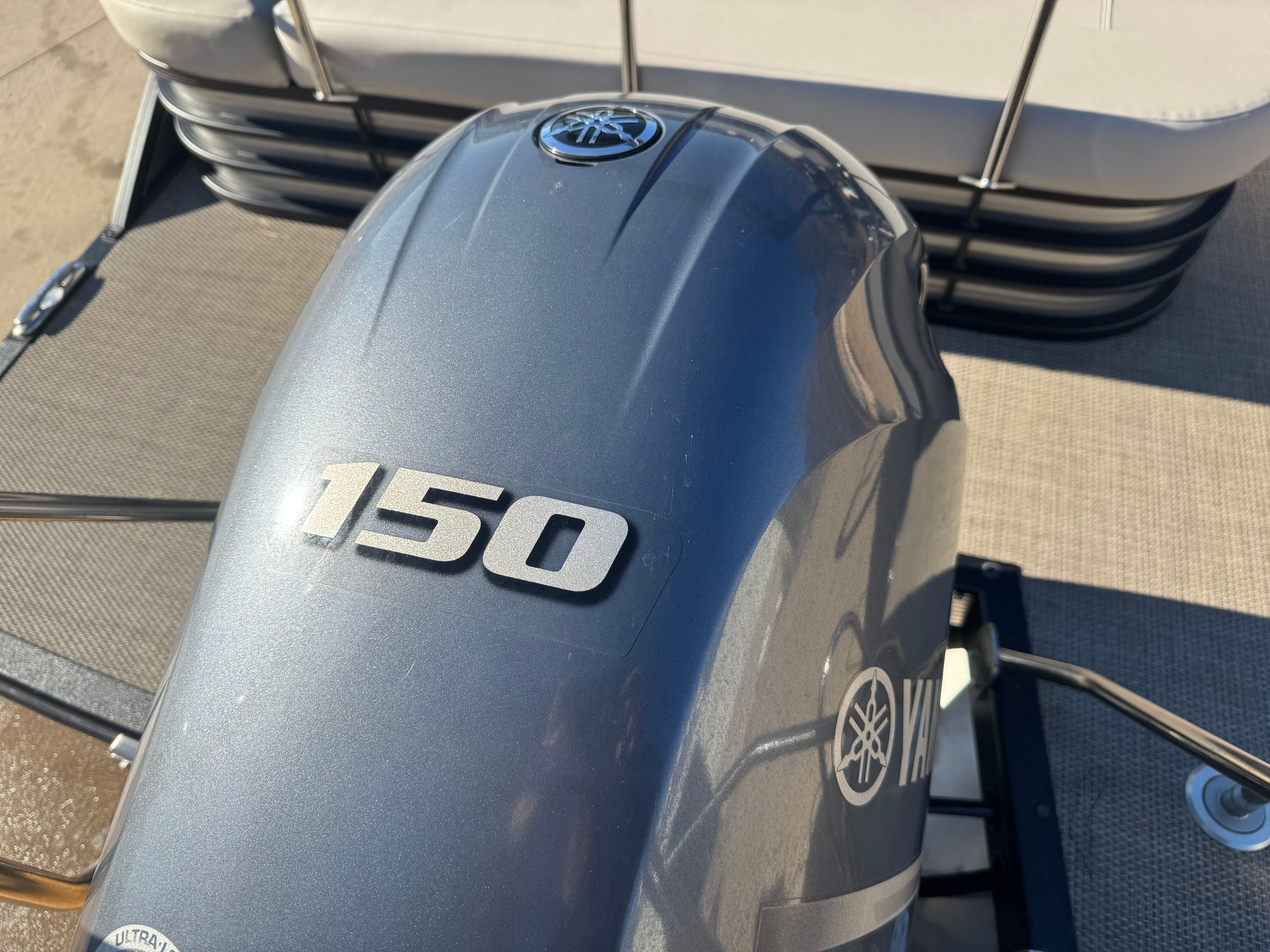 Powering the SX23 is a 150hp Yamaha four-stroke outboard — a reliable, efficient, and well-regarded engine in the boating world. The 150hp strikes an excellent balance on a 23-foot pontoon: enough thrust to deliver crisp acceleration, comfortable cruising speeds, and the ability to handle light towing (towables and inflatable toys), while remaining fuel-efficient for everyday use. Yamaha’s smooth power delivery makes docking and low-speed maneuvering predictable, and the motor’s modern four-stroke design keeps noise and vibrations in check so conversation and music remain enjoyable.