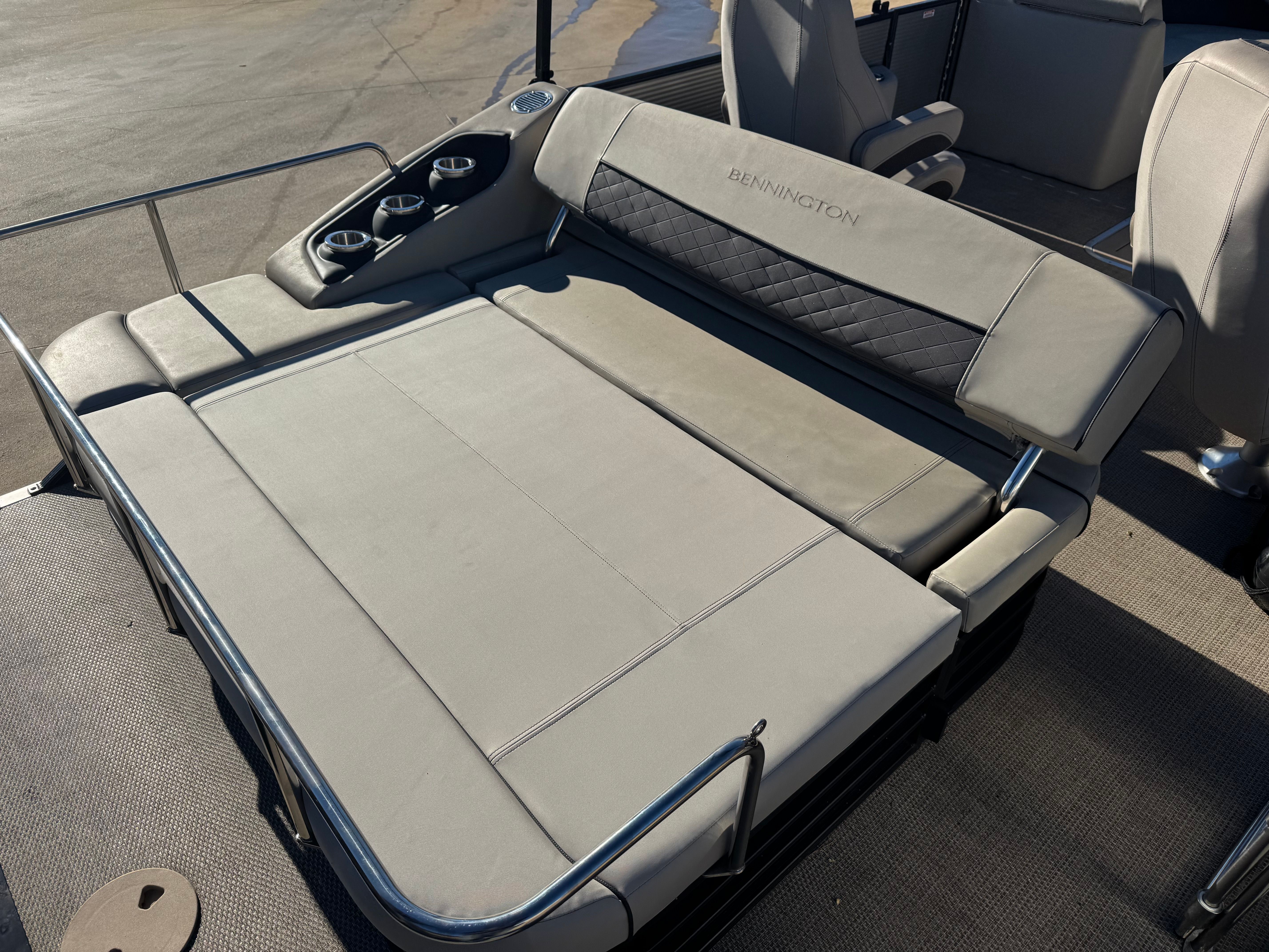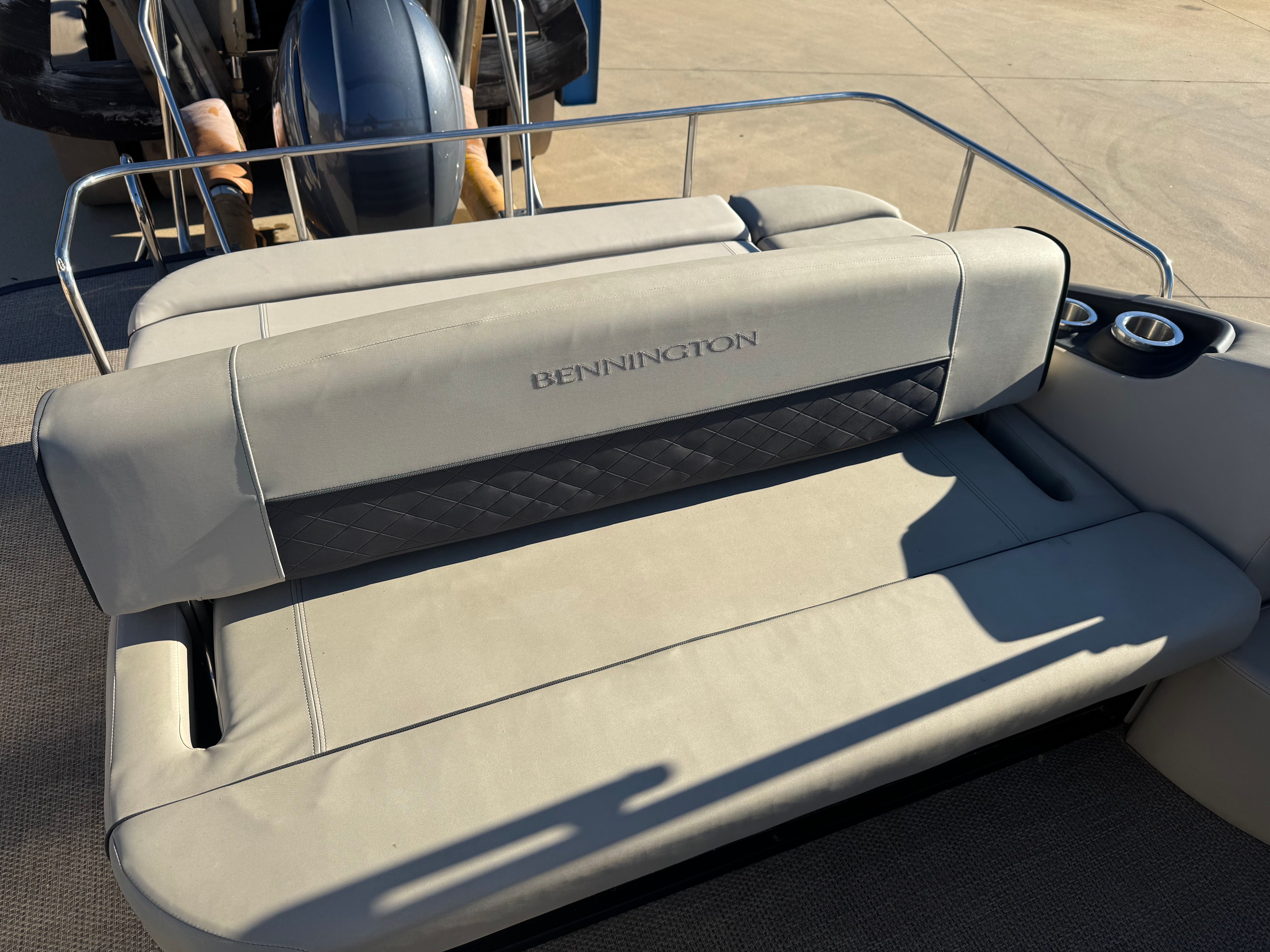 Bennington outfits the SX23 to ensure everyone on board stays comfortable. Plush seating with high backs and supportive cushions make long days less tiring. Thoughtful amenities include deep in-seat storage for life jackets and gear, cup holders within reach of every seat, and a dedicated area for a cooler or optional onboard fridge. The transom area is arranged for easy access to the water — a sturdy ladder and swim platform simplify climbs back aboard after a swim, tube ride, or paddle. Some SX23s also include handy extras such as a quick-connect for a grill, ski locker space, and an audio package for setting the mood.