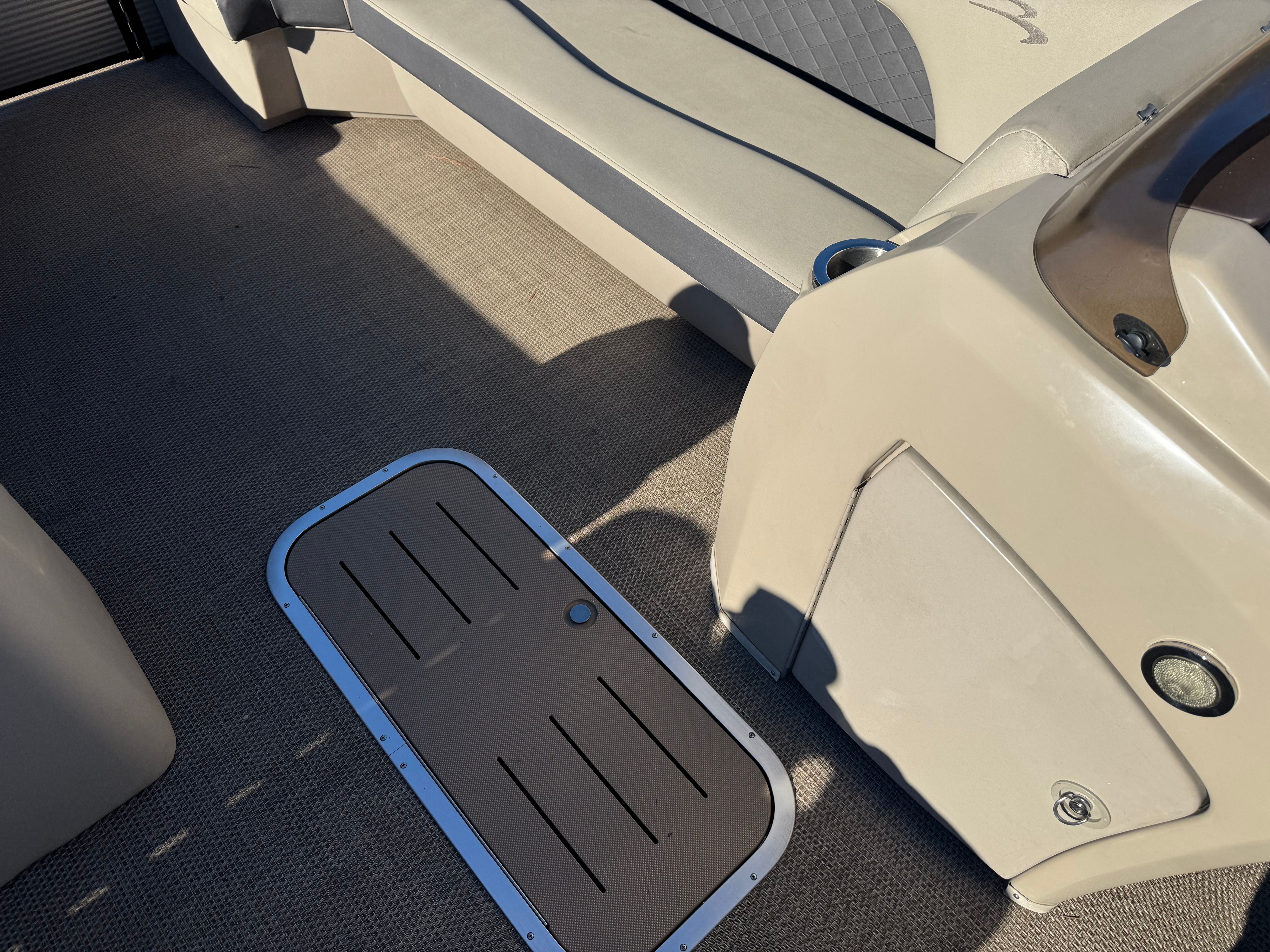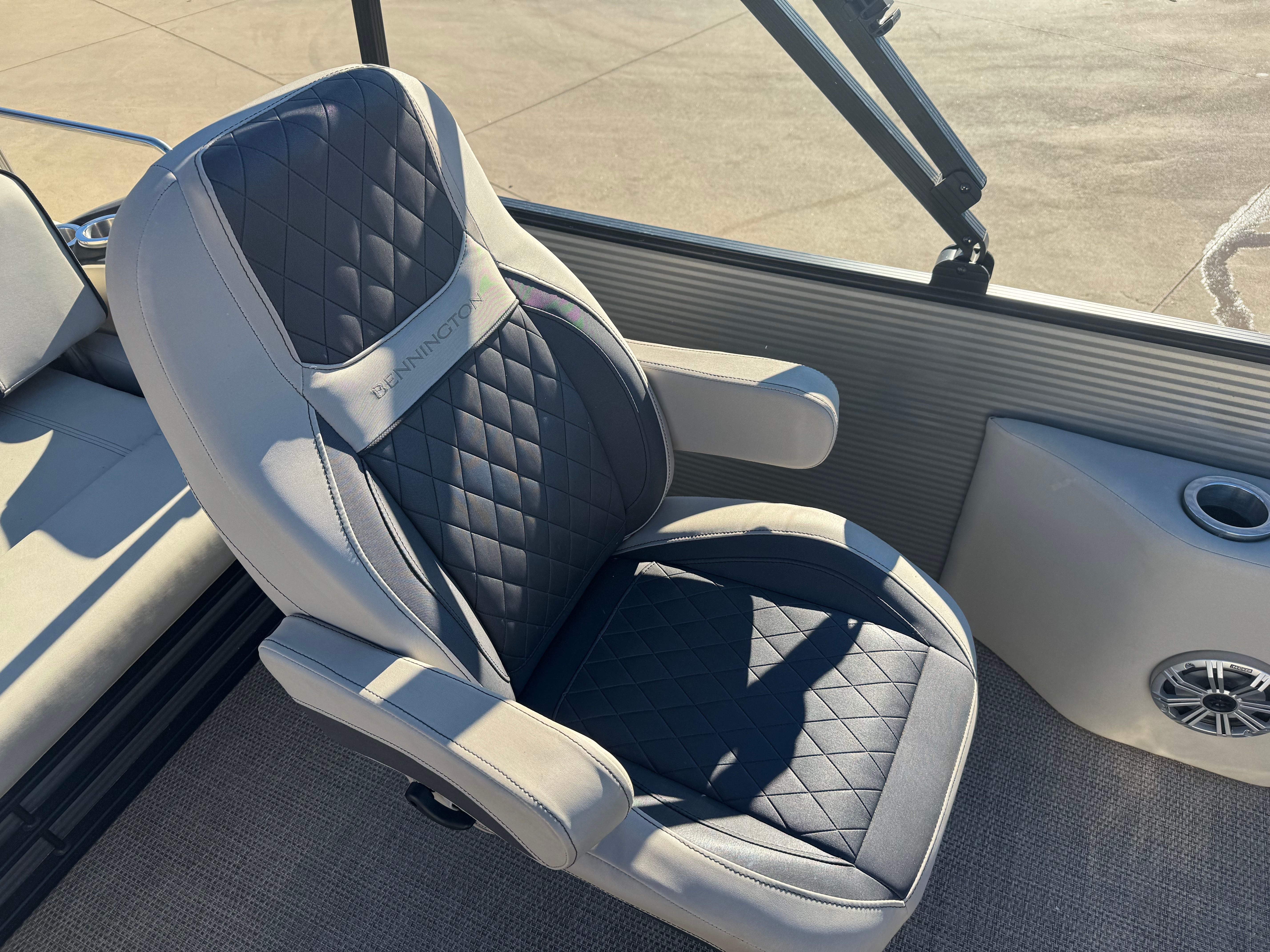 Bennington keeps the helm ergonomic and driver-focused. Controls are intuitively placed, gauges are readable at a glance, and the steering feel is confidence-inspiring. The captain’s chair offers support for longer cruises and adjusts to give a commanding view forward. The helm layout is modern without being cluttered, and there’s sensible storage for small items like sunglasses, phones, and charts. If equipped with optional electronics, the helm can host navigation and fishfinder units, elevating the SX23’s functionality for anglers and explorers alike.