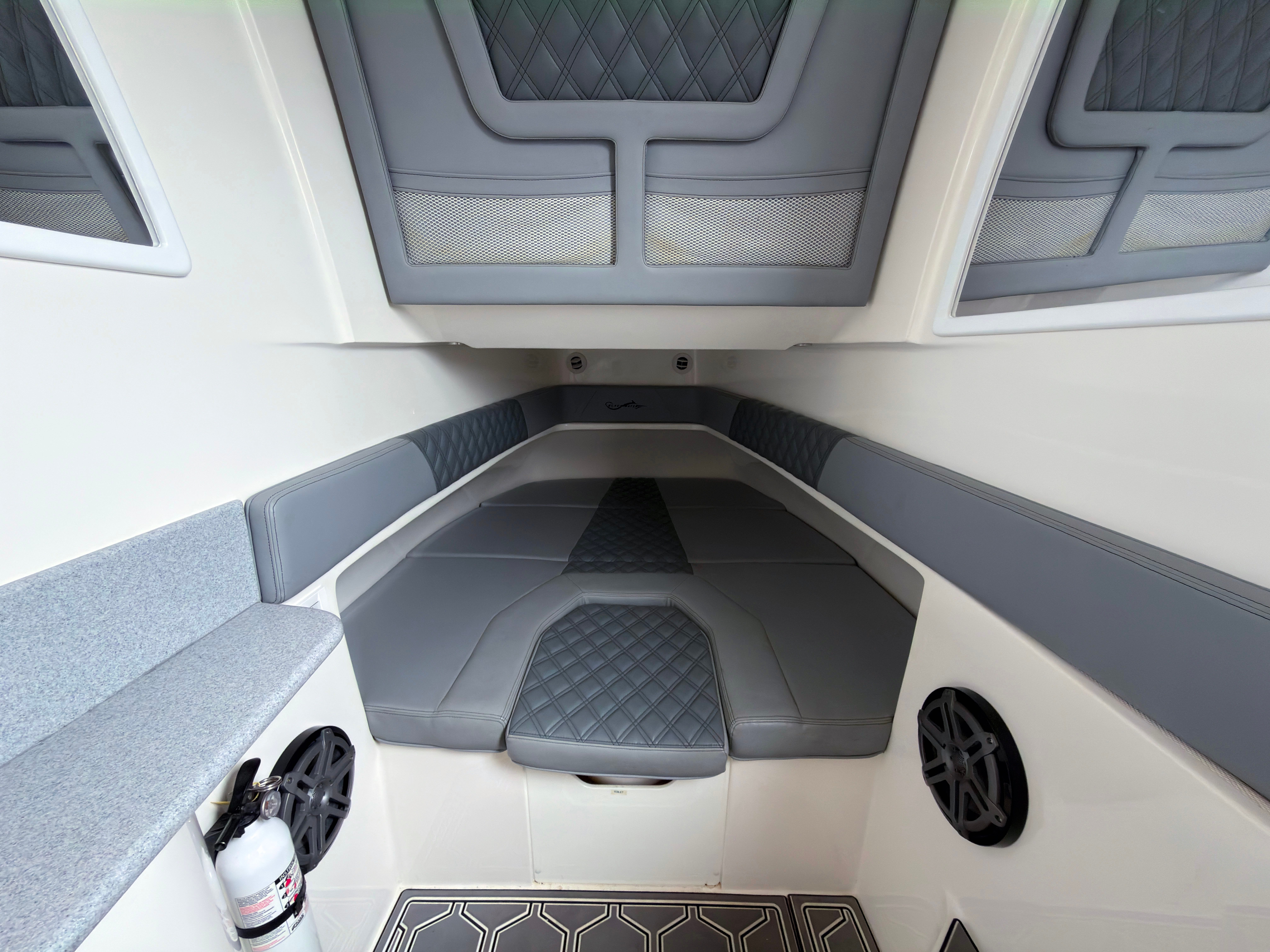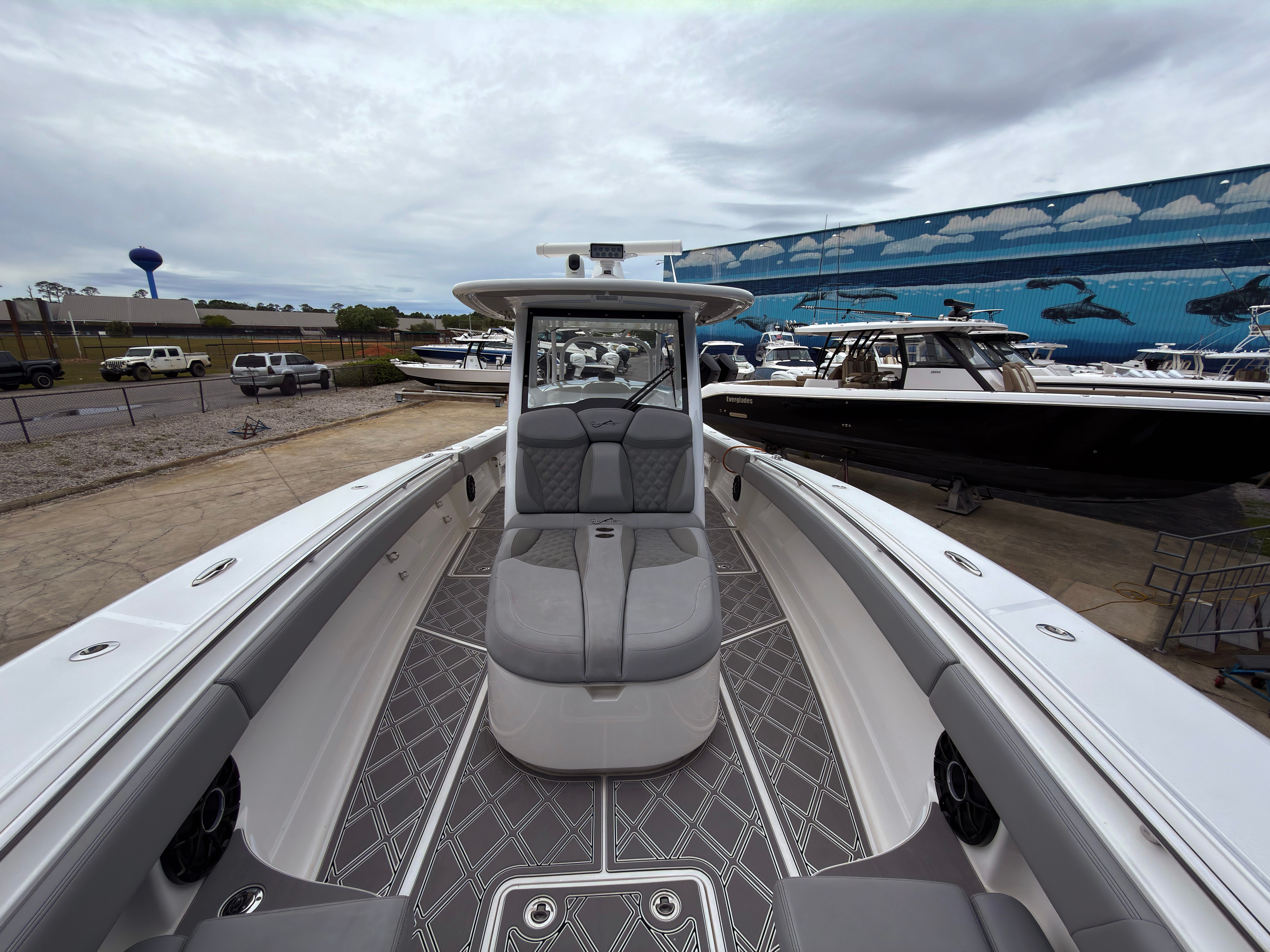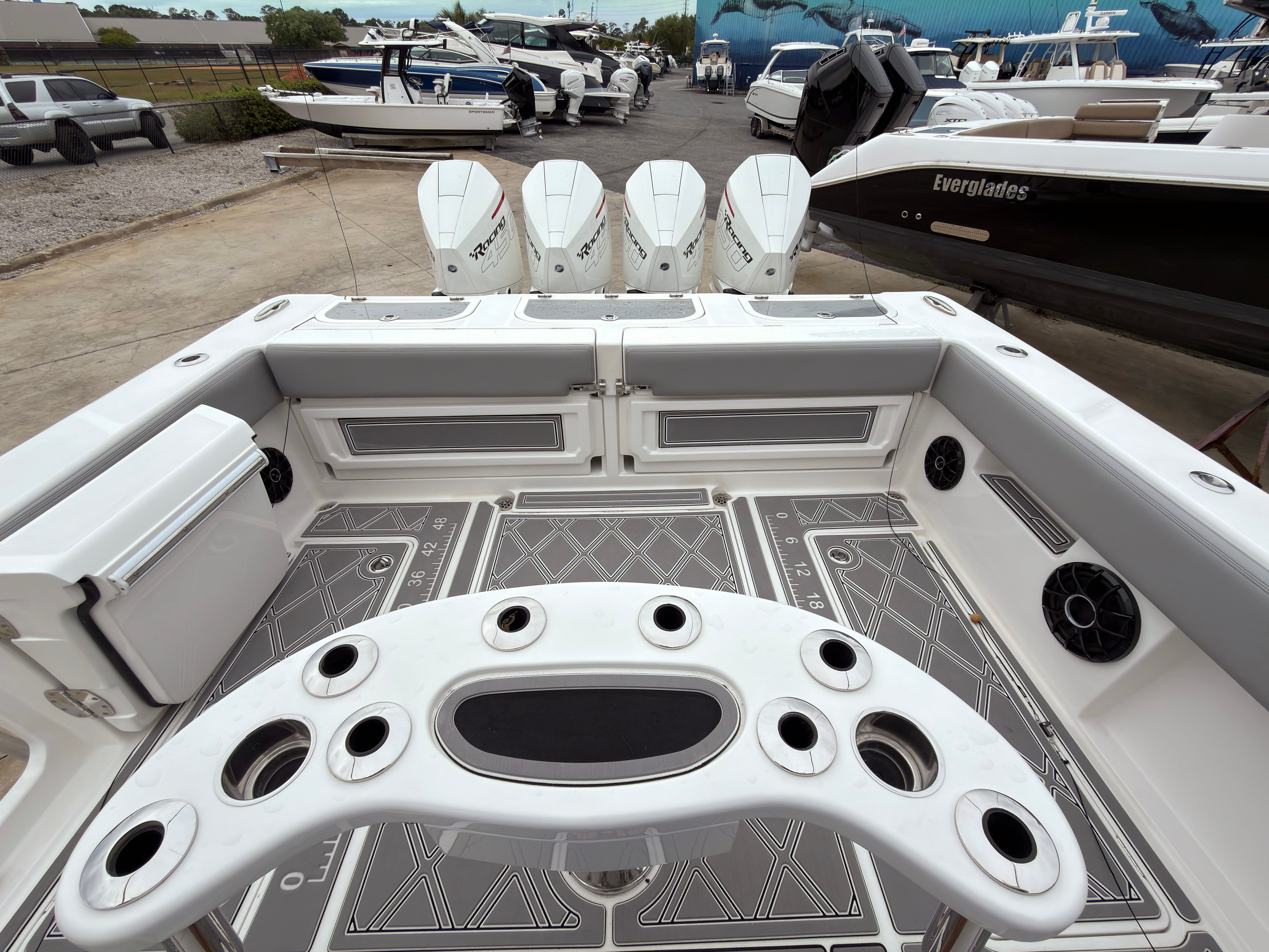The professionally completed repower with quad Mercury 450Rs gives this boat a major advantage for the next owner. The updated power package brings modern performance, strong acceleration, and the reliability and appeal that buyers are looking for in today’s market. The white 450Rs pair perfectly with the boat’s clean profile and give the transom an unmistakable custom look.