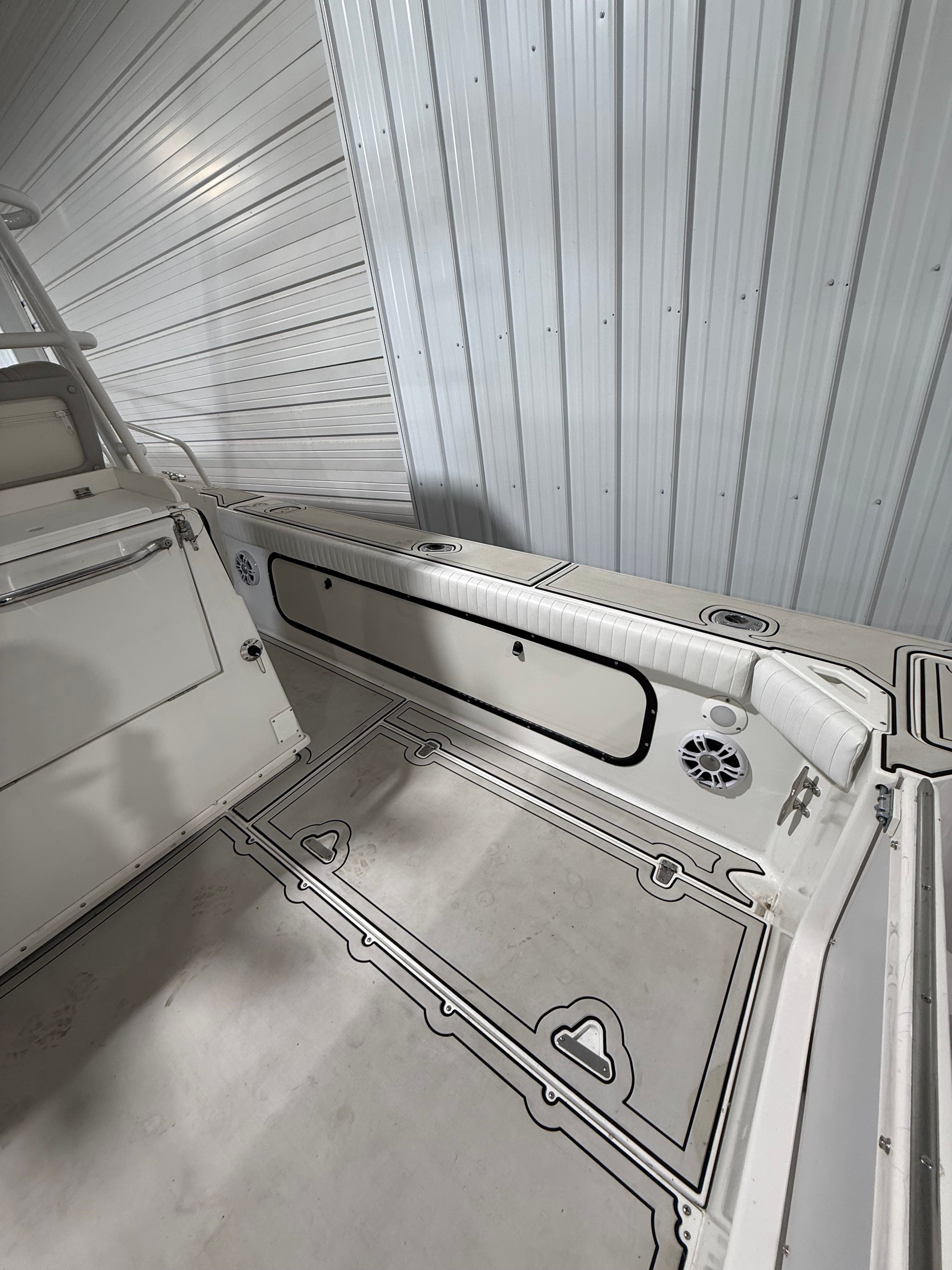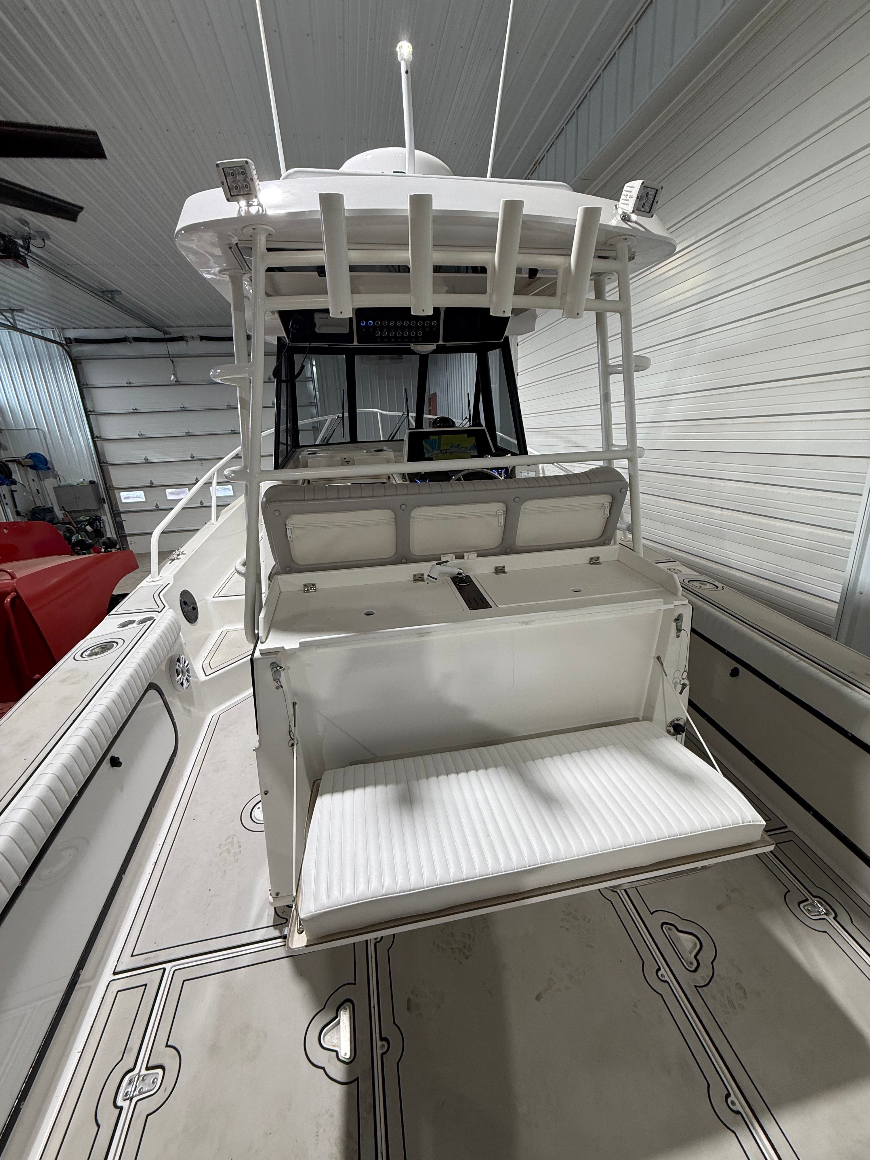 This center console boat for sale is as practical as it is enjoyable. The generous cockpit storage keeps your gear, tackle, and personal items organized and out of the way, while the wet bar and seating arrangements make entertaining effortless. The boat’s size and layout are ideal for easy docking and maneuvering, whether you are pulling into a busy marina or anchoring at your favorite secluded cove.Fuel efficiency is enhanced by the modern twin-engine setup, allowing you to cover more water without frequent stops at the fuel dock. The four-battery system ensures you have the power needed for extended trips, running electronics, and keeping your onboard amenities operational. The depth sounder and compass provide essential navigation tools, making every journey safer and more enjoyable.