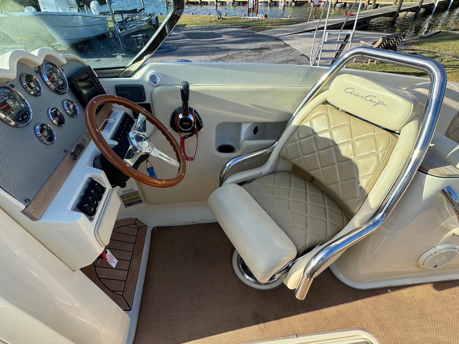 The Chris-Craft 25 Launch is designed with both luxury and functionality in mind. Its spacious bow seating area invites relaxation, while the thoughtfully arranged cockpit ensures that every passenger enjoys comfort and convenience. The high-quality materials used throughout the boat, including premium upholstery and polished wood accents, create an inviting atmosphere that is both stylish and durable. The ergonomic helm provides intuitive control, allowing the captain to navigate with confidence and ease. Every detail, from the stainless steel hardware to the elegant dashboard, reflects Chris-Craft’s commitment to excellence.